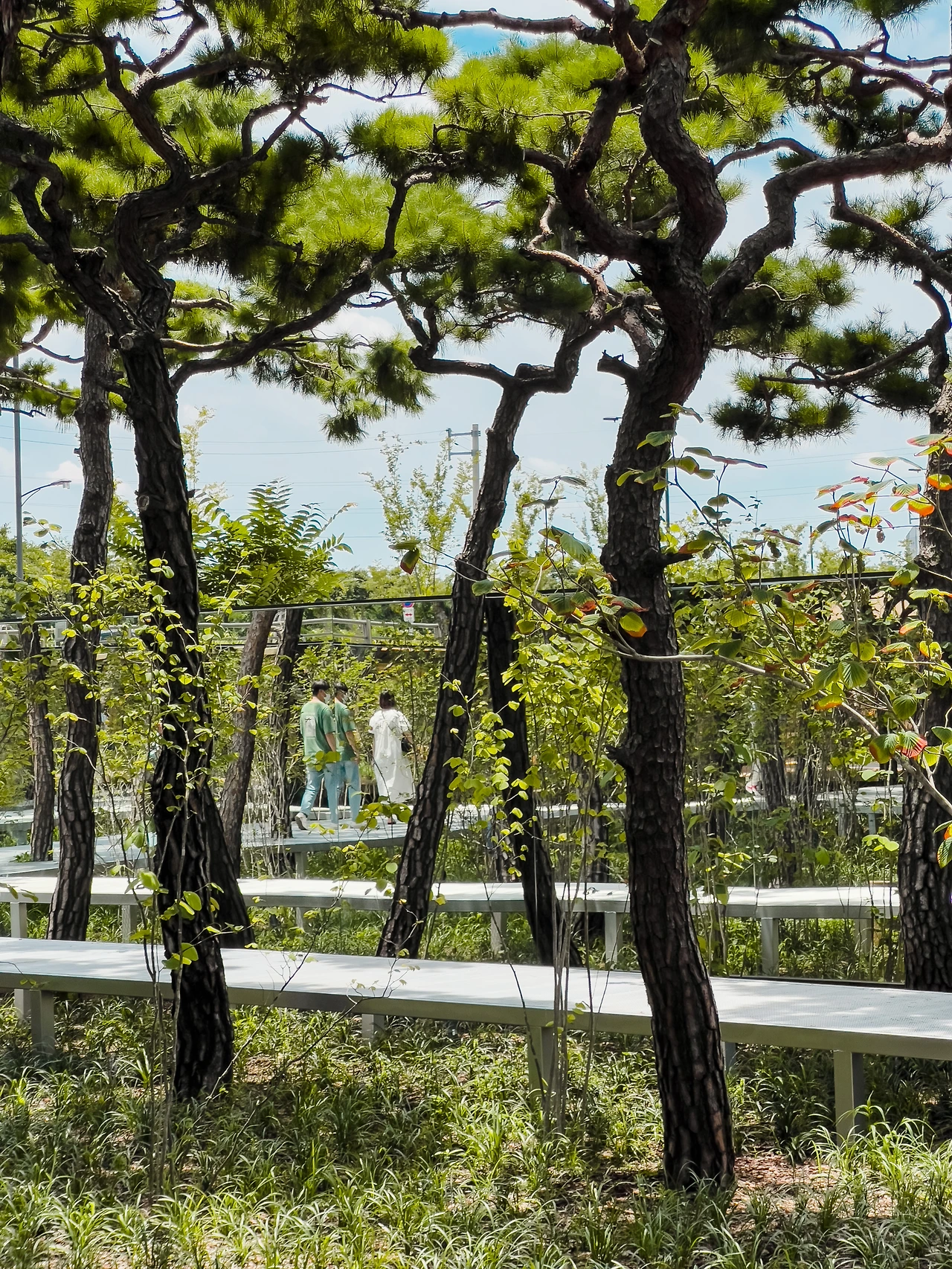 마지막으로 소나무 정원은 여러 번 교차하는 선들이 만들어낸 동선으로 소나무 사이사이를 누빌 수 있게 한다. 담장은 거울로 마감하여 시각적으로 공간을 넓어 보이게 하여 소나무와 확장된 공간이 만나 이곳을 몽환적인 이상 세계로 탈바꿈시켜준다. 이리저리 돌아다니다 마주하는 시골 창고는 언제 어디서나 자연을 마주할 수 있었던 우리네 원시적인 모습을 떠올리게 하고 현재 사회가 직면한 문제의 현 좌표를 찍어준다.