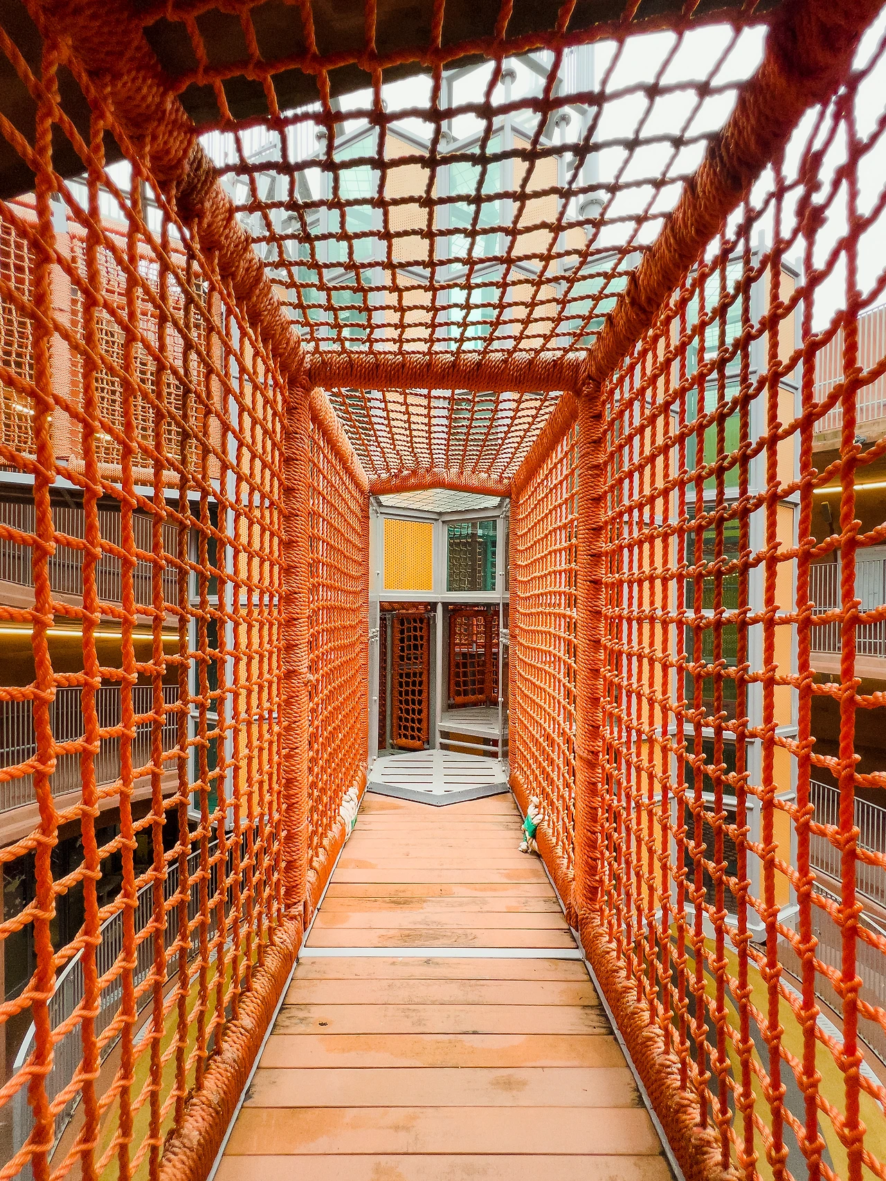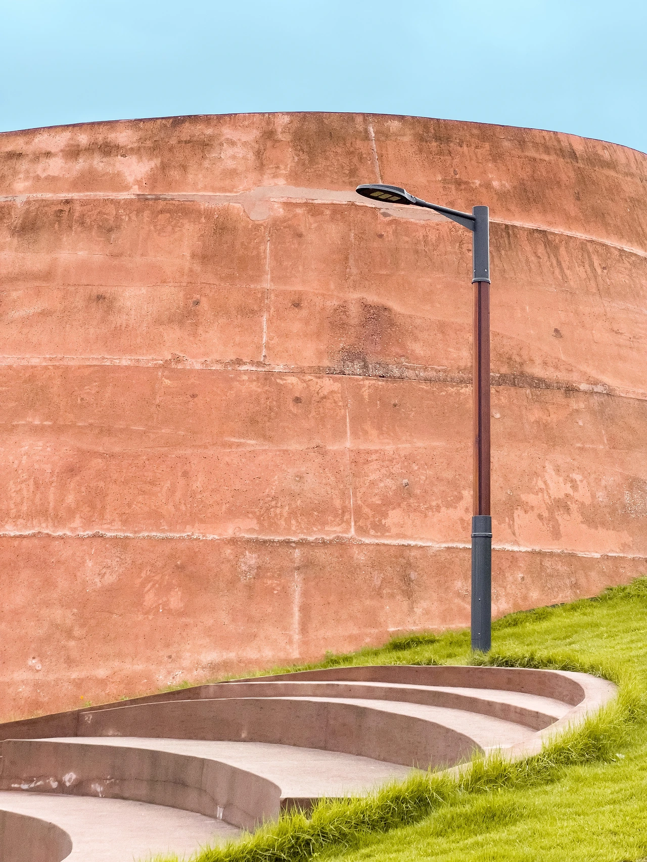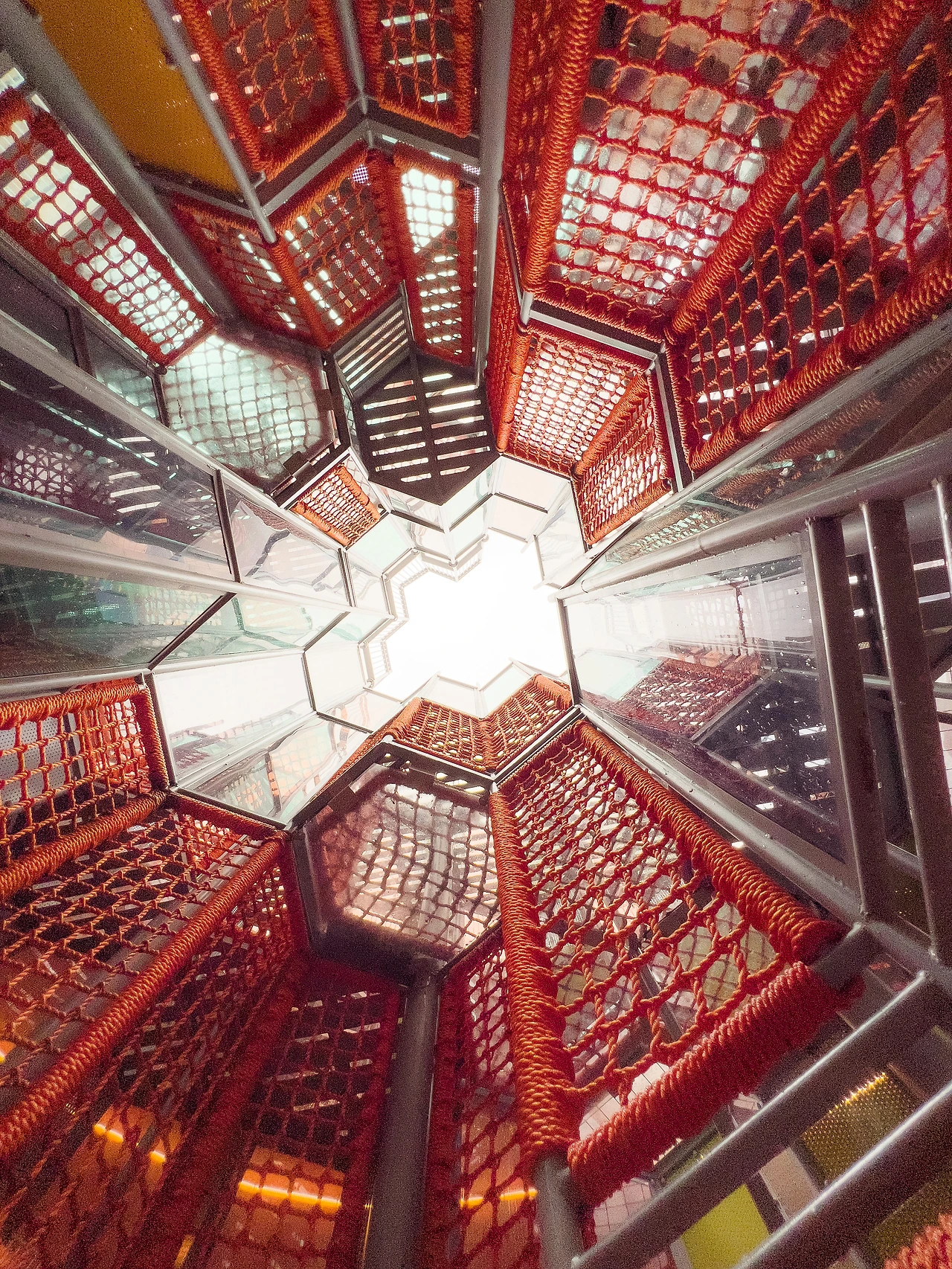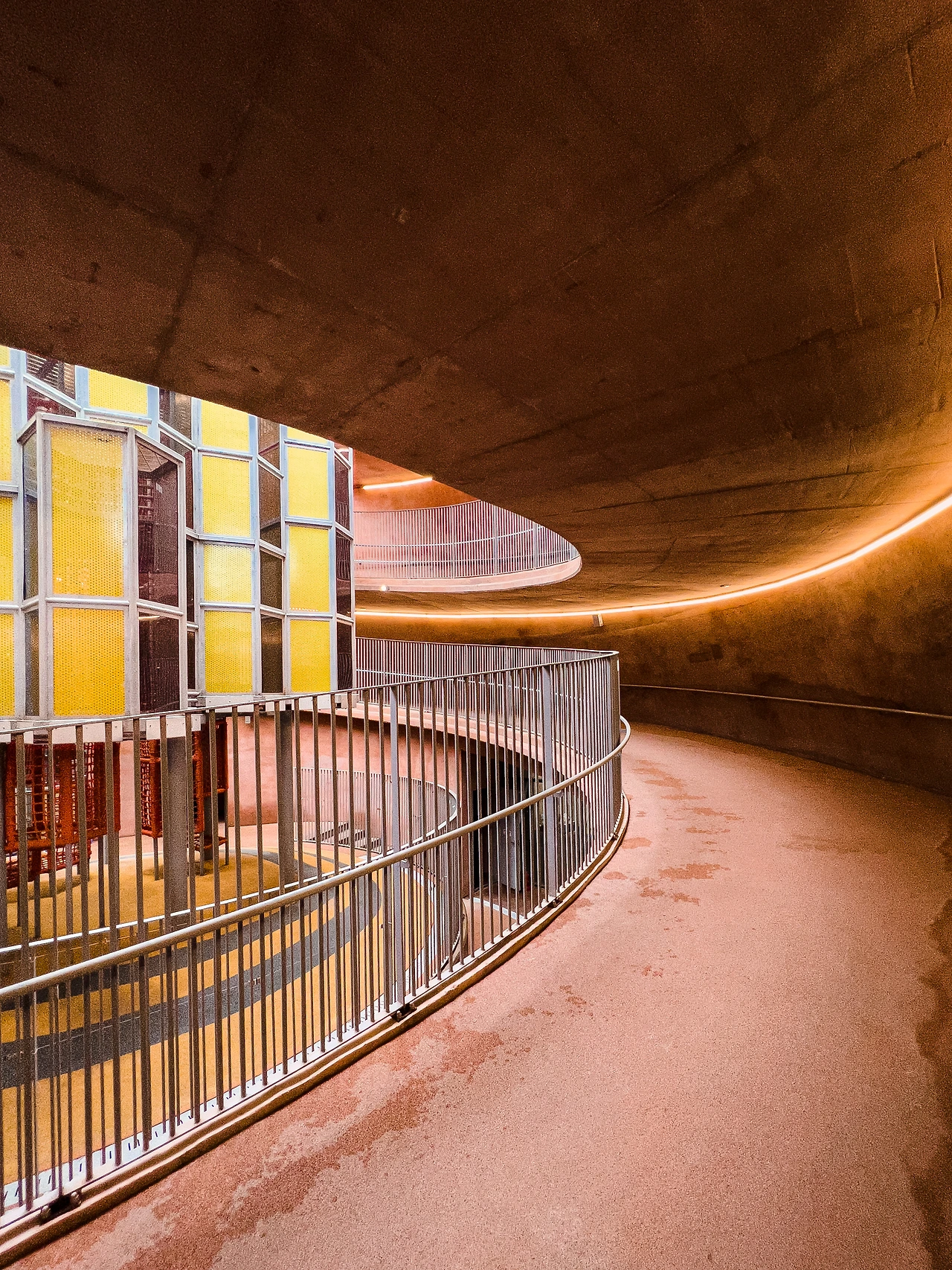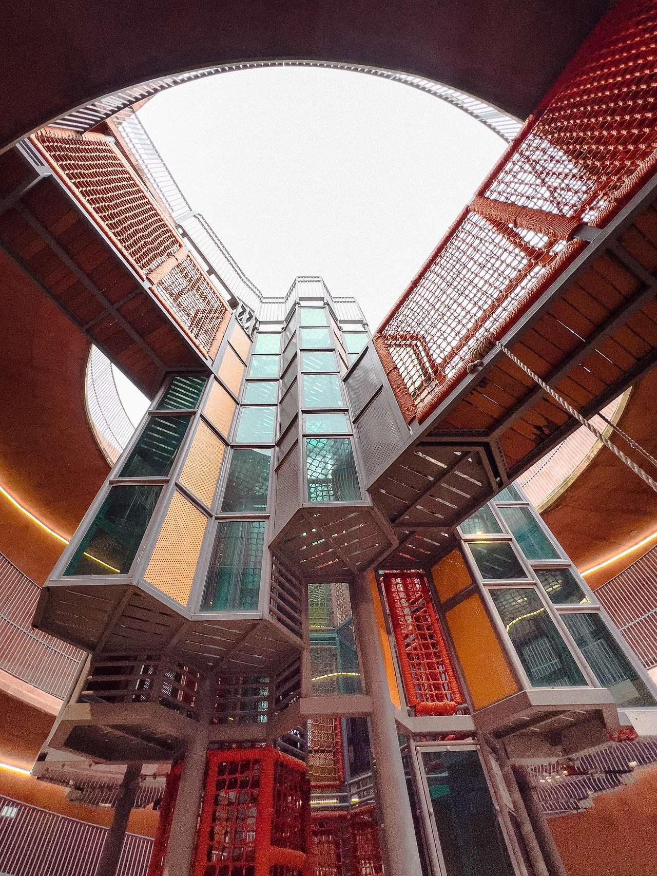 우주선 같기도 하고 화산 같기도 한 놀이터 안에는 9m가 넘는 정글짐이 자리한다. 아이들이 탐험가의 기질을 뽐내기에 충분하고 정글짐을 휘감고 올라가는 경사로의 끝은 전망대가 되어, 어른들도 즐길 수 있는 열린 공간이다. 밖으로 난 창 하나 없이 건물 꼭대기만 열려 있기 때문에, 무대 조명처럼 정글짐만 환하게 빛난다. 경사로는 자연스레 암흑 공간이 되고 그 깊이도 깊어 흑과 백의 대비는 더욱 선명하다.