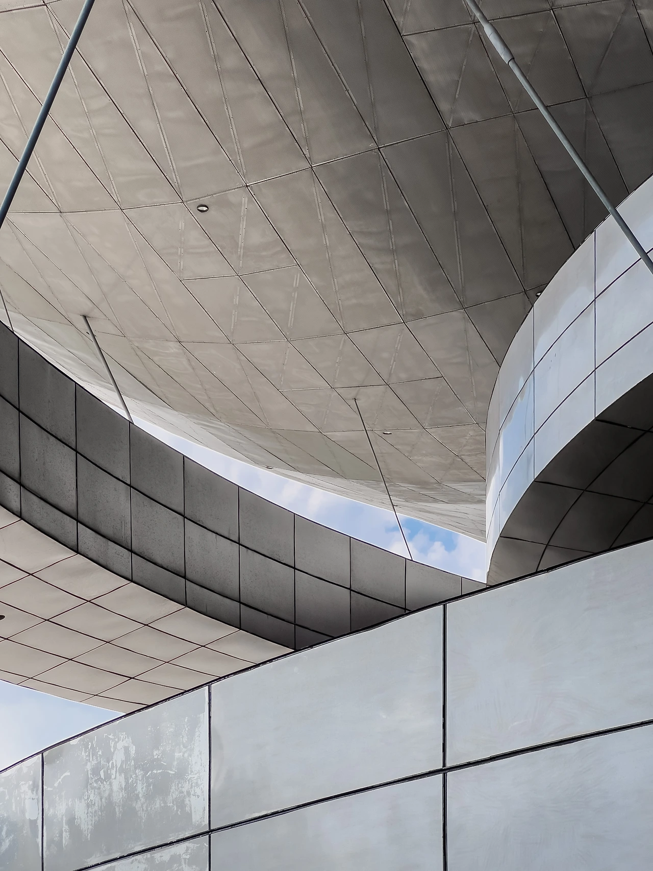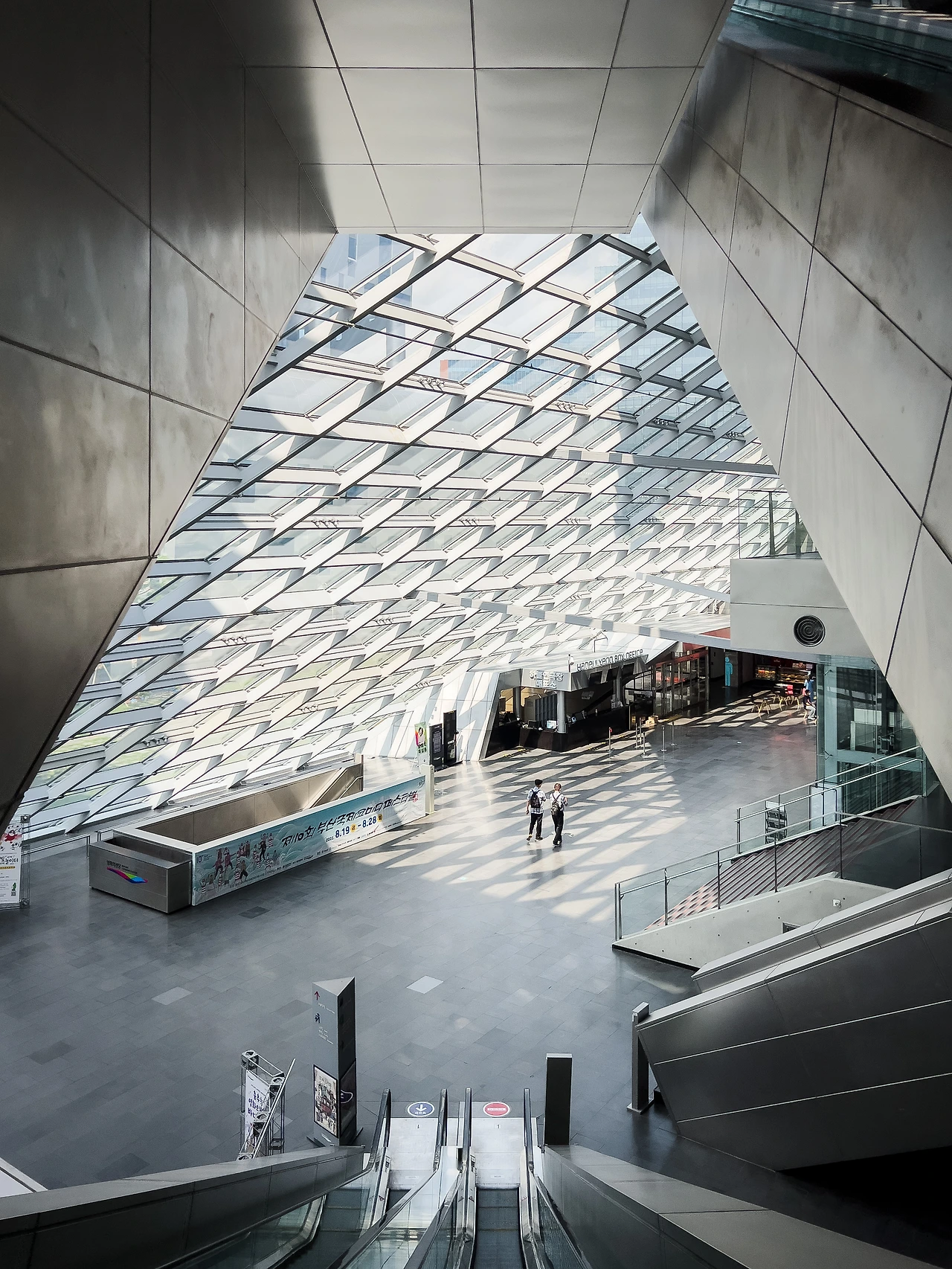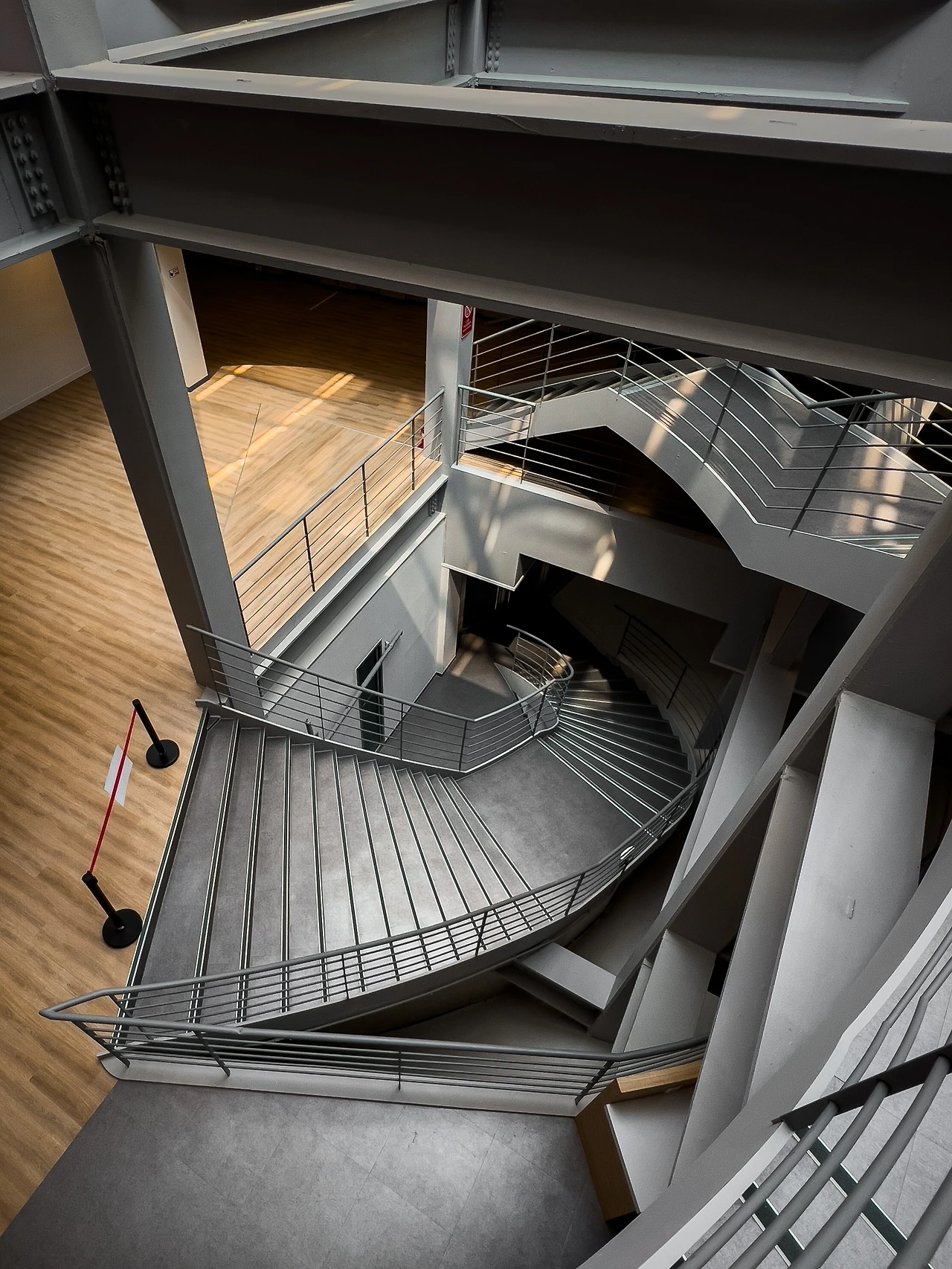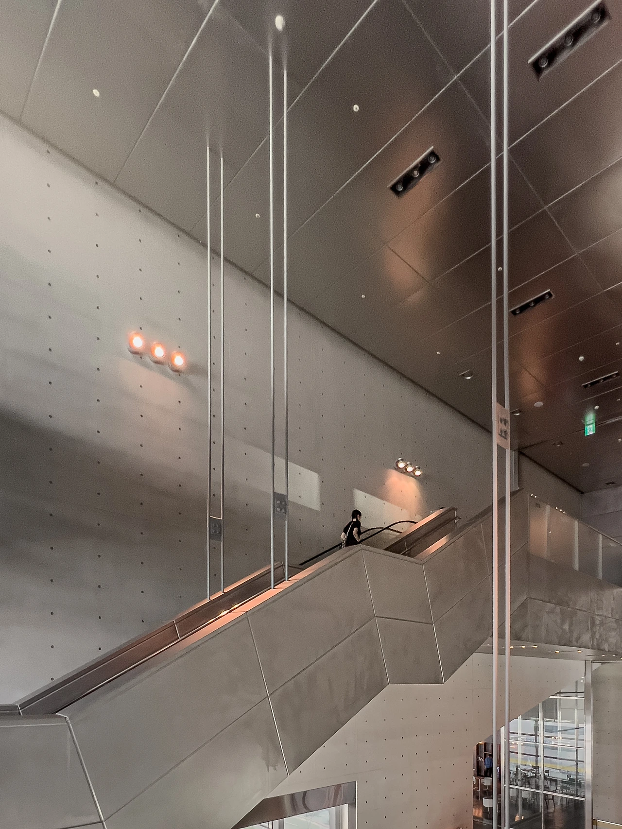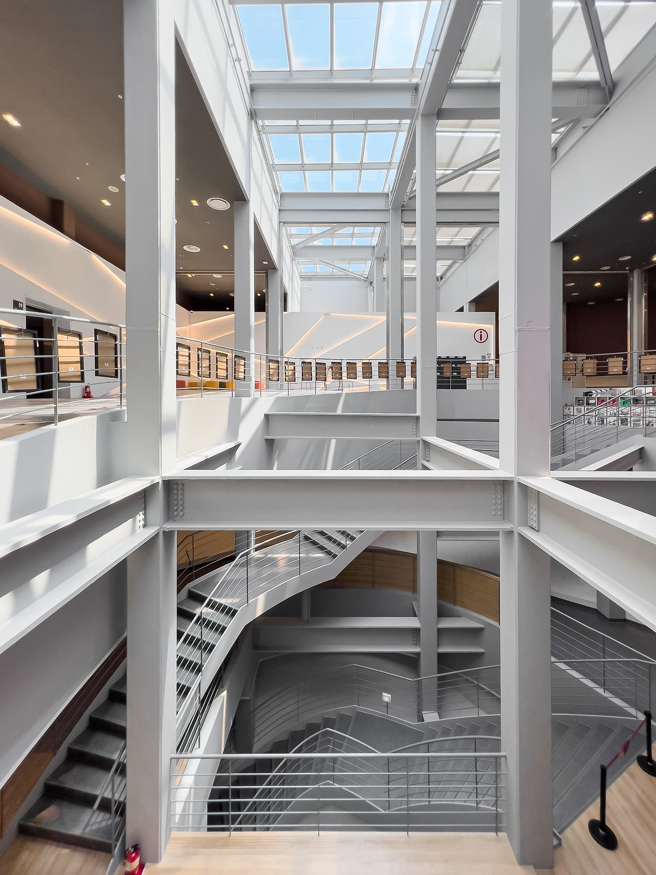 건물에서 가장 눈에 띄는 부분은 ‘더블 콘’이다. 아이스크림콘 2개를 겹쳐 놓은 형태는 사람들이 맨 처음 마주하게 되는 모습이자, 다른 곳에서 뻗어 나오는 구름다리가 수렴하는 공간이기도 하며, 엘리베이터와 계단이 있는 코어 부분이기도 하다. 여기에 큰 지붕을 떠받치는 구조물 역할도 하니, 더블 콘은 이곳에서 핵심 공간이다.