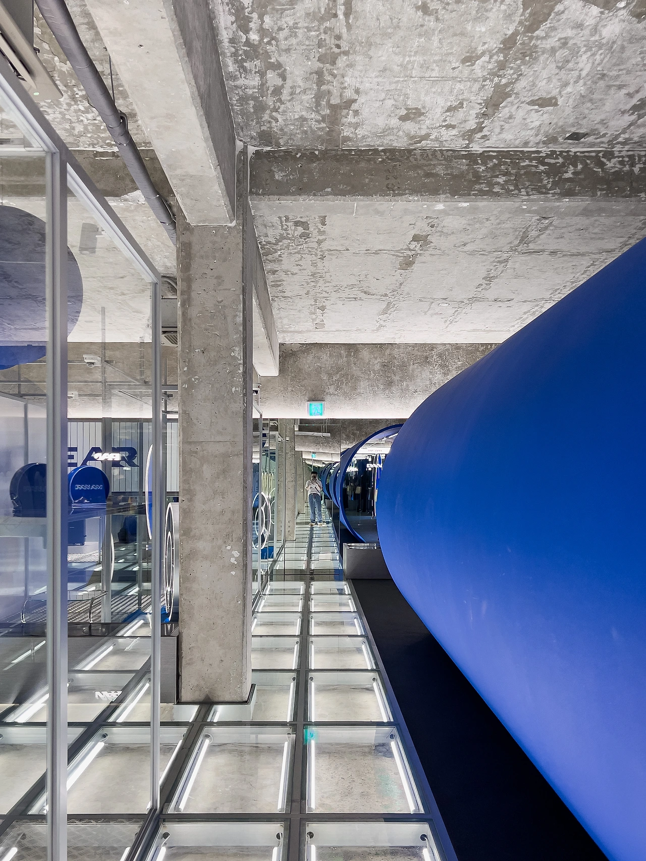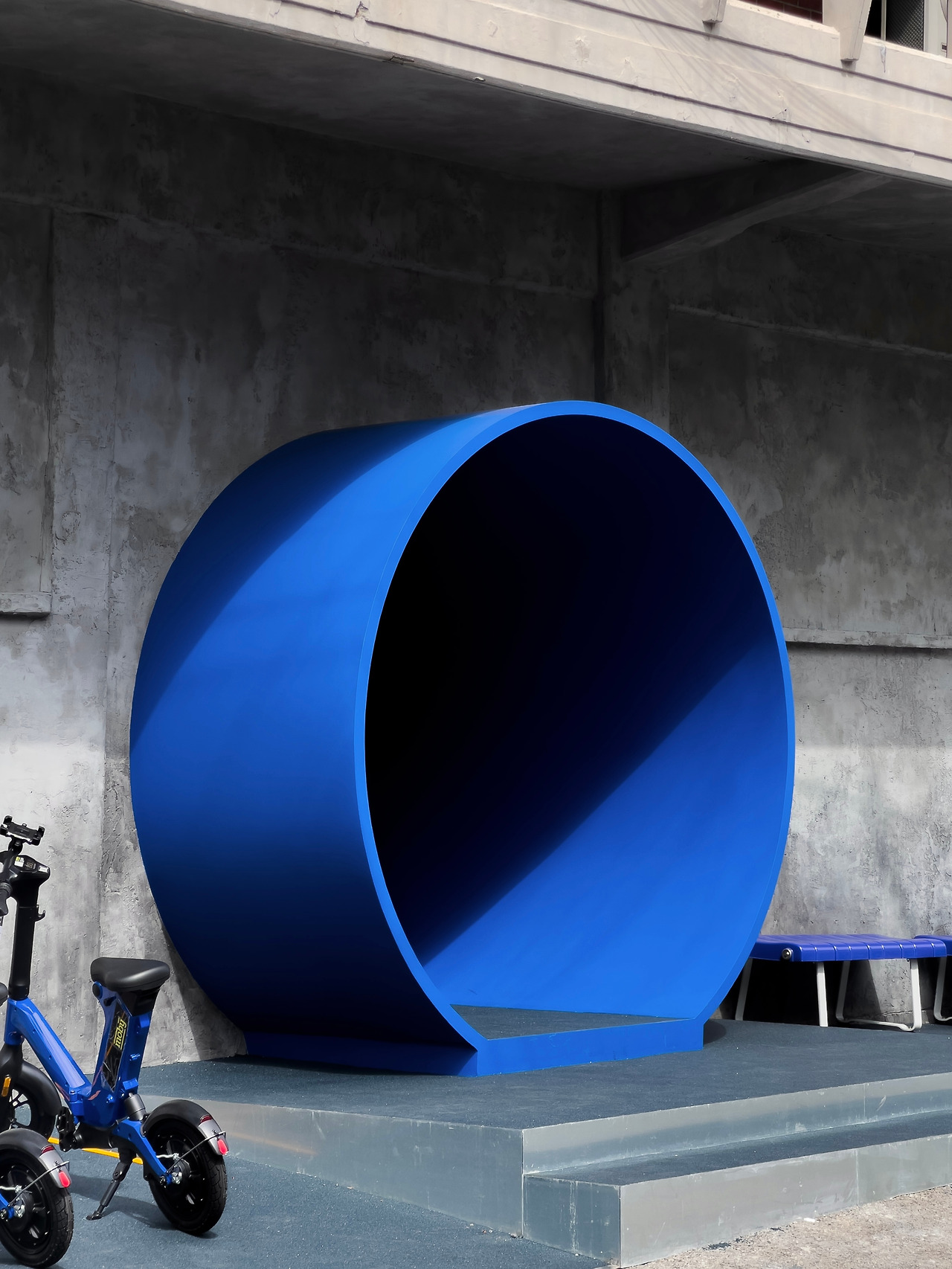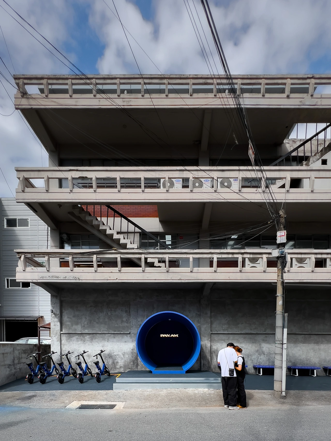 최근 들어 성수동에 사람들의 관심을 한몸에 받는 ‘팬암(PAN AM)’은 시작부터 느낌이 좋다. 한국 근대 건축을 보여주는 주택 건물 1층에 파란 원통관이 삽입되어있다. 창하나 없는 1층엔 입구와 파란색 킥보드, 파란 벤치만 있어, 궁금증을 자아낸다.