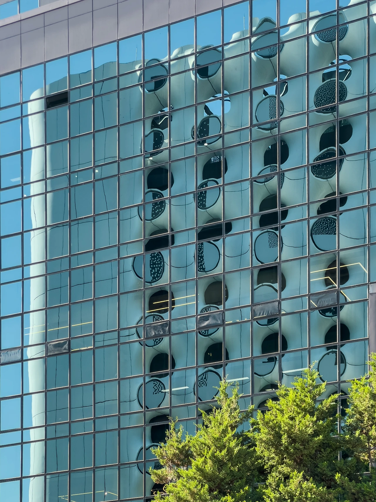하나은행 별관, ‘PLACE 1’은 안보다 밖이 더 흥미롭다. 3차원 형태의 원형 셀(cell)을 모아 전체 입면을 구성하여, 하나의 고정된 이미지로 각인 될 수 있는 평이한 건물 외관으로부터 탈피하려는 시도를 보여준다. 각각의 셀에는 다채로운 예술품으로 구성된 아트 디스크를 설치했고, 비로소 흥미롭게 변화하는 입면은 사람들의 시선을 사로잡기에 알맞다.