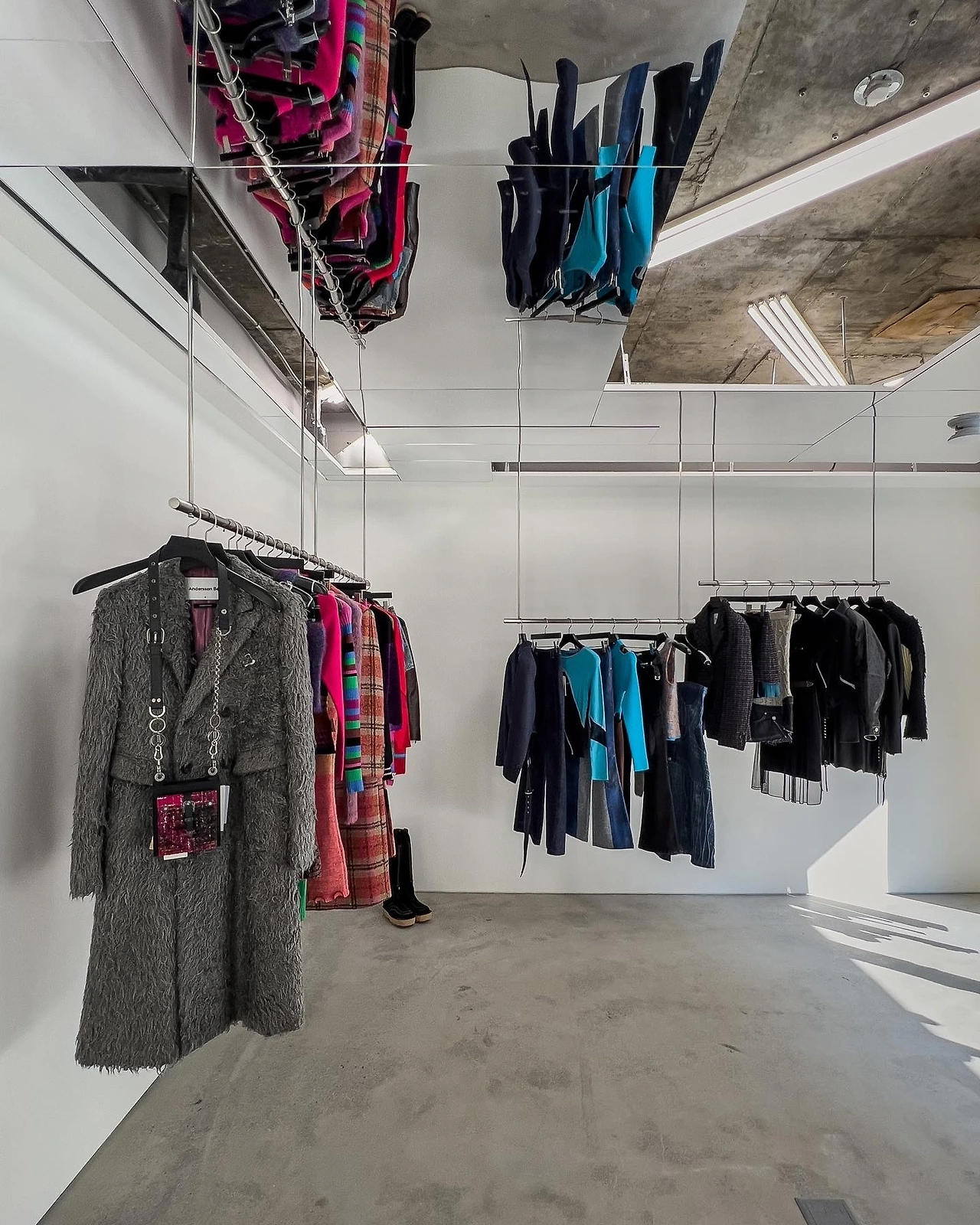 브랜드를 대표하는 공간인 플래그십 스토어는 브랜드의 개성이 곧 건물의 디자인을 결정하기에, 공간이 자리한 장소와 건물이 표현해내는 현대미는 이질적이지만 아름답다. 내부는 딱딱한 벽돌벽과 그렇지 않은 탄성 있는 소재로 마감된 천장, 그 속에 LED 조명이 각기 다른 색으로 공간을 비춰, 강렬하고 디테일 많은 옷을 부각시킨다.