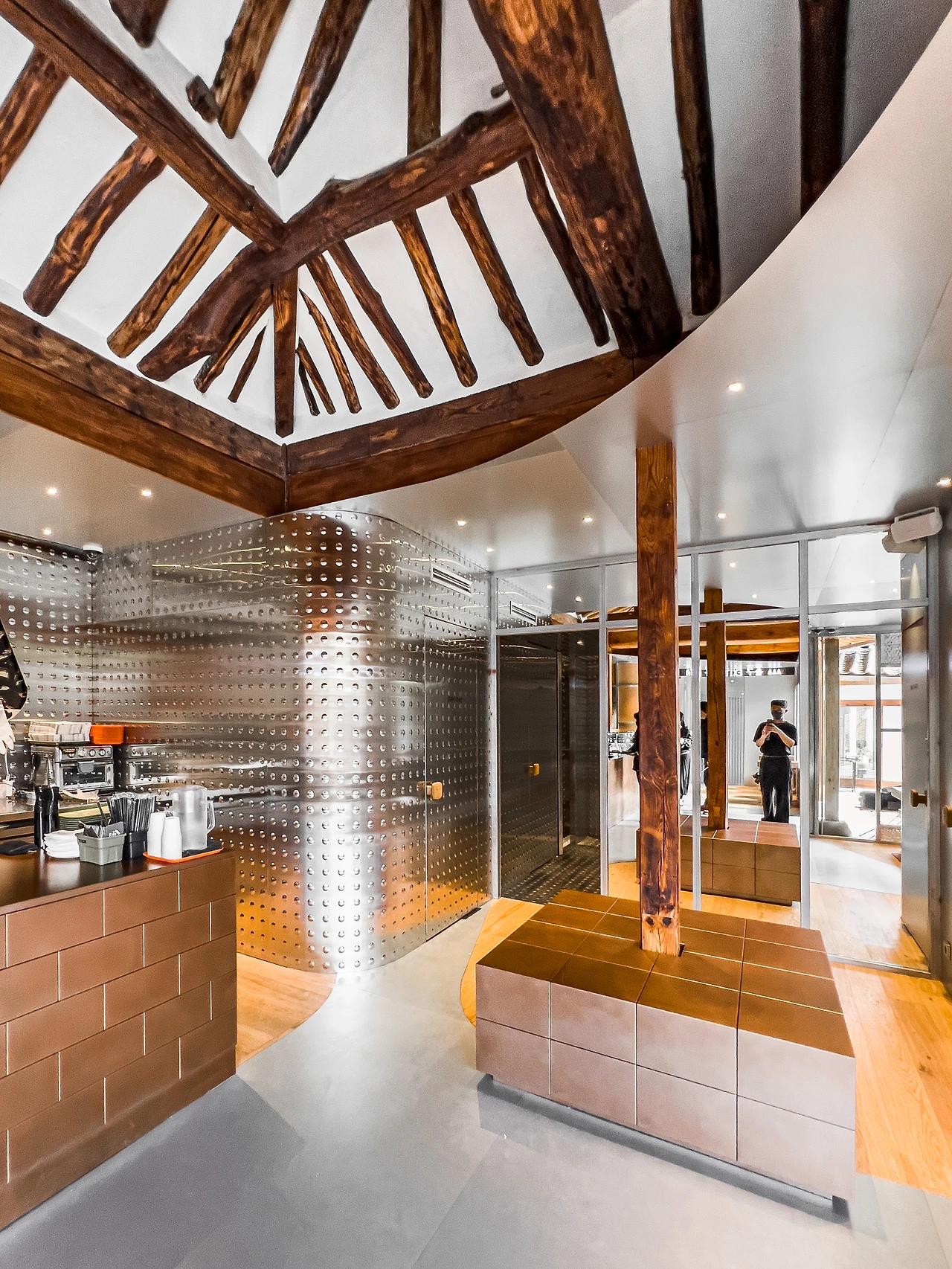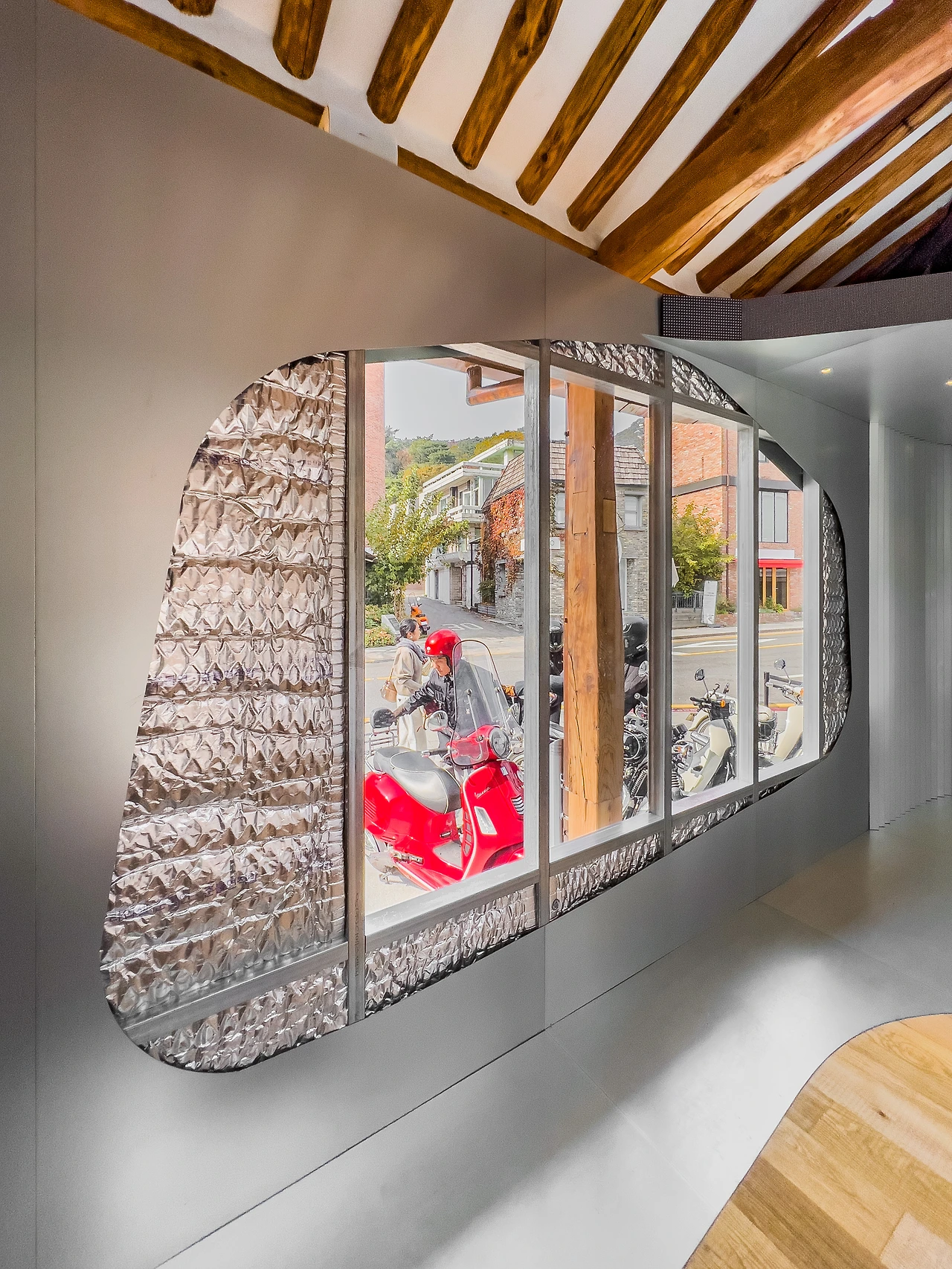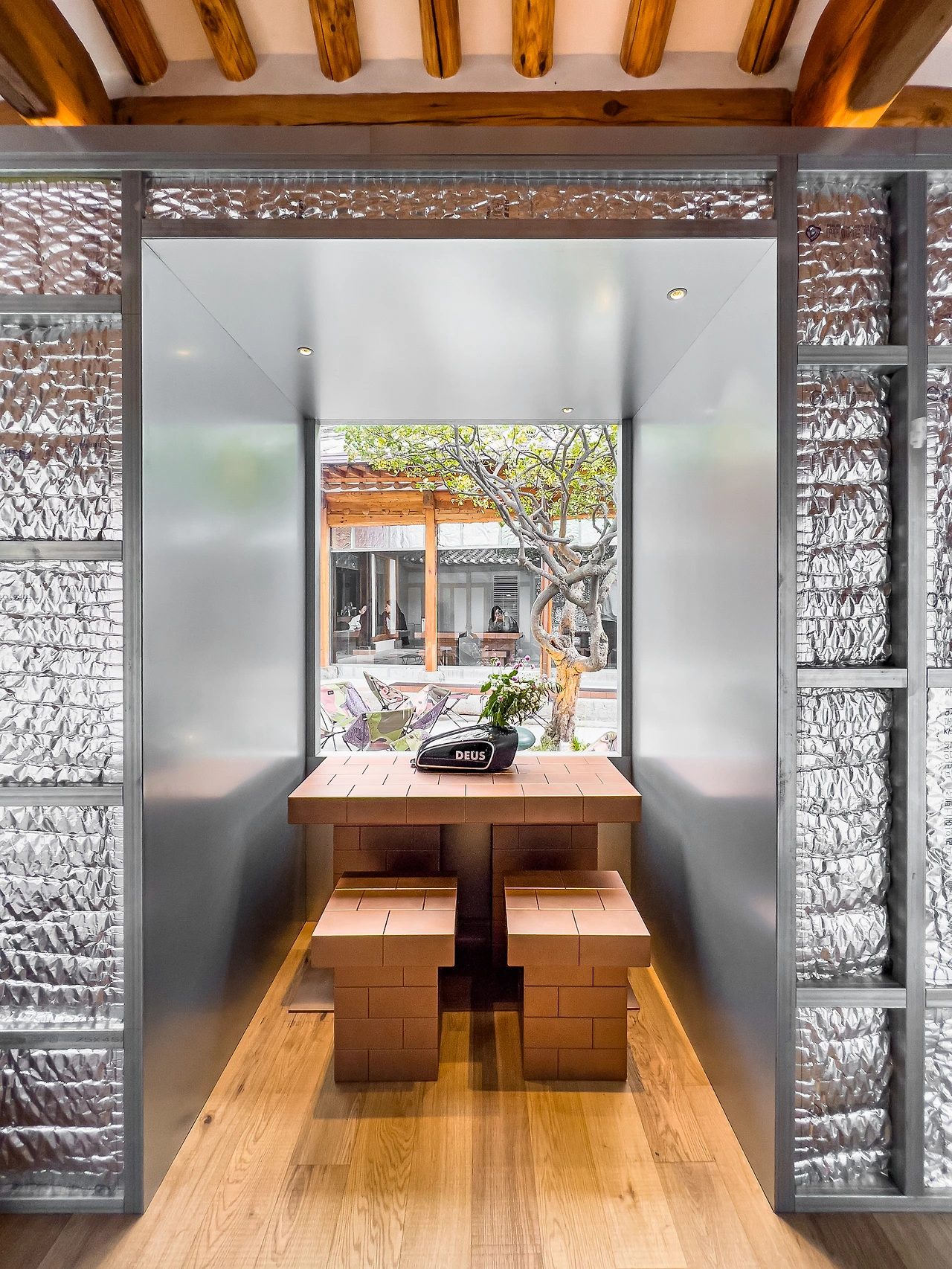 ‘The Old of New Custom’의 컨셉을 가지고 공간을 전개하는 데우스는 머리에 갓을 썼지만, 복식은 세련된 정장을 걸친 예사롭지 않은 양반의 모습을 보인다. 한옥의 기존 골격은 그대로 유지한 채, 현대 건축에서 사용되는 철제 강관과 빈틈을 채우는 단열용 우레탄폼, 반사형 단열재인 알루미늄박으로 내부를 장식했다. 따뜻함을 가진 목재와 차가움을 주는 스틸 계열의 재료가 서로 중화되고 빛을 반사하는 박이 내부를 환하게 밝히니, 공간의 분위기가 오묘하다.