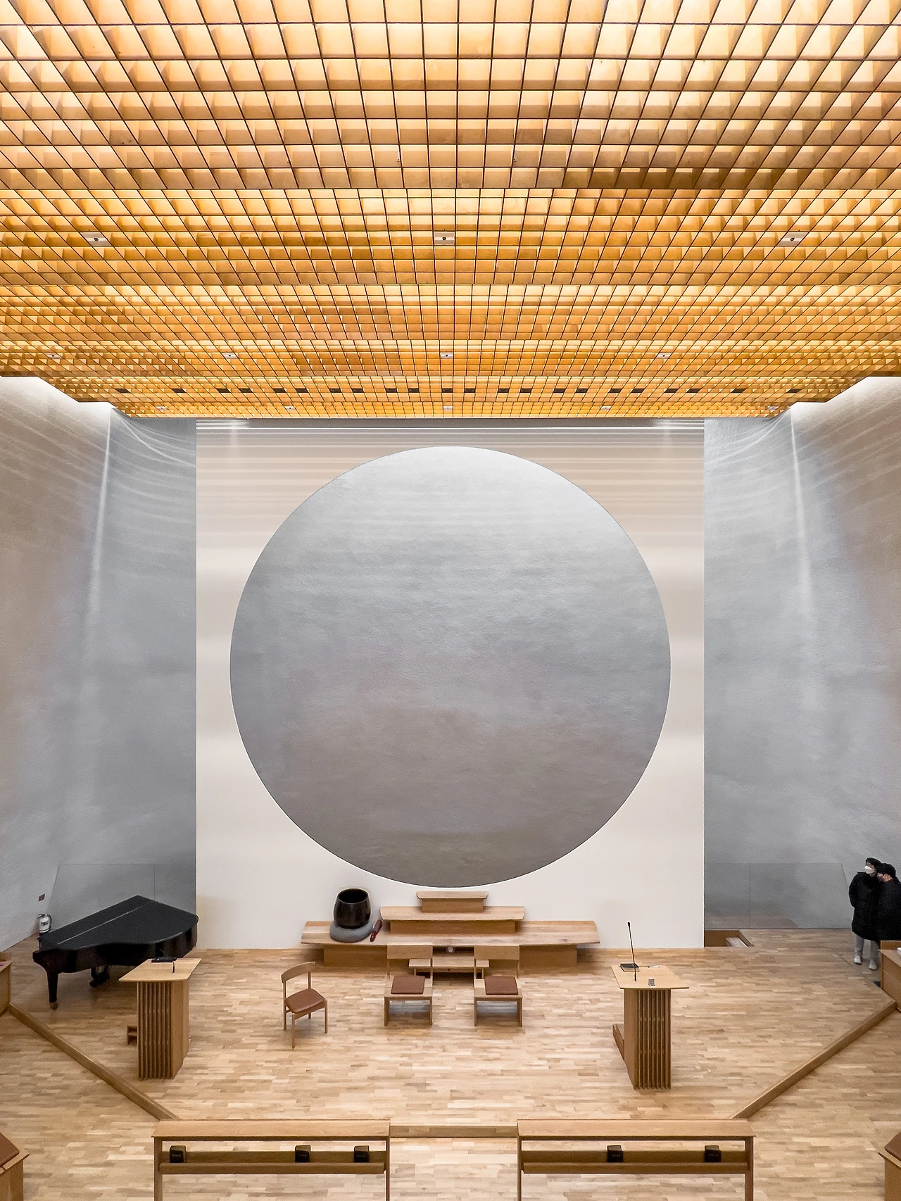 여래길 중간중간에 마련된 입구는 ‘대각전’으로 향하게 한다. 대각전은 원남교당의 메인 공간으로 일원상이 자리한다. 일원상은 원불교 신앙이며 수행 표본으로 우주와 만물의 근본을 뜻한다. 언제나 변하지 않는 일원상과 천창으로 들어오는 자연광이 시시각각 변화하여 만들어내는 공간의 대비는 극적이다. 12미터 높이에 경험을 방해하는 기둥 하나 없으며, 조금씩 기울어진 콘크리트 벽은 일원상으로 수렴한다. 여기에 나무 바닥과 가구에서 풍겨오는 나무 내음이 몸을 감싸 편안하게 하니, 잡생각을 떨치고 일원상에 집중하게 하여 자신을 성찰하게 한다.