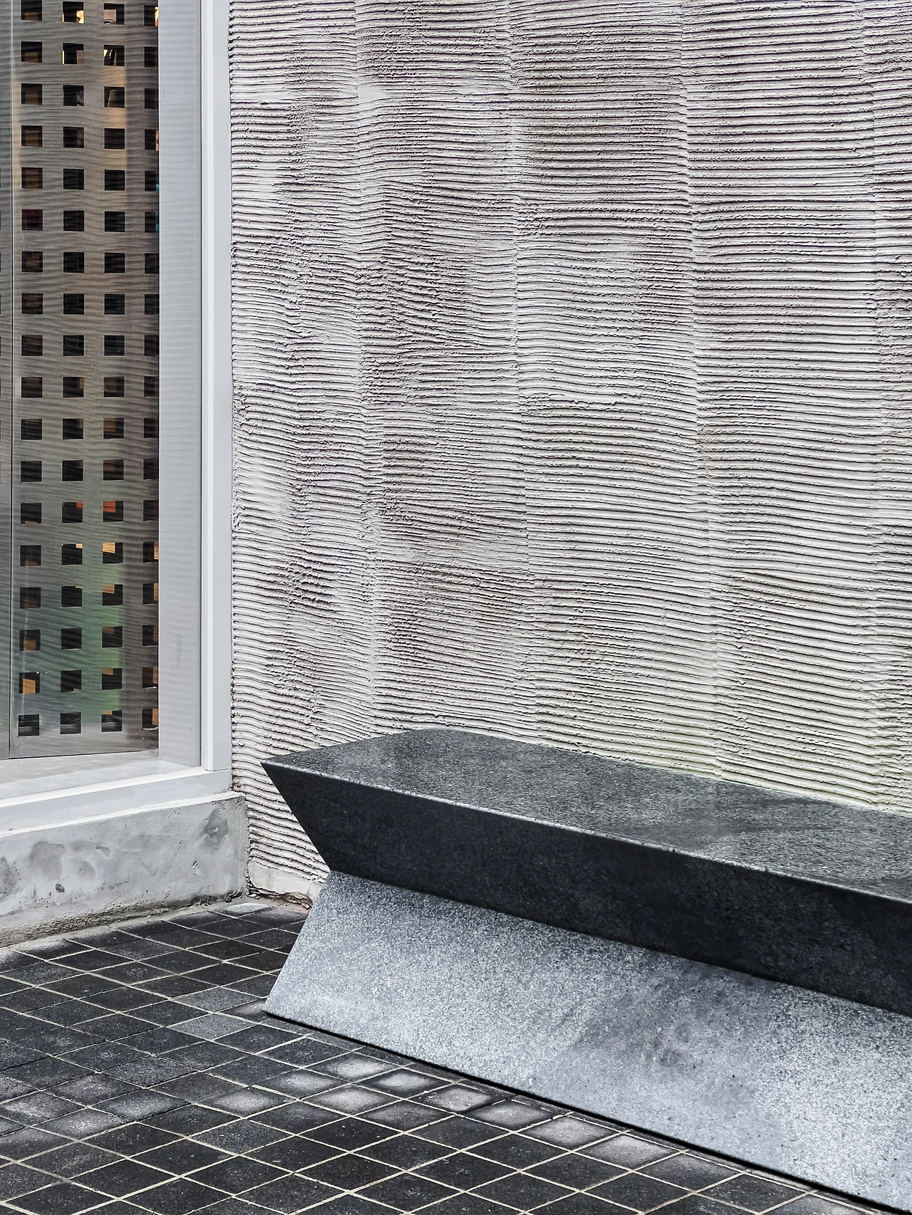 타일을 붙일 때 접착제로 사용하는 모르타르를 외벽에 발라 패턴을 만드는가 하면, 내부를 구성하는 철제 타공판이 탈의실을 만들면서 동시에 옥상까지 이어져 건물에 또 다른 형태를 추가했다. 바닥과 벽은 콘크리트에 금속을 삽입하고 갈아내어 일체화된 면을 만들어 형태, 재료, 디테일을 통해 공간을 개성 있게 꾸민다.