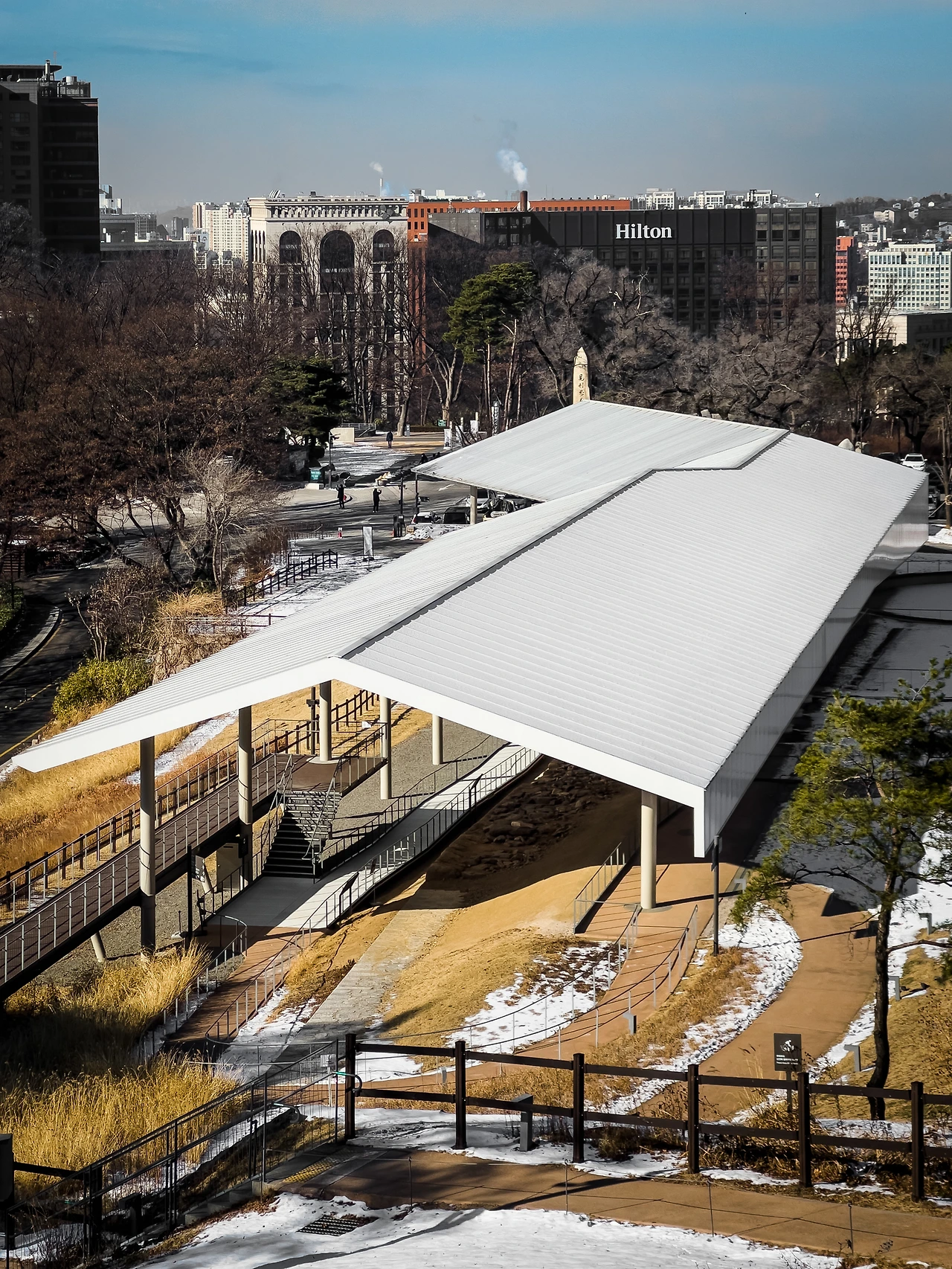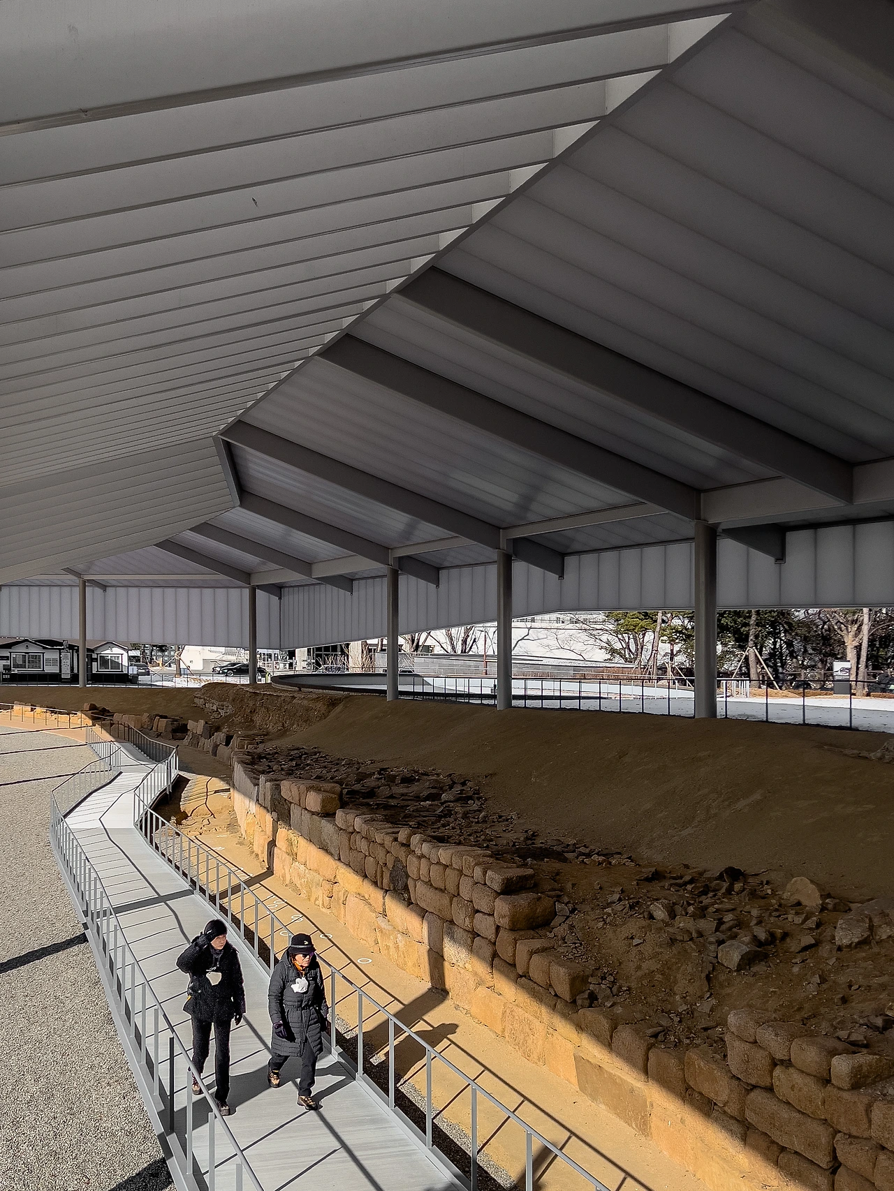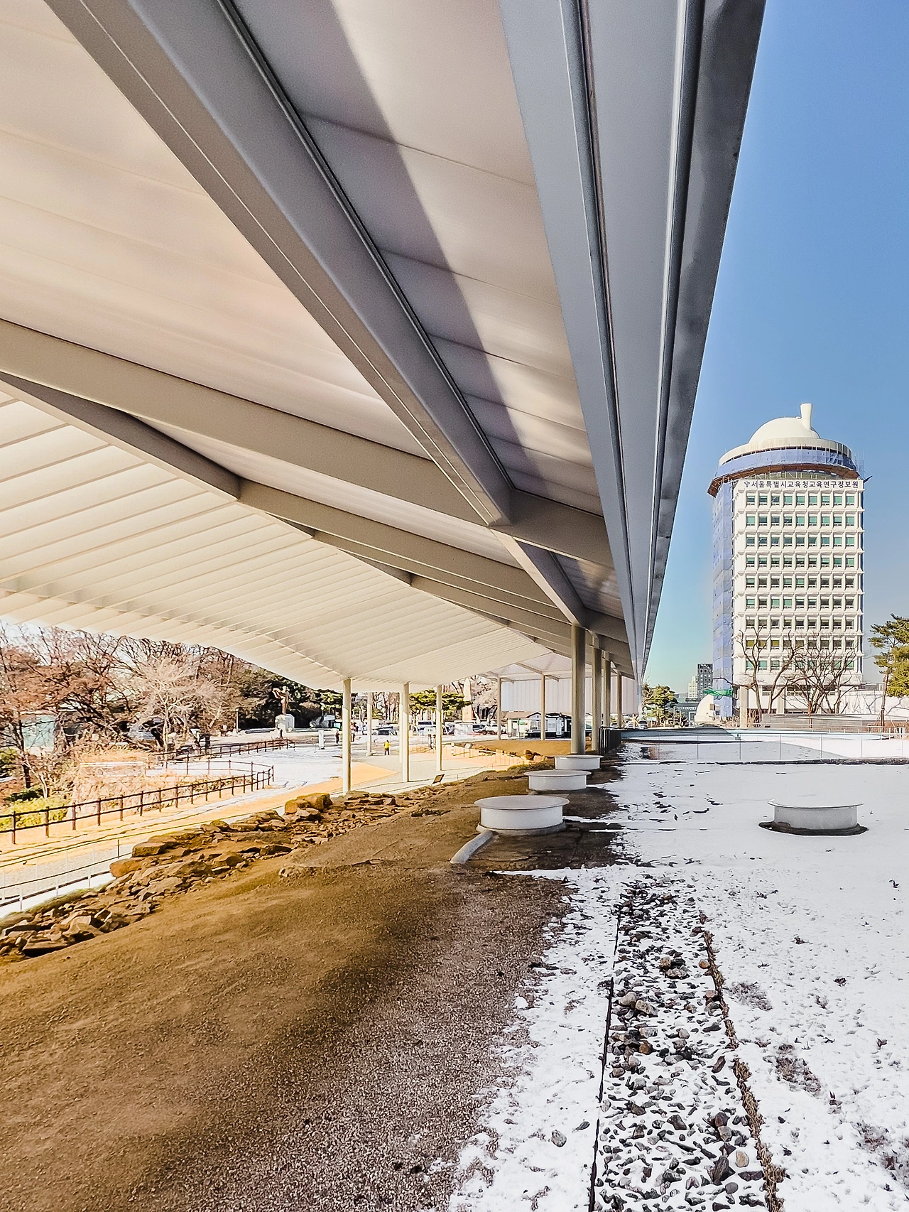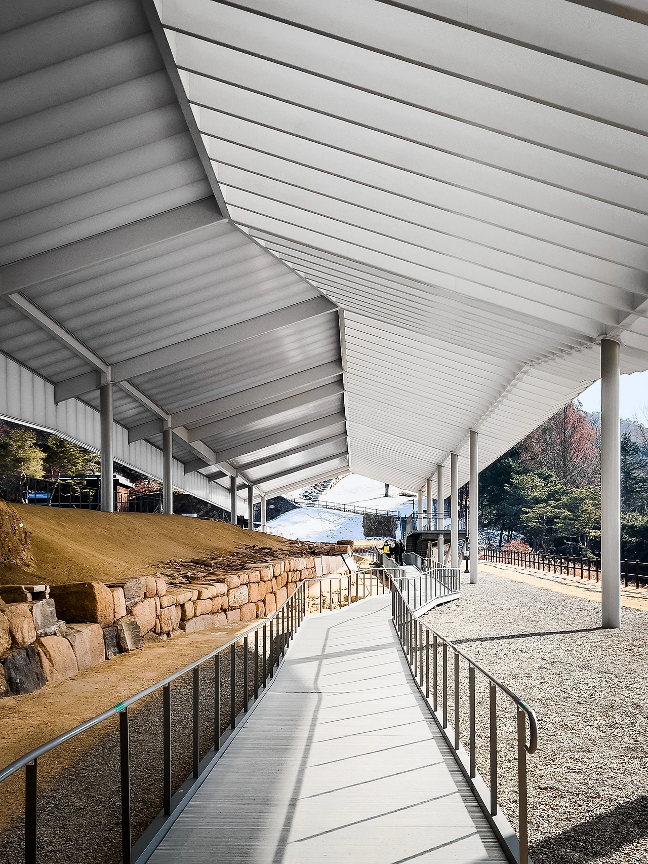 유적을 덮는 지붕은 도성을 따라 꺾이며 그 색은 백색으로 마감되어 한눈에 띈다. 비만 막아줄 뿐, 별다른 기능이 없어 보이는 지붕이지만, 외부공간과 구분 지어 산책로에 전시와 같은 새로운 프로그램을 부여한다는 점에서 의미 있다.