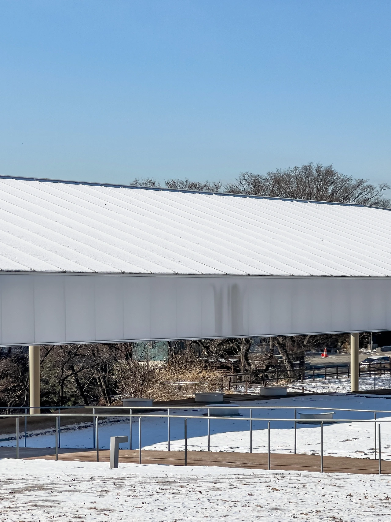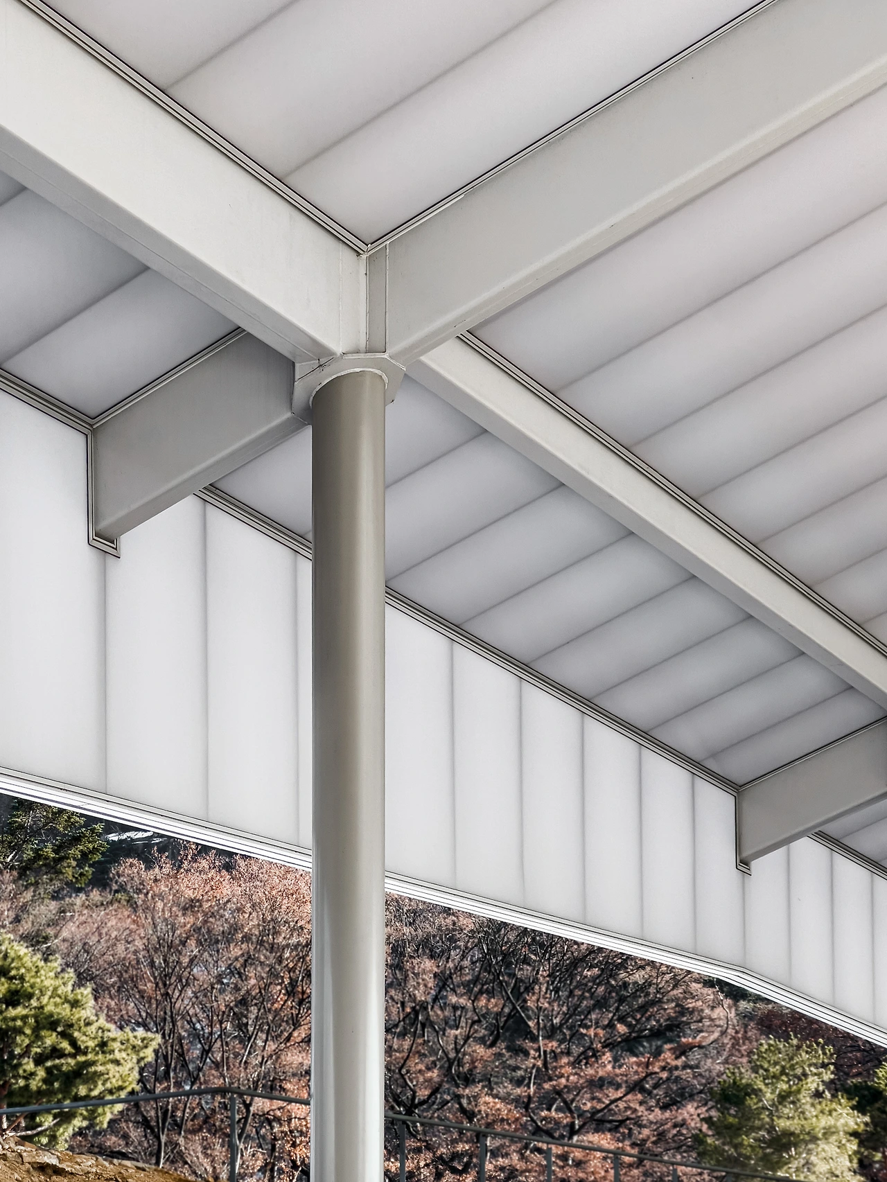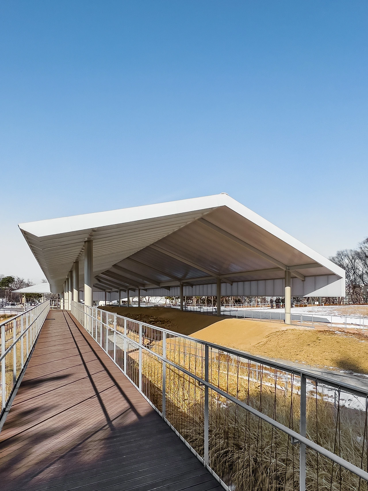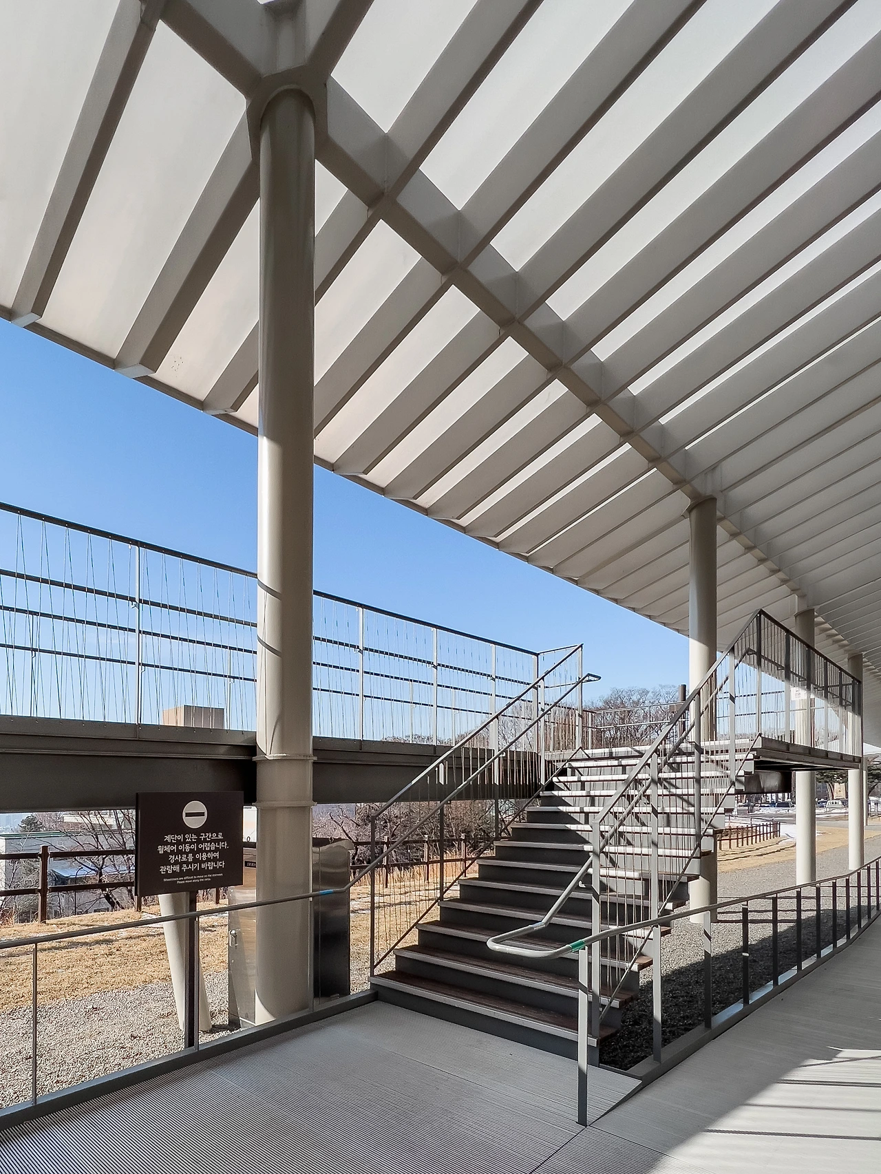 유적을 덮는 지붕은 도성을 따라 꺾이며 그 색은 백색으로 마감되어 한눈에 띈다. 비만 막아줄 뿐, 별다른 기능이 없어 보이는 지붕이지만, 외부공간과 구분 지어 산책로에 전시와 같은 새로운 프로그램을 부여한다는 점에서 의미 있다.