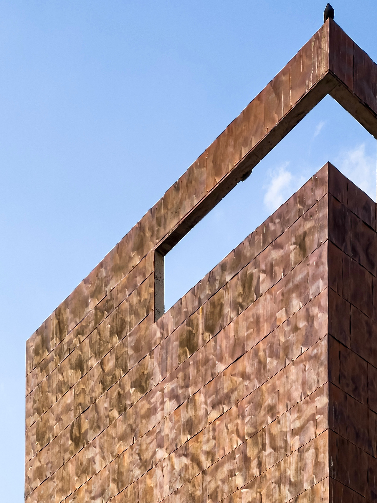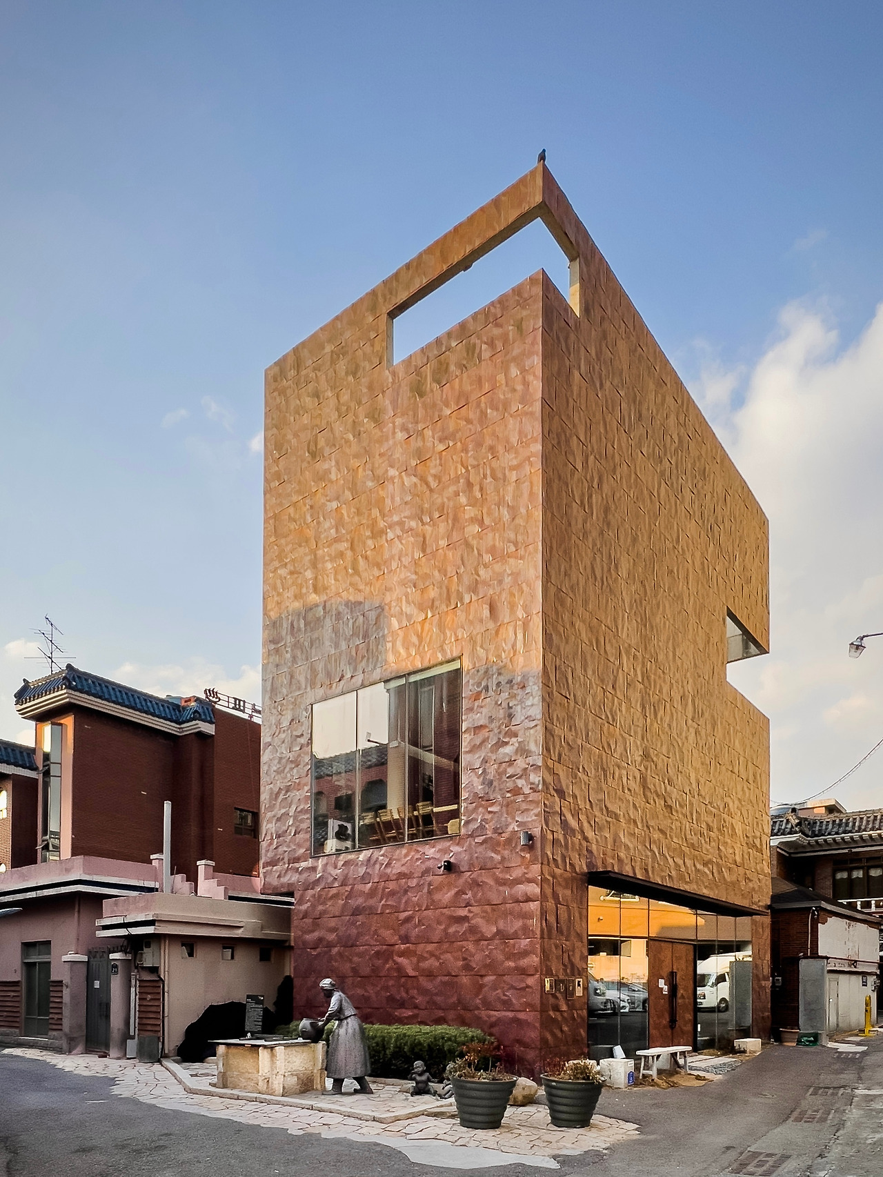 녹슨의 독특한 외피는 멀리서도 눈에 띈다. 한 장 한 장 정성스레 두드리고 불에 그을린 동판은 하나도 같은 것이 없다. 전부 다른 각도로 굴곡진 1,549장의 동판은 저마다 다른 깊이와 농도의 그림자를 가진다. 햇빛에 따라 시시각각 변화하는 그림자는 건물을 동적으로 만들고 빛을 난반사하여 윤슬을 만들어낸다. 그래서 건물이 골목 깊숙이 자리 잡고 있어도 존재감은 수그러들지 않고 주변을 환하게 밝힌다.