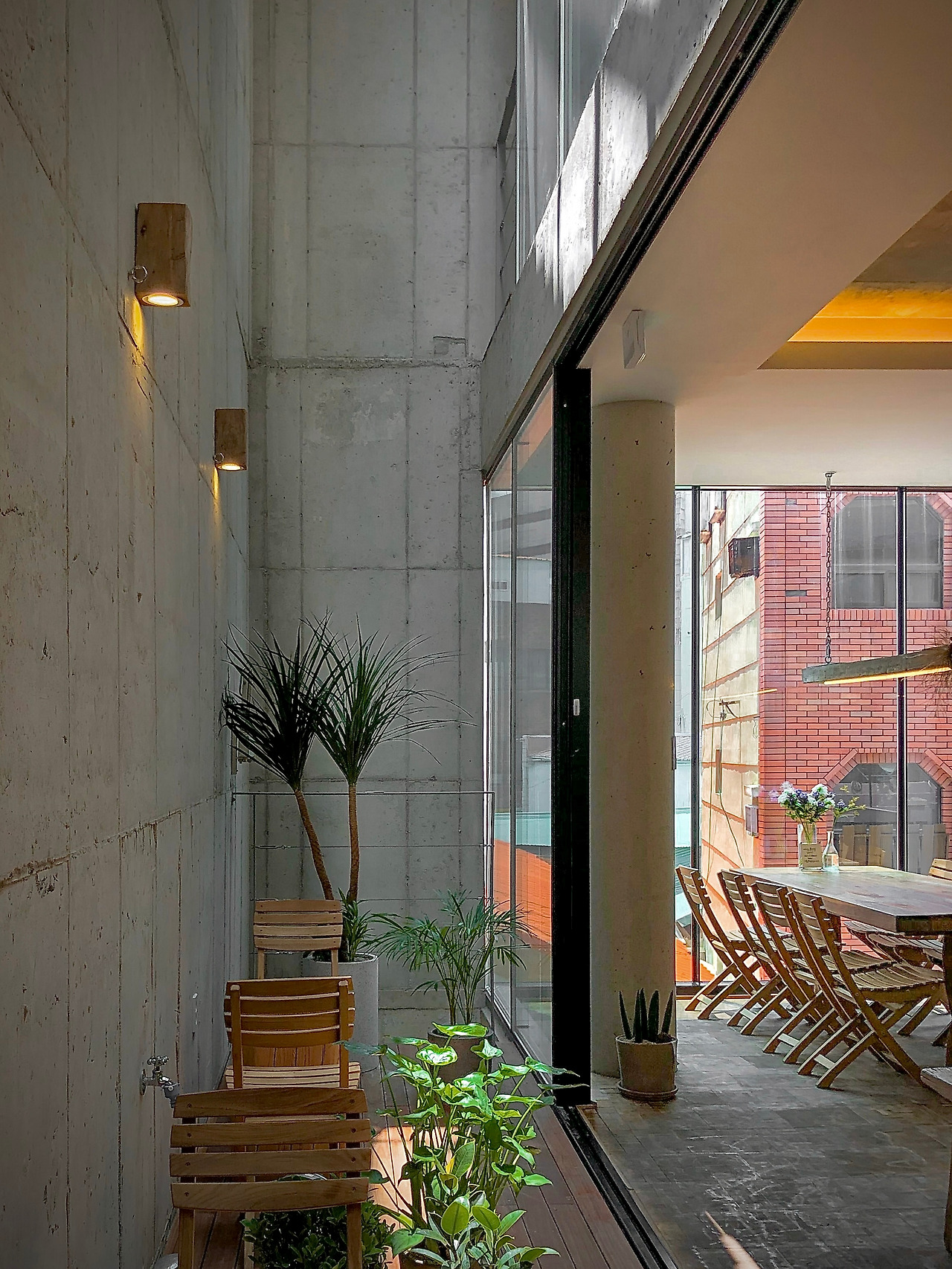 ‘녹슨’은 높지 않은 4층짜리 건물이다. 3층으로 구성된 내부와 옥상 테라스로 구성된 건물은 크기에 비해 내부 공간이 다소 좁지만, 각 층을 연결하는 전이 공간이 내부를 답답하지 않게 한다. 1층에 마련된 수 공간에서 들리는 물소리와 뚫린 천장으로 들어오는 빛, 창을 비집고 들어와 사람들을 스치는 바람이 오감을 자극한다.