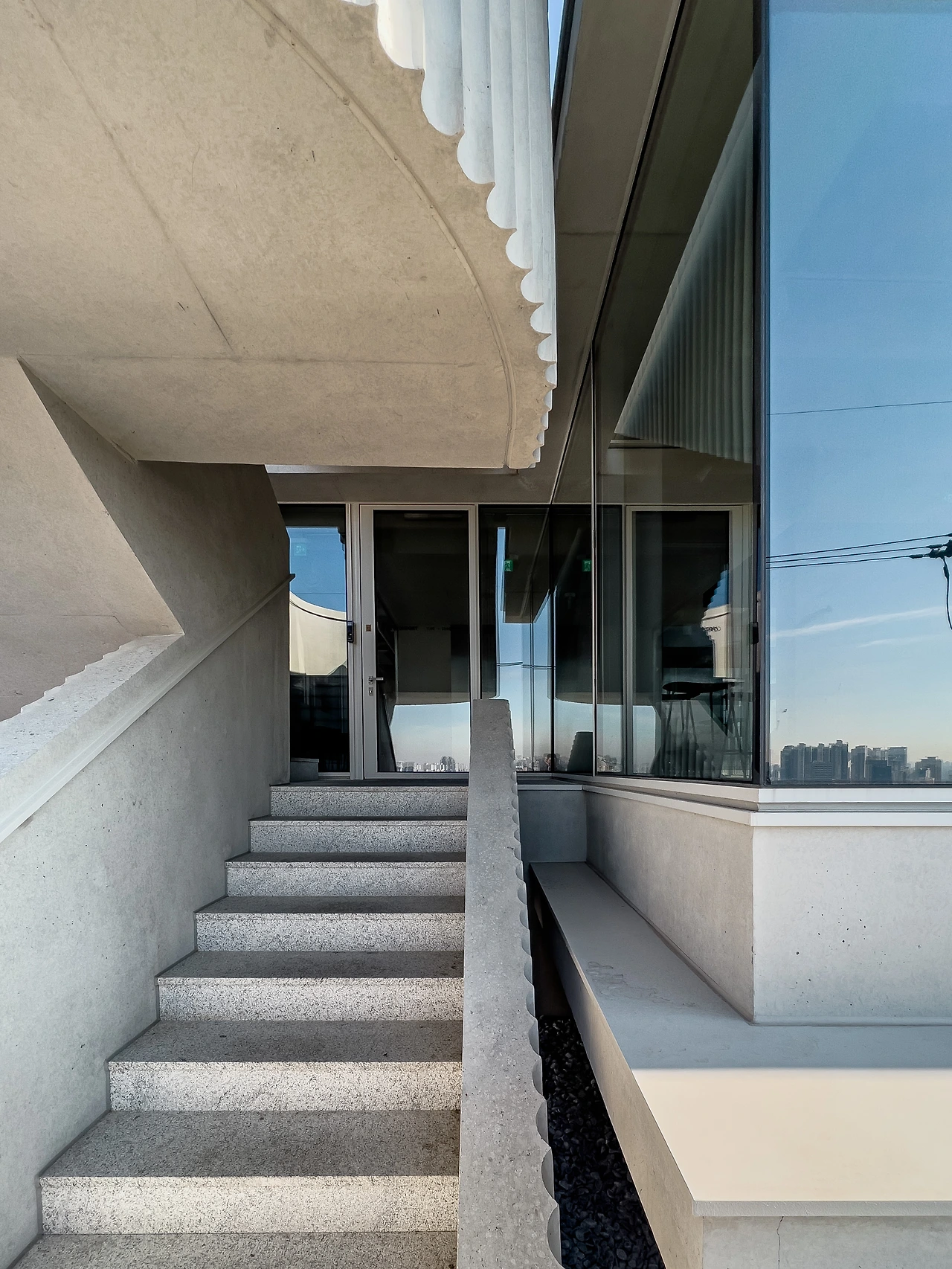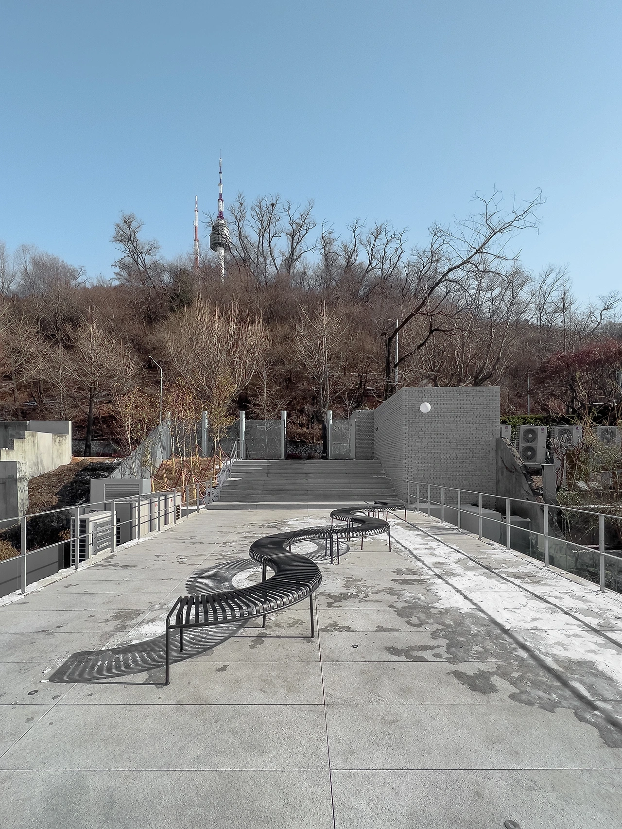 경사지에 건축된 보통의 건물들은 옥상층을 주차장으로 사용하고 1층을 주 출입구로 또는 반대로 계획하여 아랫길과 윗길의 경계 명확하게 구분 짓는다. 하지만 이곳은 옥상층을 전망대로 조성하여 경계 허물기를 시작하고 수직 동선인 계단을 통해 허물기를 극대화하여 사람들을 위아래로, 아래위로 끌어당긴다. 대비되는 두 거리를 융화시키는 것이다.