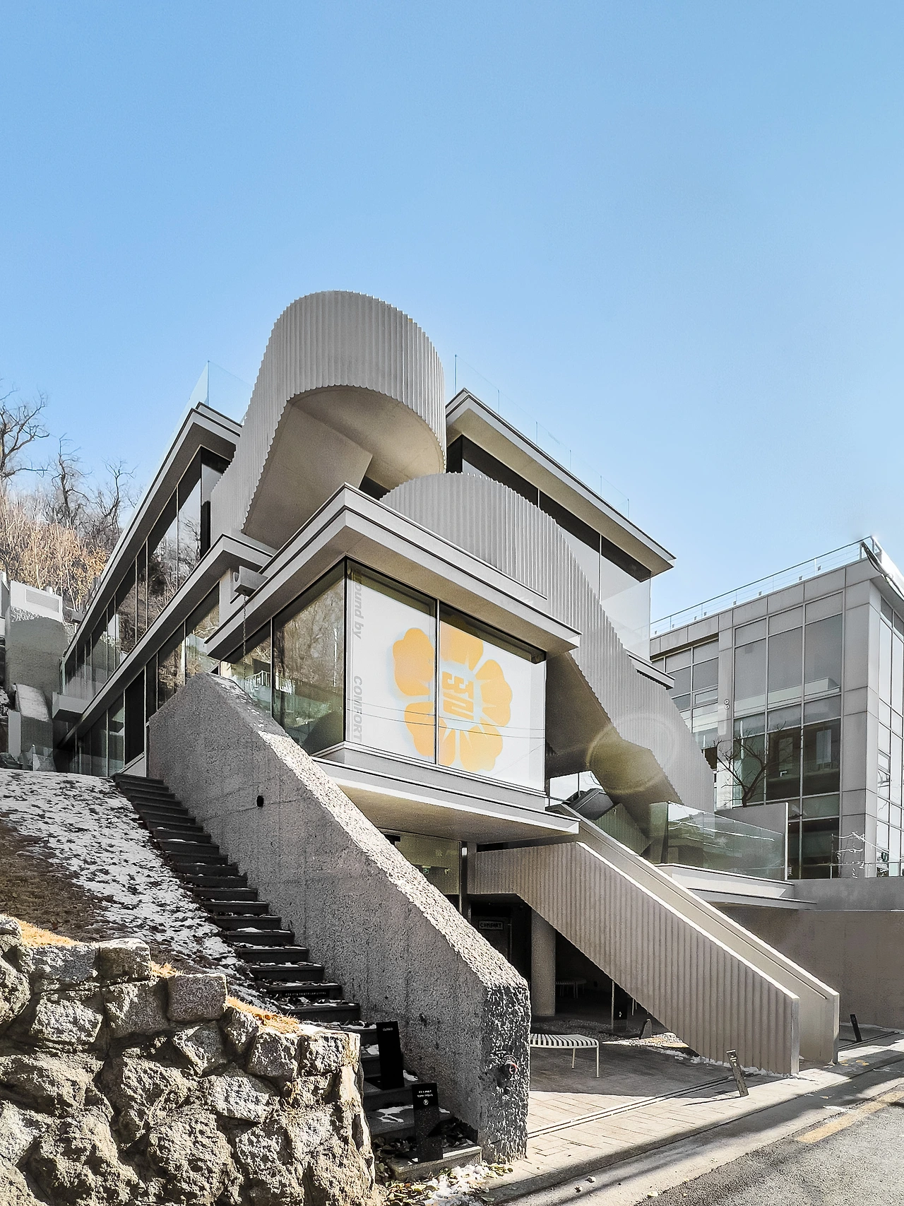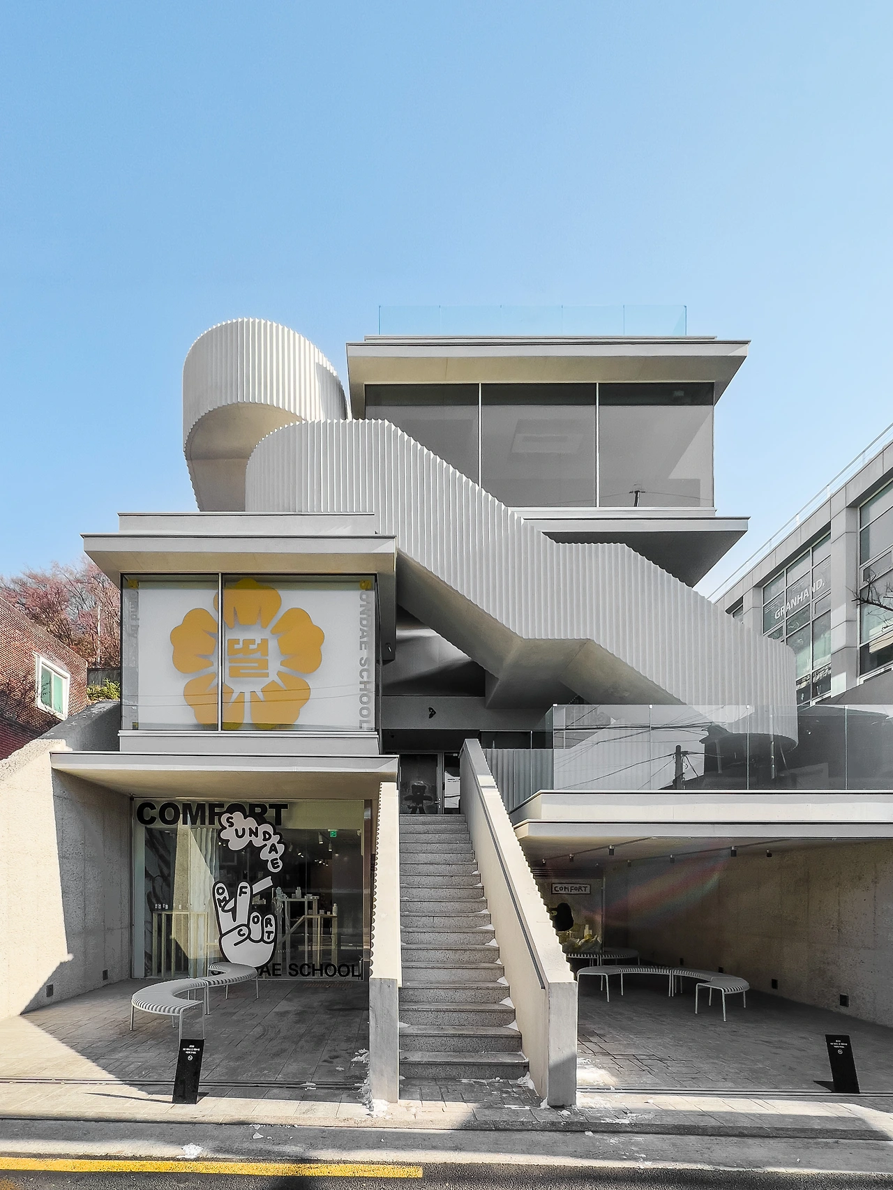 층의 위계를 나타내는 단은 공간을 구분 짓지만, 단이 모여 형성된 계단은 다시 두 단의 경계를 흐리게 만들어준다. ‘콤포트 서울’은 계단을 오브제로써 미적인 요소를 더해 경계를 허문다.