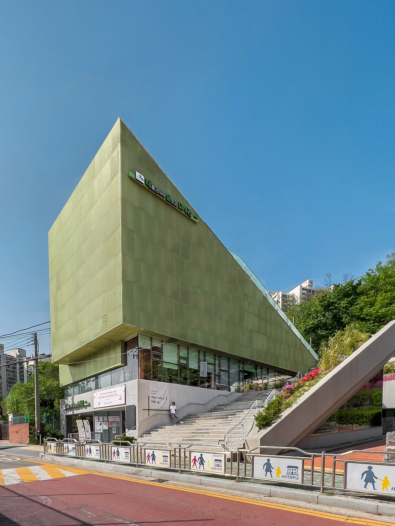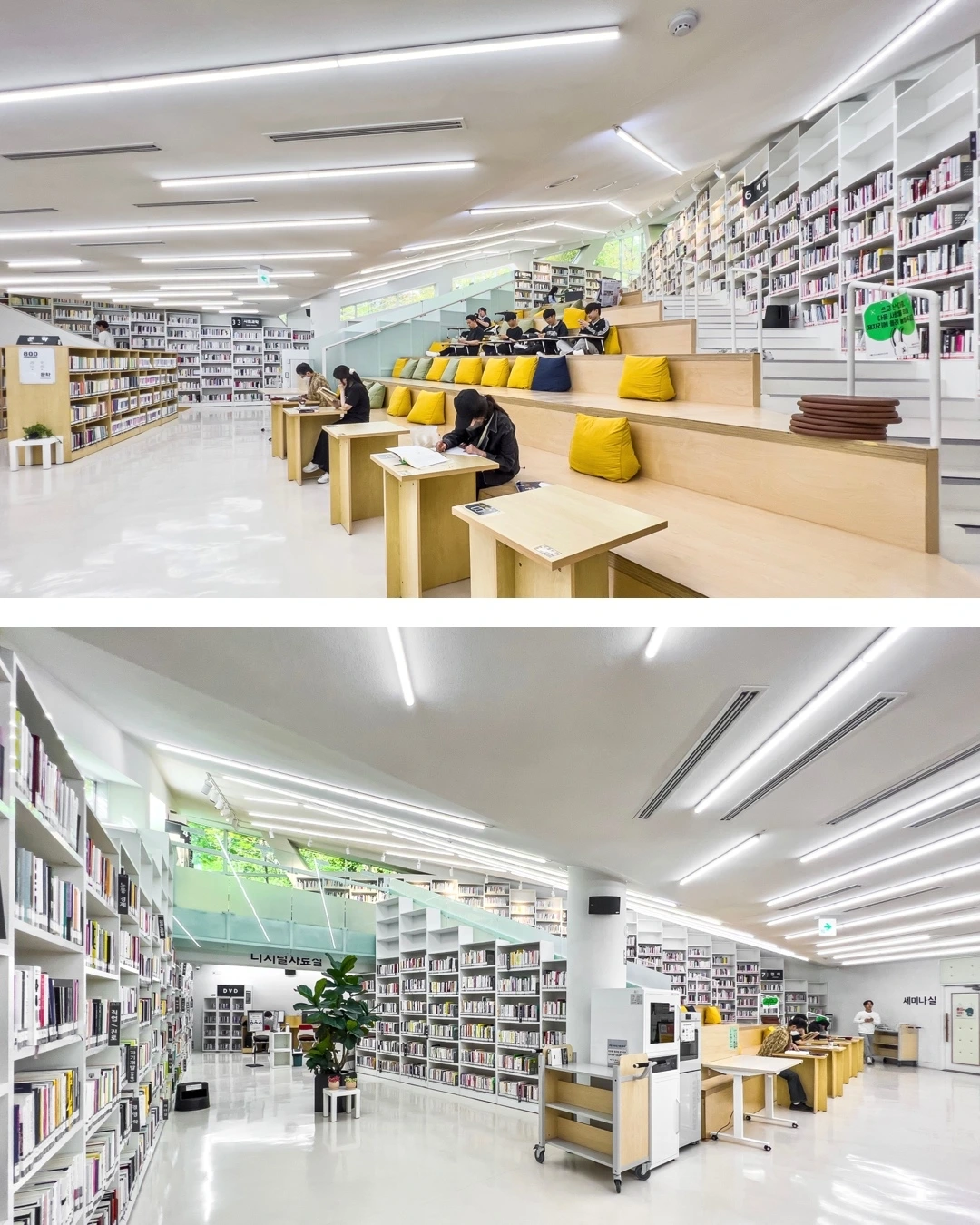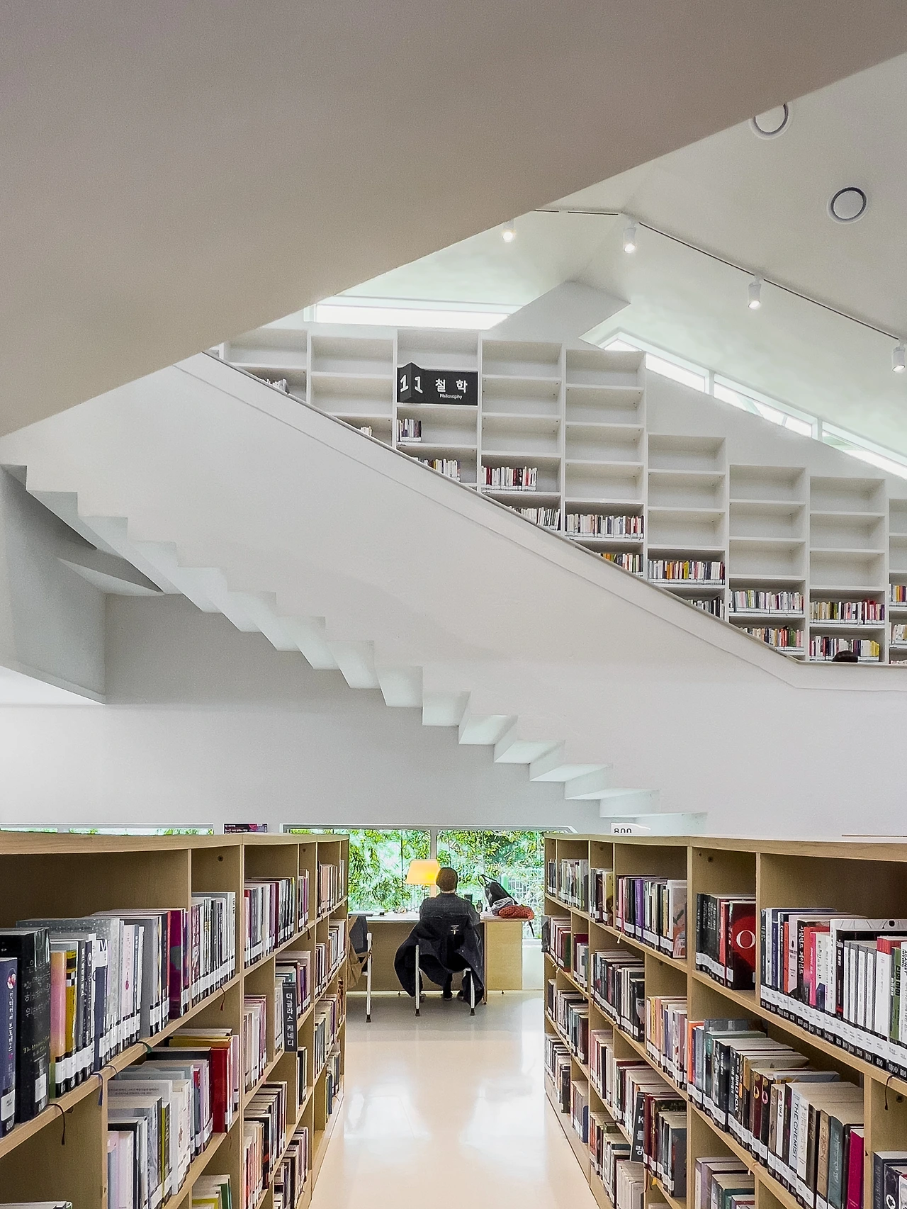 사다리꼴 대지로 인해 대로변과 수직인 선과 대지의 사선이 만난 공간은 다채로워졌다. 사선의 일부는 계단이 되고, 수직선은 열람실이 되었으며, 그 둘 사이를 이으며 생긴 빈 공간은 층간 시선 공유가 가능하다. 눈높이에 맞게 뚫린 창, 서가 위로 뚫은 얇은 창을 통해 들어오는 빛과 보이는 푸른 잎은 공간을 동적으로 만든다.