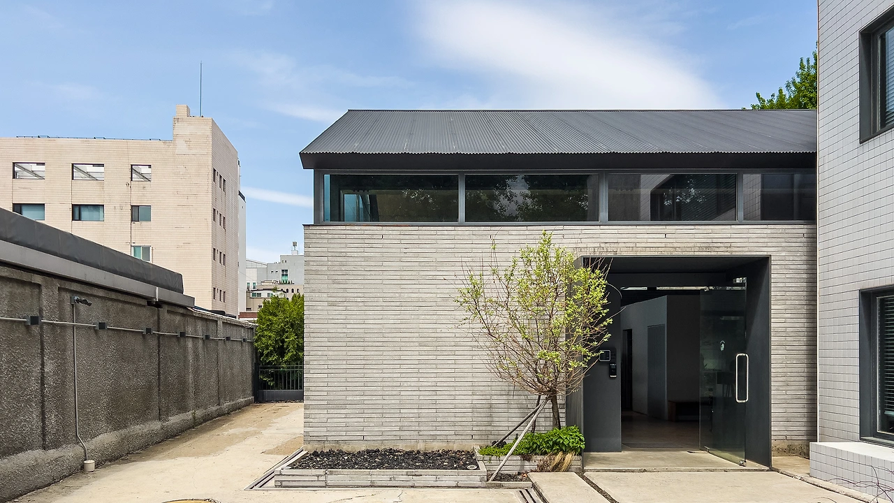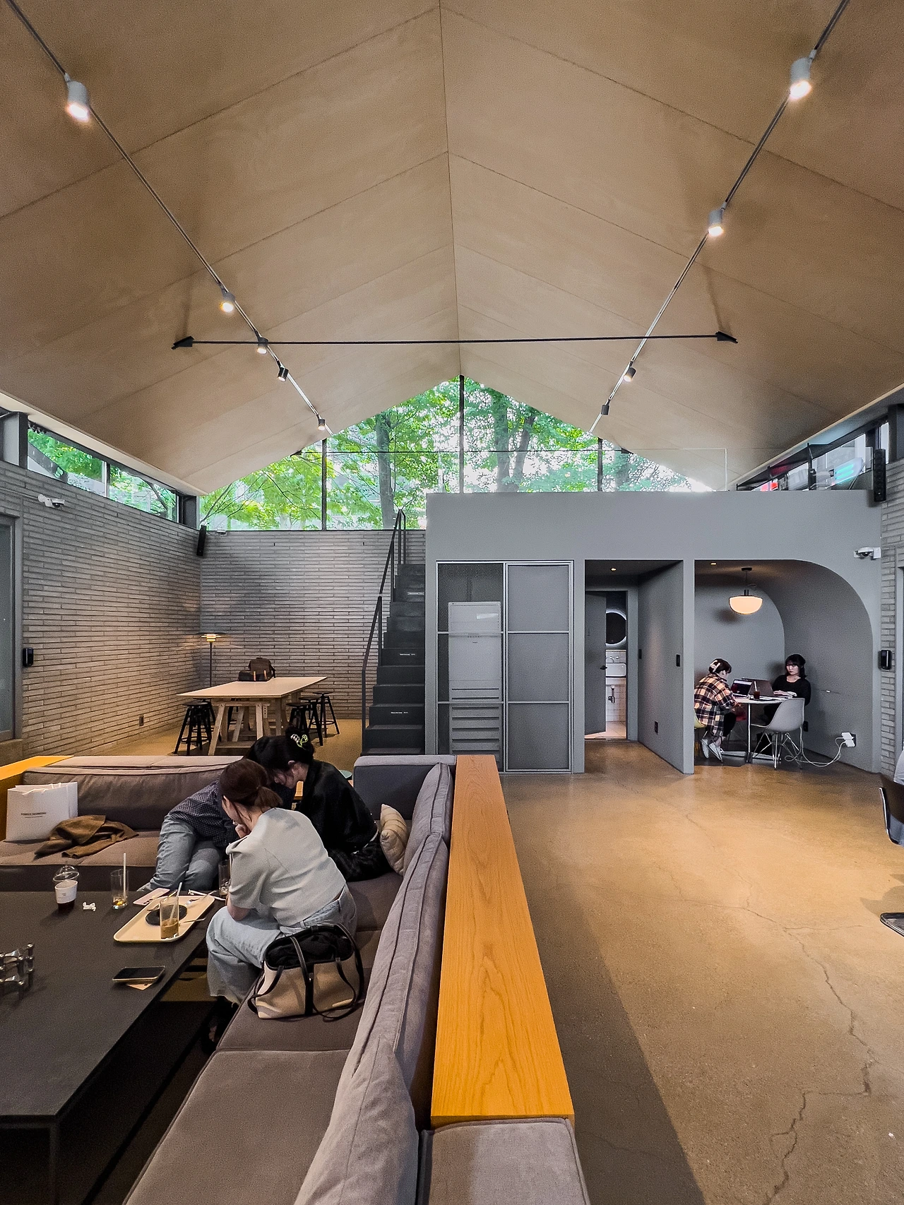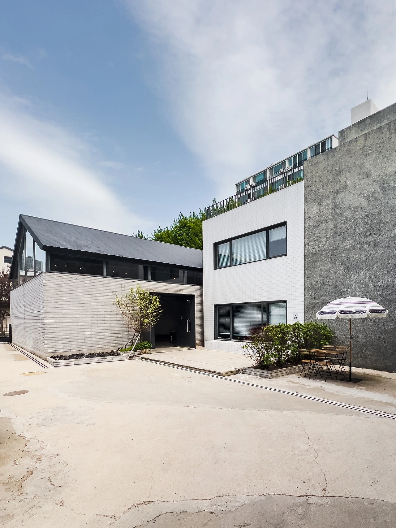 전이 공간을 거쳐 미팅과 업무를 위한 오픈 스튜디오, 카페 라운지, 전시장으로 구성된 공간은 건물의 형태와 입면 재료로 각각 구분된다. 가장 커서 눈에 띄는 박공지붕 건물은 카페 라운지로, 사람들의 대화소리와 자유롭게 오가는 움직임, 내부지만 야외 정원과 곧바로 연결된 동선으로 내외부 경계는 흐리다. 라운지인 만큼, 백색 타일로 마감한 건물과 깊숙이 숨은 전시장을 이어주기도 하며, 소품을 판매하는 섹션과 라이브러리도 함께 있어, 한 공간에서 다양한 이벤트를 경험할 수 있다. 라운지에서 나와 야외 정원을 거닐다 마주하는 ‘D‘ 공간은 실내도 실외도 아닌 모호함을 지녔다. 천장 블라인드가 열리고 닫히기에 공간은 변화무쌍하고 담아낼 프로그램도 다양하다.