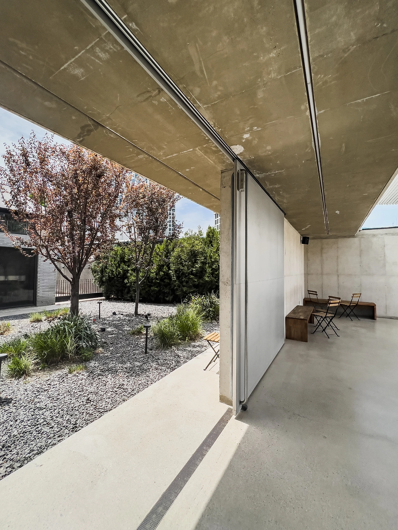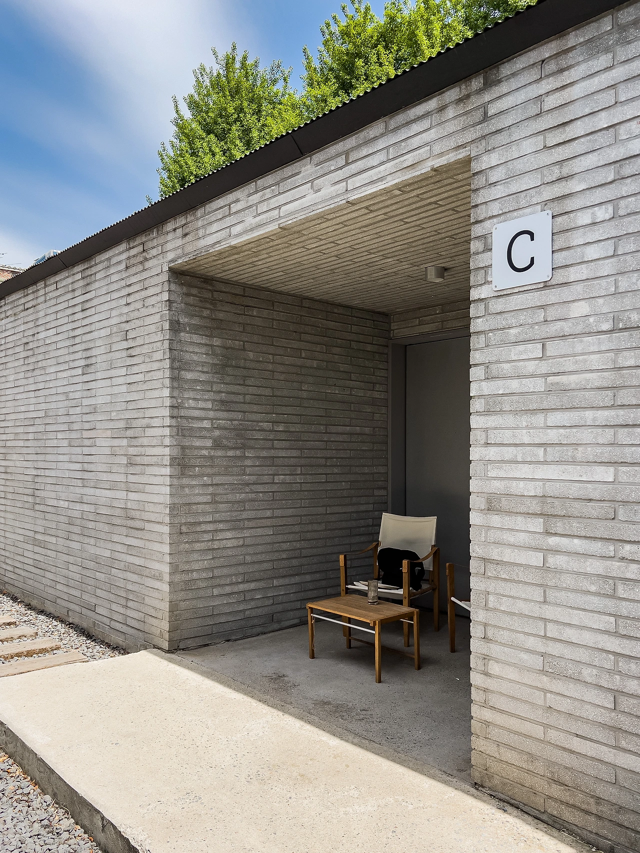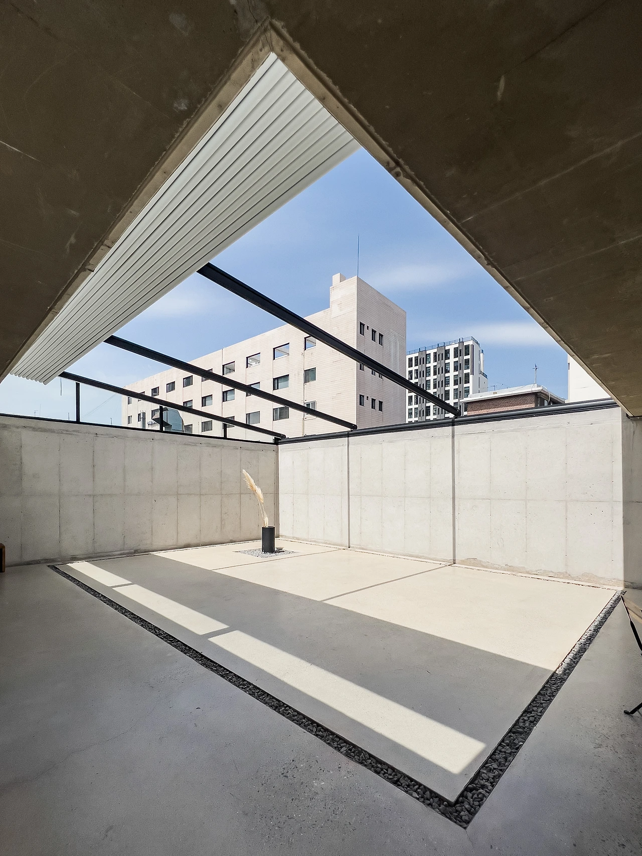 전이 공간을 거쳐 미팅과 업무를 위한 오픈 스튜디오, 카페 라운지, 전시장으로 구성된 공간은 건물의 형태와 입면 재료로 각각 구분된다. 가장 커서 눈에 띄는 박공지붕 건물은 카페 라운지로, 사람들의 대화소리와 자유롭게 오가는 움직임, 내부지만 야외 정원과 곧바로 연결된 동선으로 내외부 경계는 흐리다. 라운지인 만큼, 백색 타일로 마감한 건물과 깊숙이 숨은 전시장을 이어주기도 하며, 소품을 판매하는 섹션과 라이브러리도 함께 있어, 한 공간에서 다양한 이벤트를 경험할 수 있다. 라운지에서 나와 야외 정원을 거닐다 마주하는 ‘D‘ 공간은 실내도 실외도 아닌 모호함을 지녔다. 천장 블라인드가 열리고 닫히기에 공간은 변화무쌍하고 담아낼 프로그램도 다양하다.