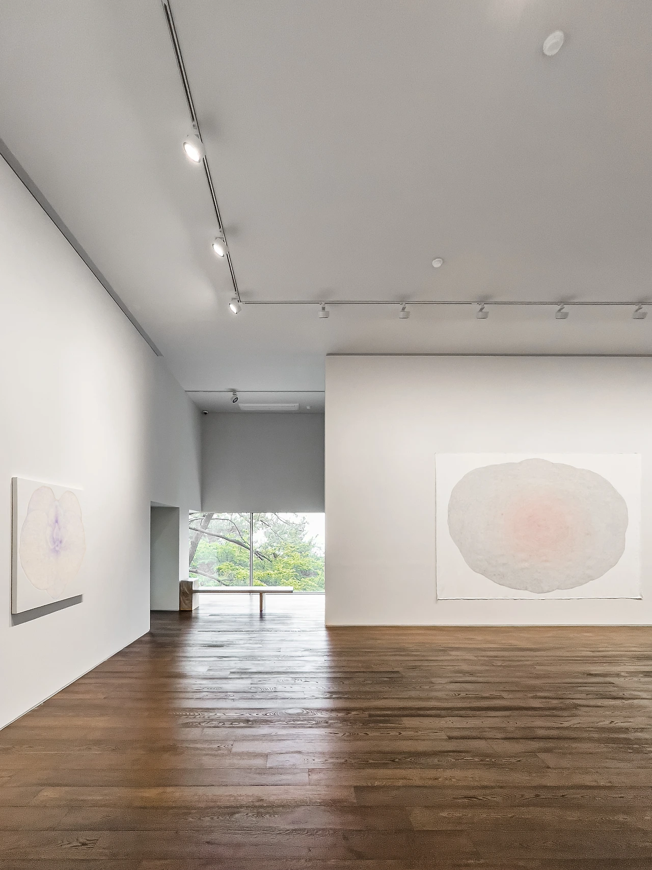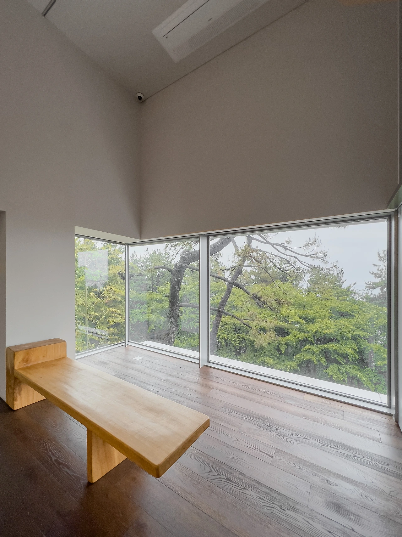계단을 타고 올라 2층 전시장에 발을 디디면, 1층에서 느꼈던 아쉬움은 금세 사라진다. 작품보다 더 눈이 가는 풍경 때문이다. 방해 요소 없이, 오롯이 푸른 자연이 겹겹이 겹친 모습을 볼 수 있다. 날씨에 따라, 계절에 따라 시시각각 변화하는 자연이기에, 이곳은 수백 수천 개의 풍경화를 가지고 있는 셈이다. 창문 앞에 의자가 놓여 있는 것도 창 너머 보이는 풍경을 하나의 작품으로 감상하길 바라는 의도로 보인다.