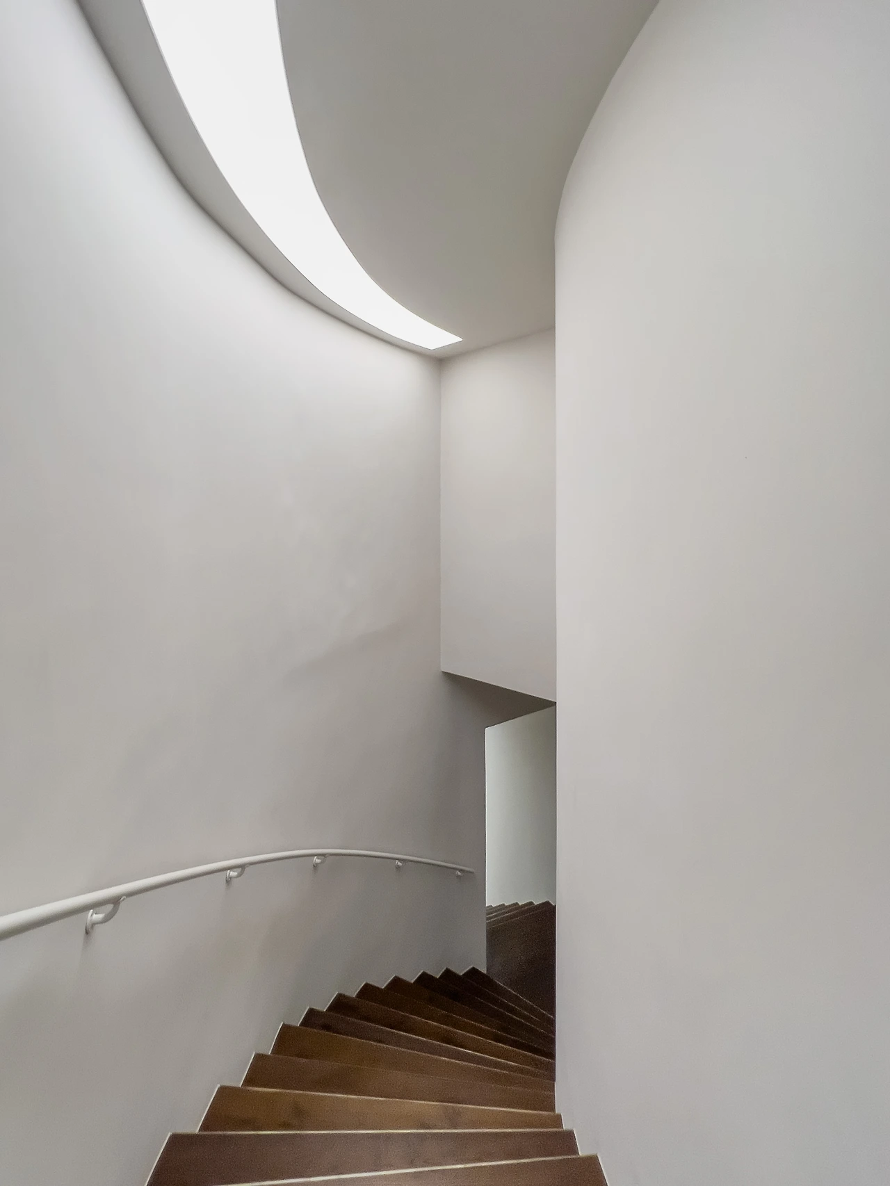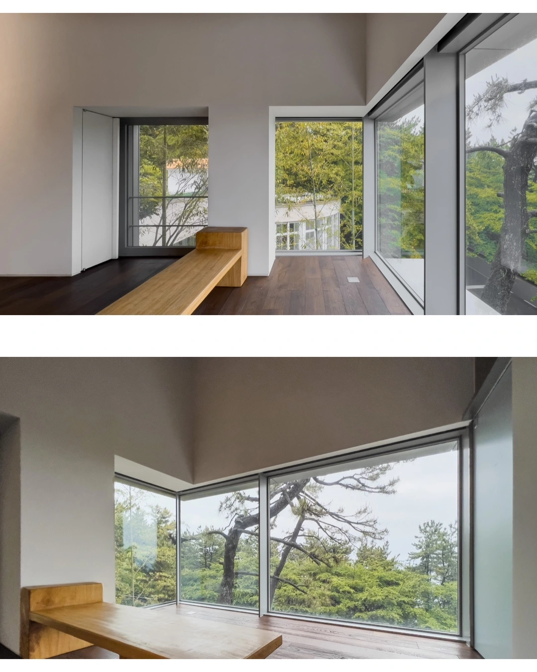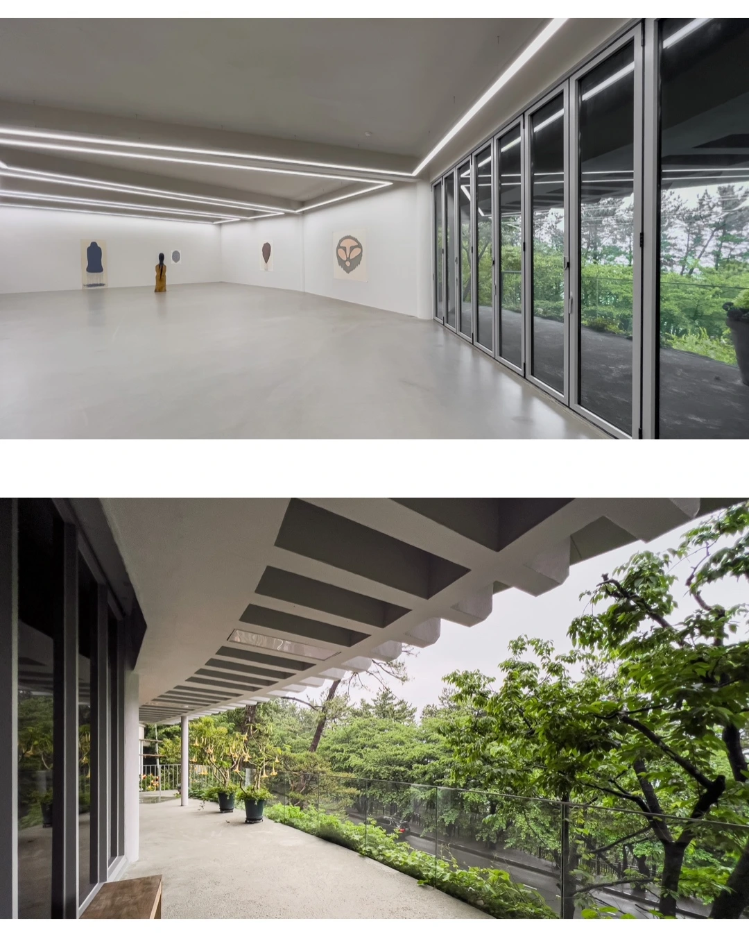 돌계단을 오르면 도달하는 전시장 앞 테라스는 톱니바퀴 형상을 한 지붕이 프레임으로 작용해 와우산과 바다 전경을 담는다. 반면, 전시장 1층은 폴딩도어를 제외하고는 어떠한 창도 없어, 자연을 경험할 수 없다.