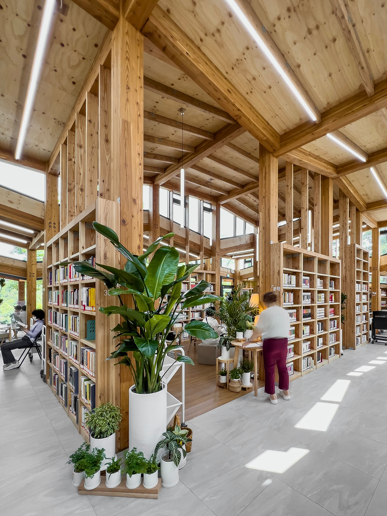 벽이 아닌 나무 책장이 중첩되어 방과 복도를 만들어 동선을 분리한다. 공간은 나무 내음으로 가득 차고, 책 사이로 걸러진 빛은 은은하게 내부를 밝힌다. 덕분에 책장으로 둘러싸인 메인 공간은 좁지만, 답답하지 않다. 벽이 필요 없는 목구조 덕분이기도 하다.