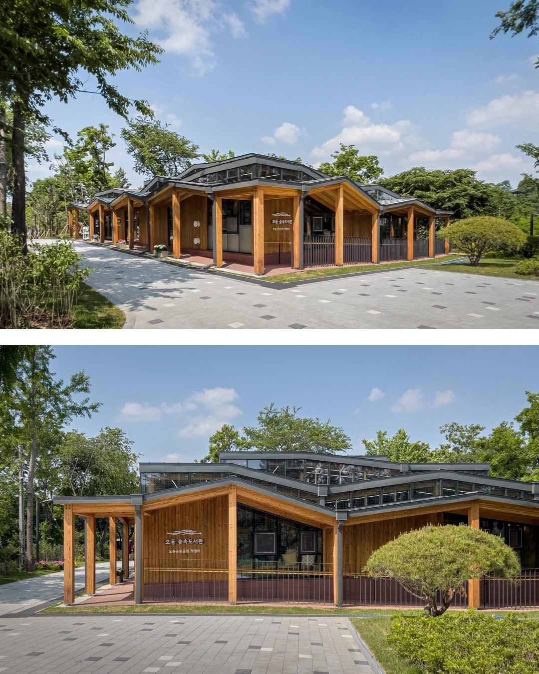 월곡산 산책로 초입에 자리하여 공원 길 연장이 되는 ‘오동 숲속 도서관’은 파리의 열린 공간처럼 다양한 프로그램을 수용하고 사람들에게 휴식을 제공한다. 건물은 오동 공원길 흐름에 따라 회전하는 토네이도 형태로, 지붕은 틈을 만들며 조금씩 올라가고, 지면은 단을 만들며 내려간다. 틈 사이로 들어오는 빛은 시간에 따라 공간 분위기를 바꾸고, 단은 여러 레벨에서 공원을 바라볼 수 있게 한다. 작은 공간이지만 경험은 다채롭다.