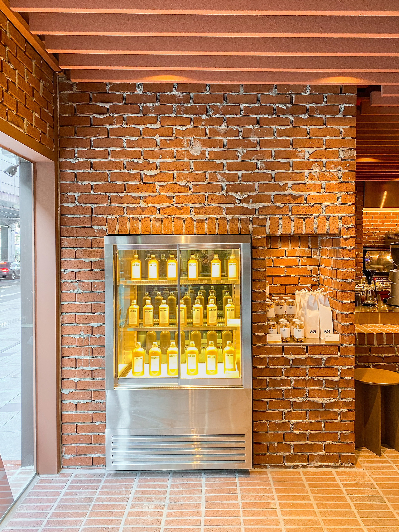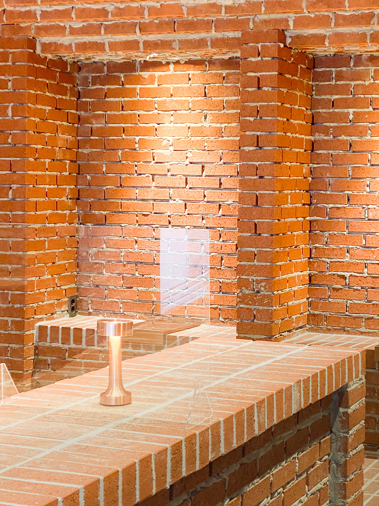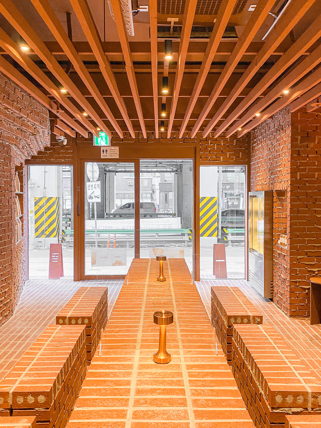 벽돌 자체가 반듯한 사각형인 덕분에 거친 마감 부분이 지저분하지 않으며, 정갈한 벤치와 테이블이 거친 벽면과 대조를 이룬다. 벽돌을 앞으로 한 칸씩 내밀어 쌓는 ‘내쌓기 방식’을 보여주는가 하면, 벽돌 벽 자체가 의자와 등받이가 되고, 제품의 진열장이 되기도 하는 등. 협소한 공간에 볼거리는 넘쳐난다.