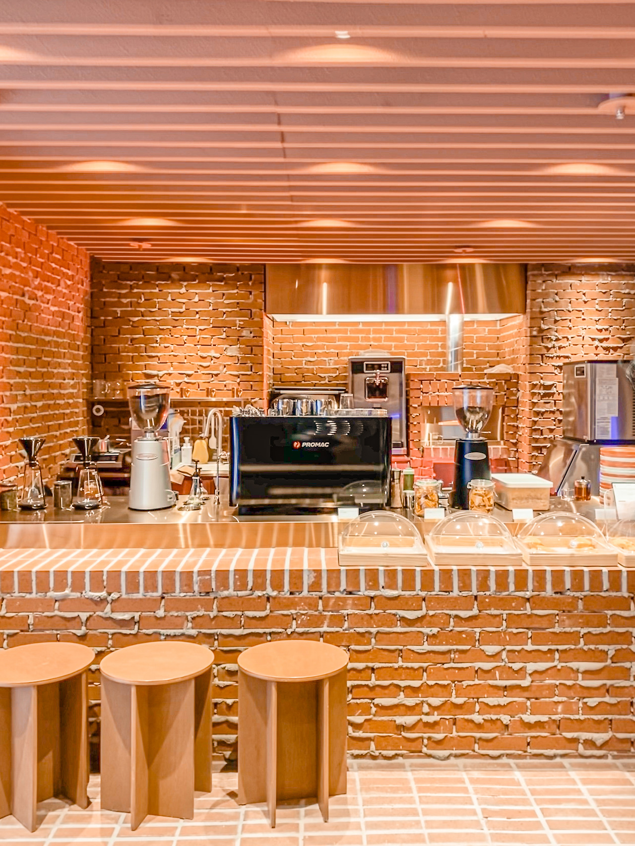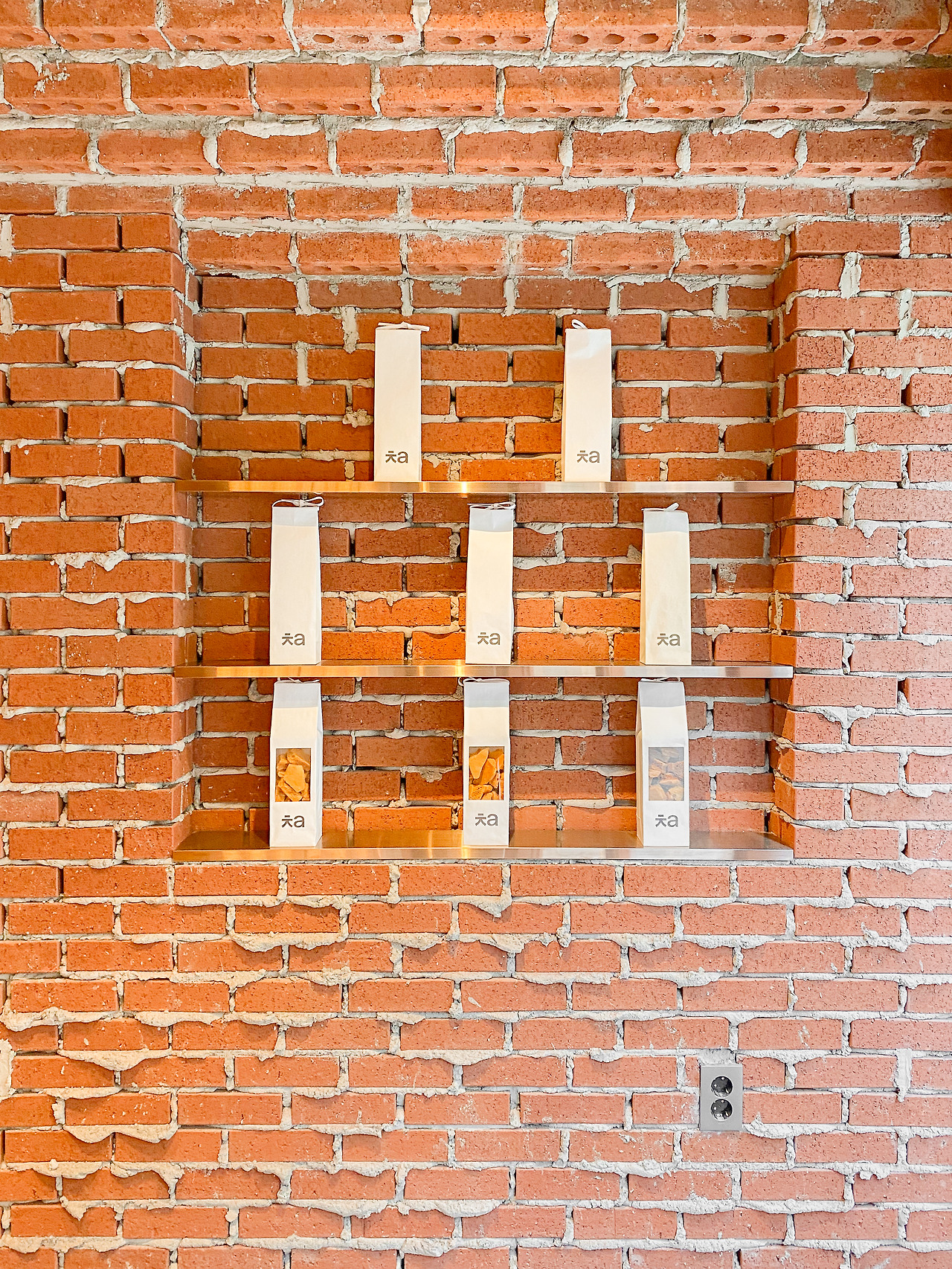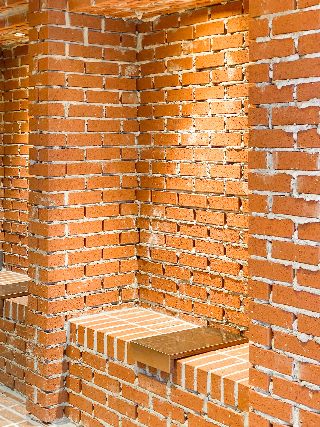 벽돌 자체가 반듯한 사각형인 덕분에 거친 마감 부분이 지저분하지 않으며, 정갈한 벤치와 테이블이 거친 벽면과 대조를 이룬다. 벽돌을 앞으로 한 칸씩 내밀어 쌓는 ‘내쌓기 방식’을 보여주는가 하면, 벽돌 벽 자체가 의자와 등받이가 되고, 제품의 진열장이 되기도 하는 등. 협소한 공간에 볼거리는 넘쳐난다.