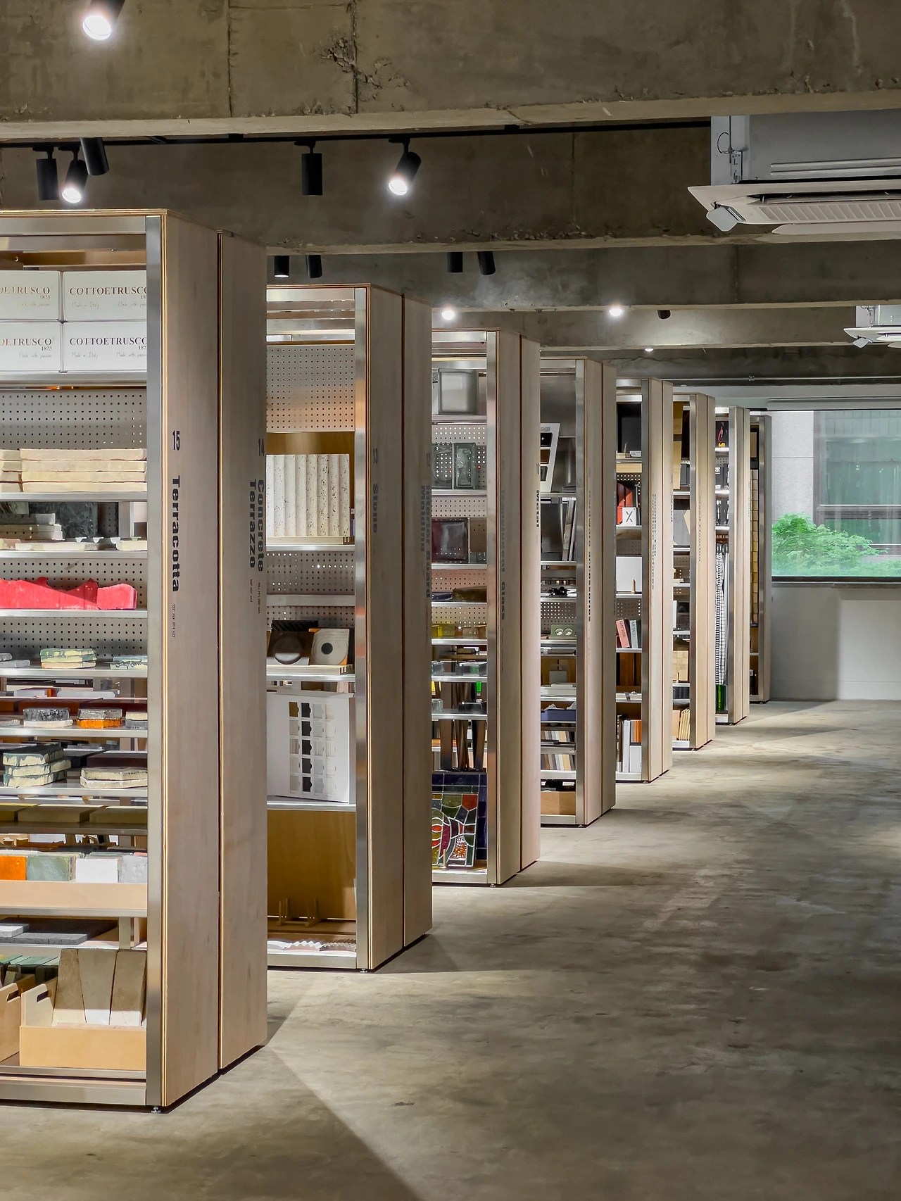 수입 타일 전문 업체인 ‘윤현상재’가 선보이는 ‘머테리얼 라이브러리’는 소재의 다양성을 확인하고 디자인 영감을 받기에 최적의 장소다. 나무 원재료부터 가공된 바닥재, 가구 마감재, 패브릭, 하드웨어 액세서리까지 건축 자재를 넘어 인테리어 자재가 종류별로 모여 있다. 무엇보다 색상부터 크기, 모양의 색다른 타일을 종류별로 경험할 수 있다. 종류가 방대해 재료의 한계 없는 가능성에 놀란다. 공간을 구성하는 다양한 재료를 만져보고 조합도 해볼 수 있다.