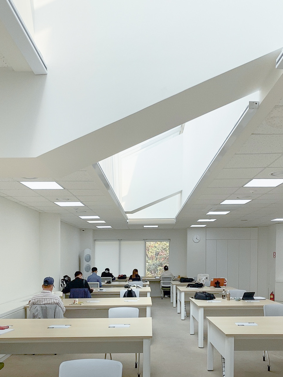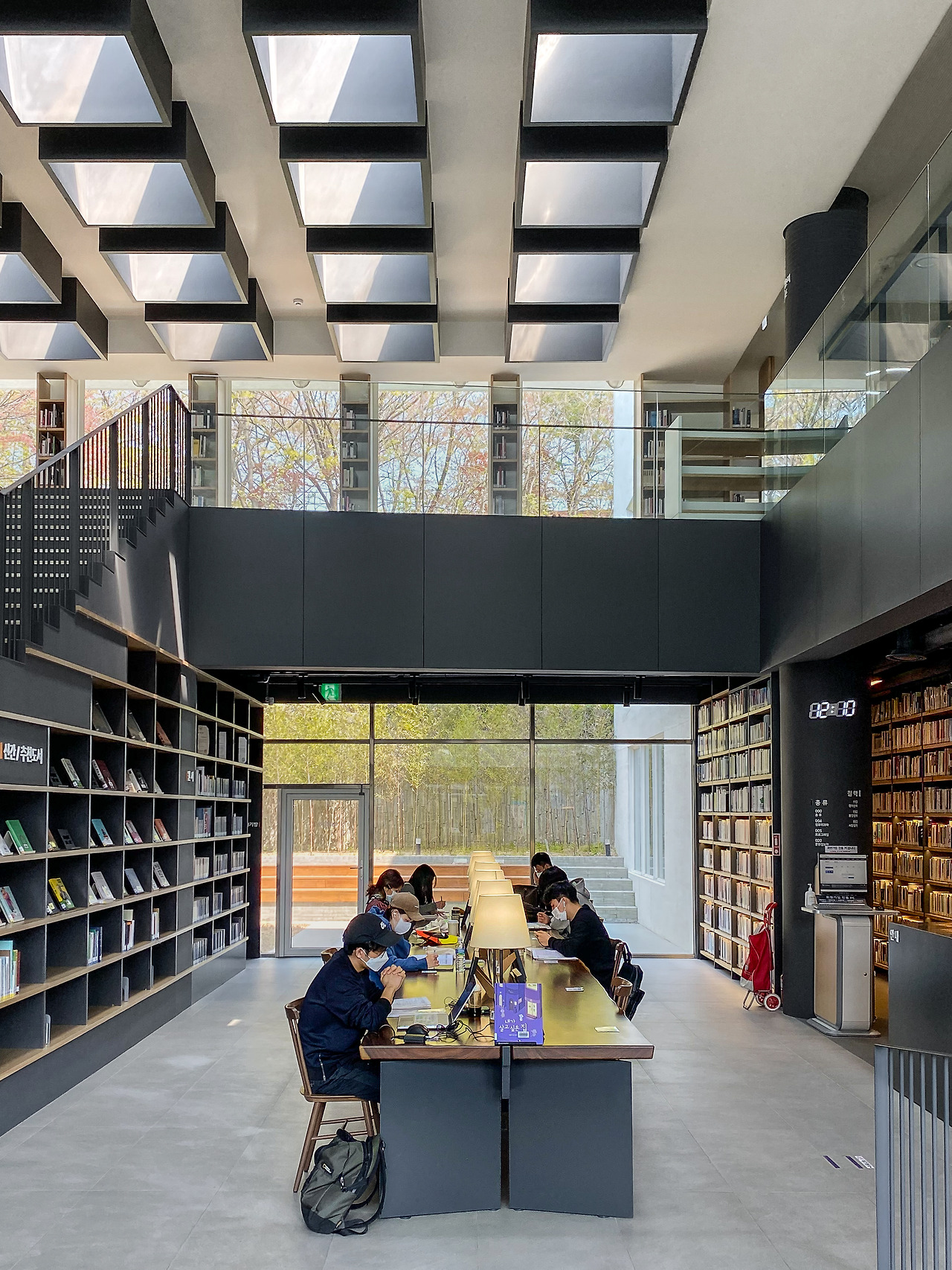 천창에서 떨어지는 빛이 내부를 밝히고, 계단이자 앉으면 의자가 되는 공간은 바쁘게 공부하던 사람마저 여유롭게 잠시 쉬어 갈 수 있도록 배려한 모습이 엿보인다. 중앙의 긴 테이블 뒤로 보이는 마당은 이곳이 도서관이 아닌 집이라는 인상을 주고, 그 옆에 빽빽하게 들어선 서가는 여유로운 다른 공간과 대비된다.