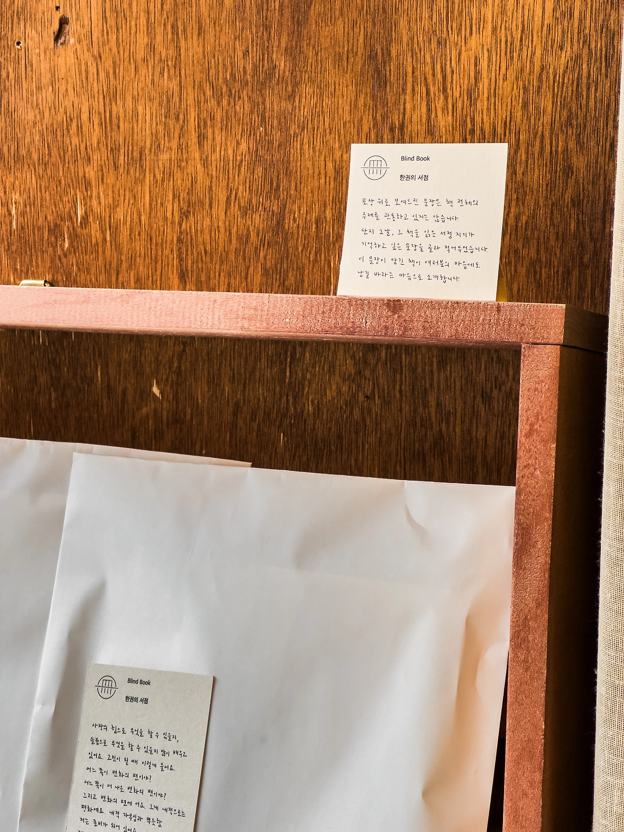 책을 꾸준히 읽지만, 관심 분야만 읽는다. 그 분야의 지식은 날카롭지만, 나머지는 그렇지 않다. 그래서 사고도 일방향인 경우가 많다. 한권의 서점은 하나의 키워드로 시작해 그와 어울리는 책을 세 평 남짓한 공간에서 재구성한다. 그날의 날씨, 기분에 따라 선정된 문구를 기록하고 관련한 사진고 걸어 관객의 호기심을 자극한다. 현재는 지금까지 선보였던 책들을 펼쳐 보이니 작은 공간에서 새로운 지식의 문을 열어볼 절호의 기회다.
