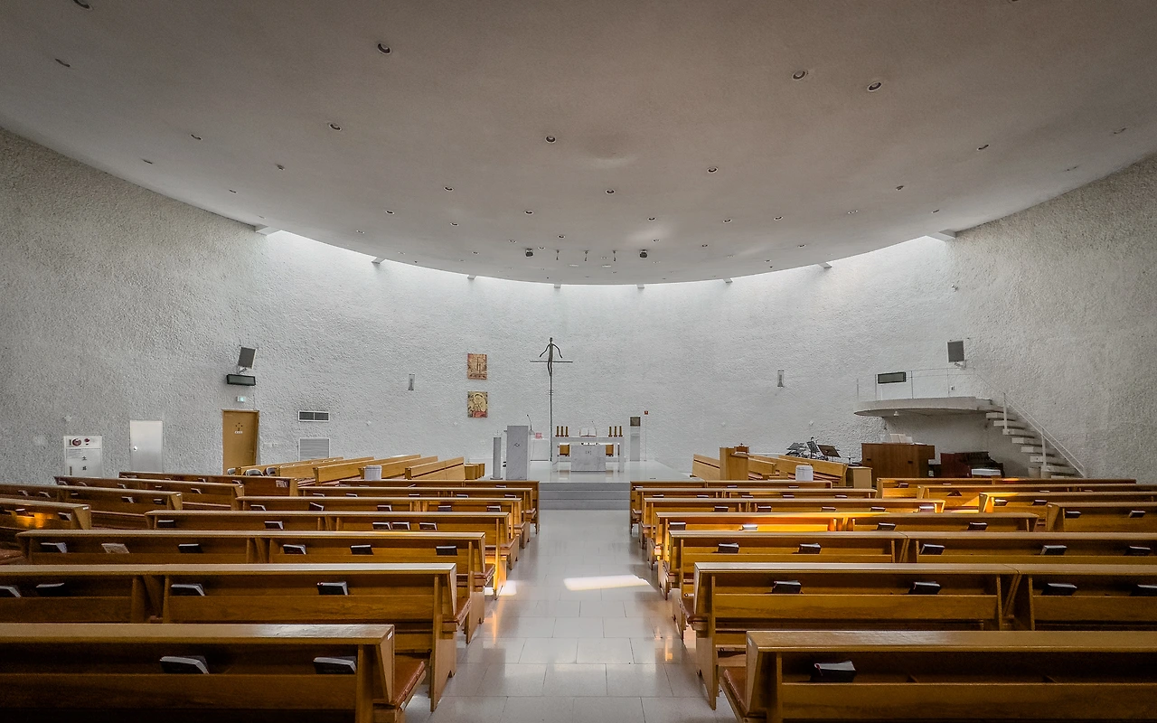 갑옷처럼 꽁꽁 싸맨 켜를 지나 본당으로 들어간다. 십자가의 길에서 스며든 빛처럼 천장과 벽 사이의 틈으로 스미는 빛이 재단을 환히 밝힌다. 자신을 보호하며 응축된 강인함은 우리를 경건하게 한다. 그 힘은 강력해서 지친 이들의 마음까지 보듬어준다. 역시 내면의 깊은 곳을 자극하는 종교 건축이다.