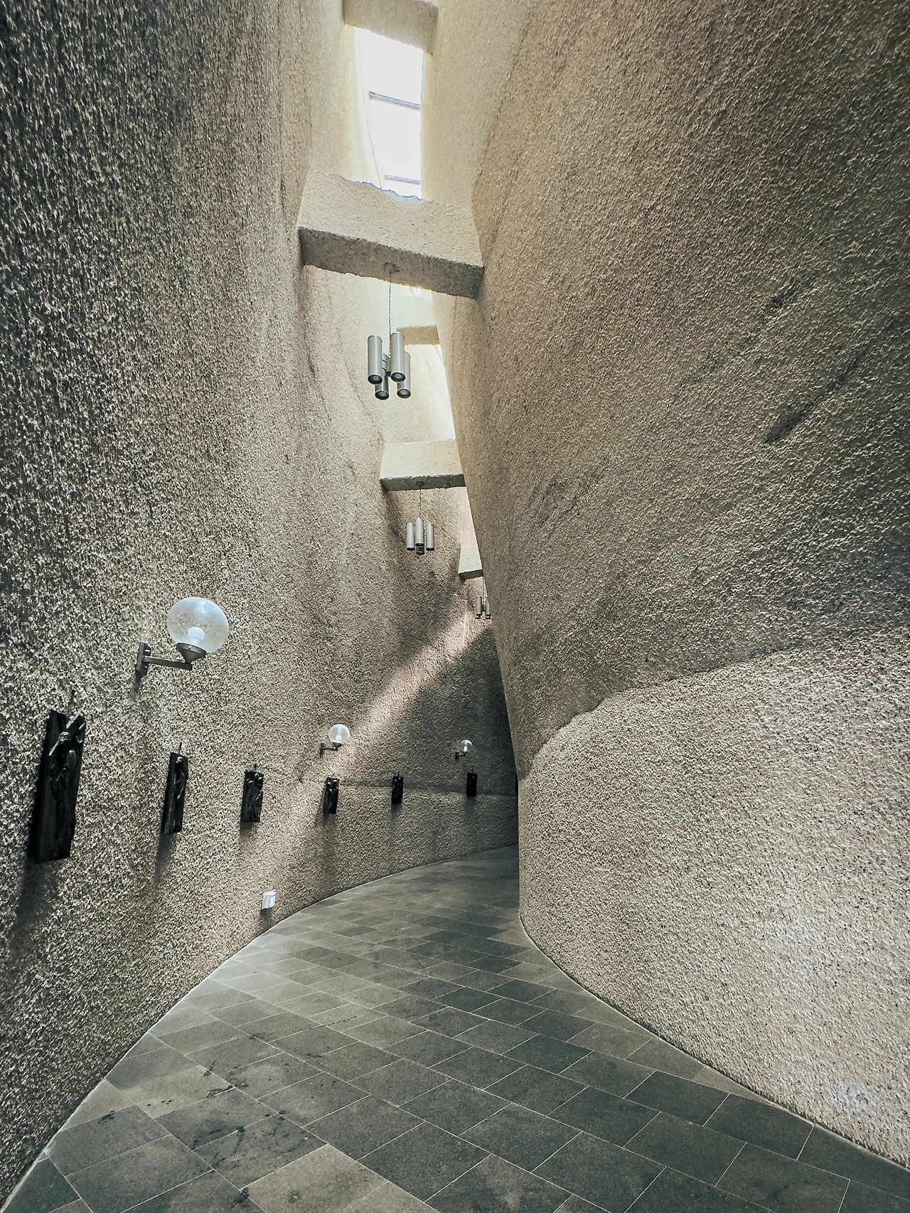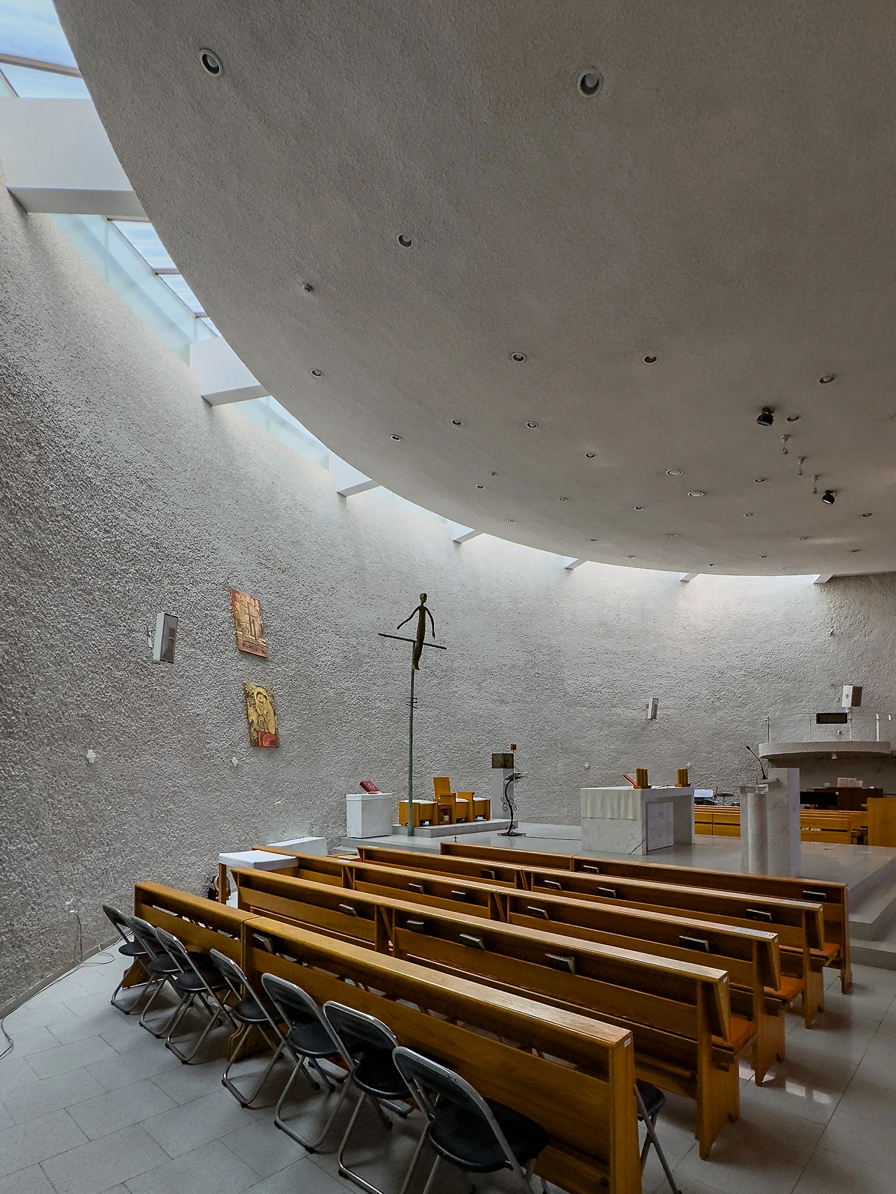 대로변을 따라 담장을 치고 표고차를 잇는 경사로를 그리며 켜를 추가한다. 원뿔형의 건물도 두 겹이다. 본당을 감싸는 내벽과 내벽을 감싼 외벽이다. 벽 사이는 ‘십자가의 길‘인 회랑을 만들며 자연스레 외부 소음을 차단한다. 속도를 가진 도시의 길과 달리 이곳은 조용해서 시간이 느리게 흐른다. 침묵하여 성찰하는 공간이다.