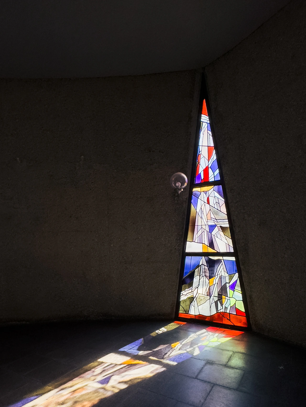 두 벽은 서로를 향해 기울어져 틈을 만들고 빛을 들여 공간에 농담을 더한다. 길을 오르면서 짙어지는 공간 끝에는 삼각형의 스테인드글라스 창이 있다. 창으로 스며든 빛이 바닥을 다채롭게 물들인다. 공간을 심리적으로 구분 지으며 본당으로 들어가기 전, 마음의 준비를 일러주는 경고문이자 본당으로 안내하는 화살표다.