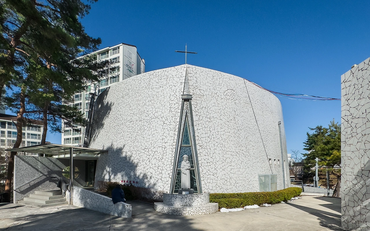 천장 중심은 볼록하다. 시선은 자연스럽게 중심이 아닌 원의 테두리로 향한다. 재단에 집중하고 본당과 건물 입구 연장선에 있는 소나무에 집중한다. 이후에는 도시와 이어지는 대문에 집중하며 발걸음을 옮긴다. 바쁜 현대 사회로 나가는 길이 긴장된다. 그렇지만 괜찮다. 두려움에 마음이 지치기 전, 내 몸을 지키는 방법을 터득했으니.