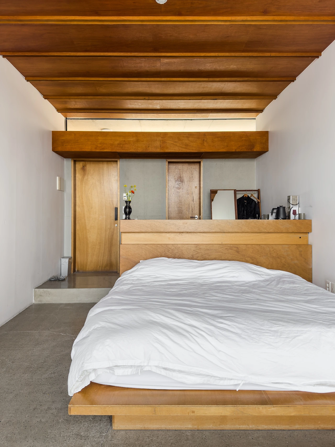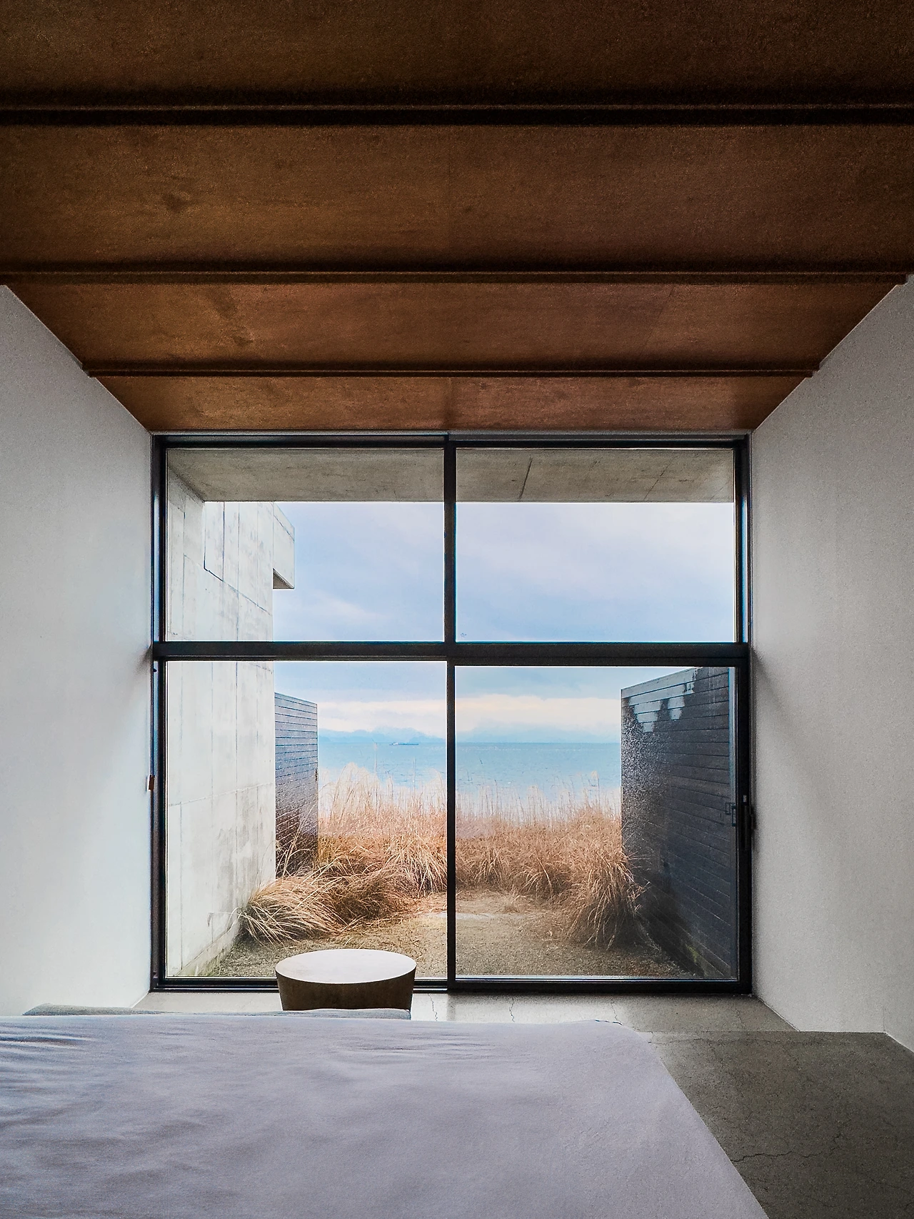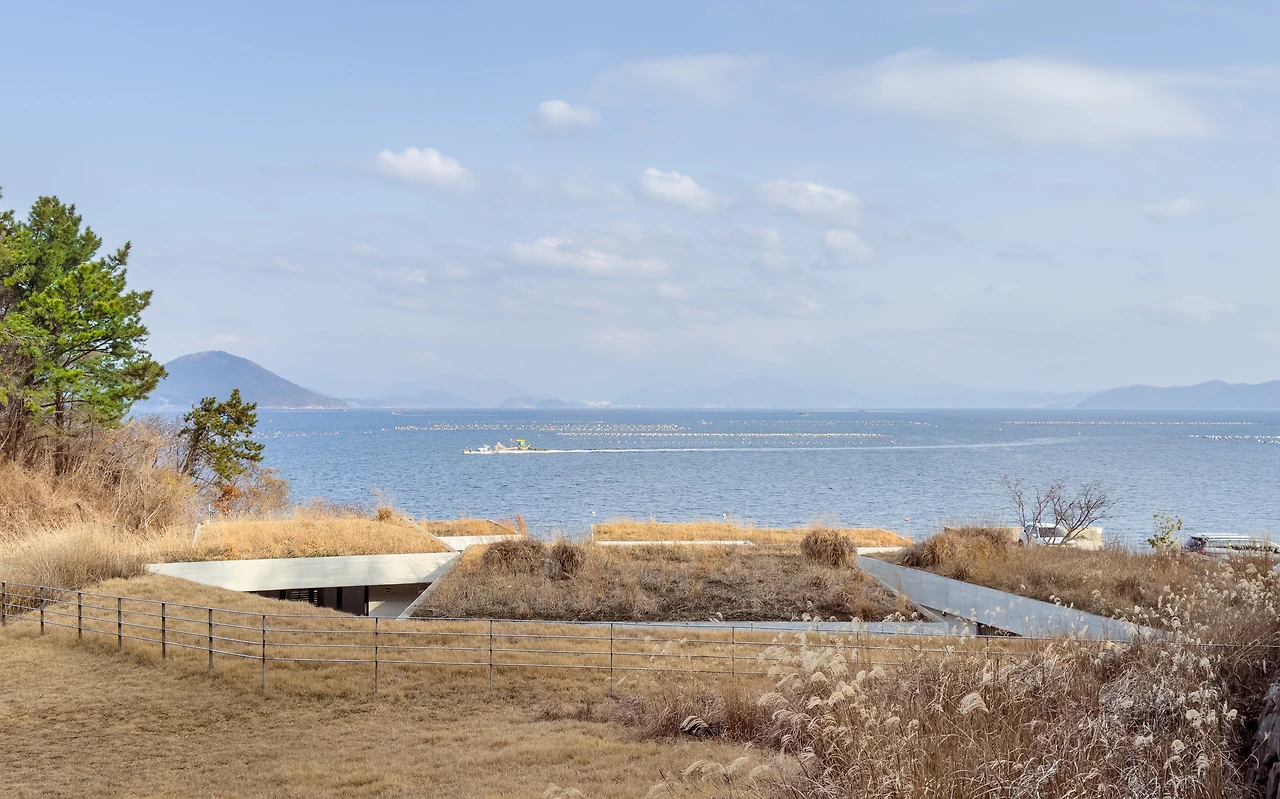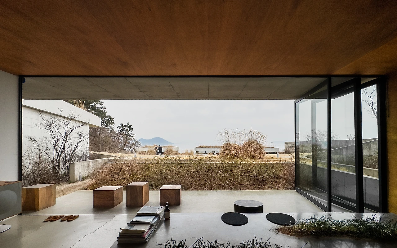 나는 2인실 ㅁ자집에 머물렀다. 바다를 바라보며 땅으로 들어간다. 묵직하지만 부드럽게 열리며 여닫을 때 손에 착 감기는 감각의 선명한 대비처럼, 문 너머의 광경은 진입할 때 보았던 바다와 다르다. 지상에서는 지붕의 선과 겹치며 잔잔한 수평선을 강조하지만, 내부에서는 갈대가 바다의 역동성을 시각화한다. 벽과 천장과 바닥은 프레임이 되어 바다를 작품으로 담는다. 동시에 날씨와 시간에 따라 안개가 끼거나 걷히며 드러나고 숨는 군도가 경관을 한층 풍성하게 한다.