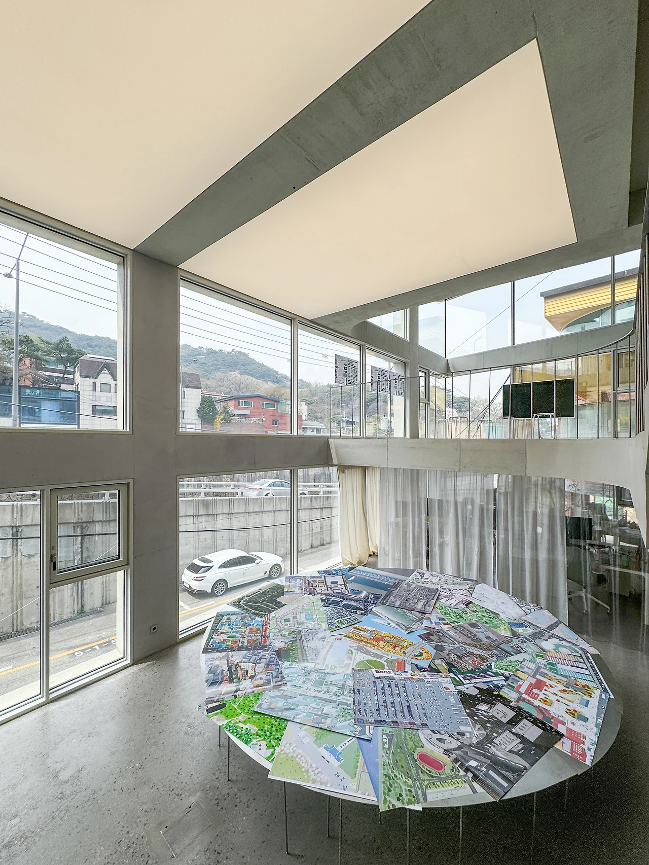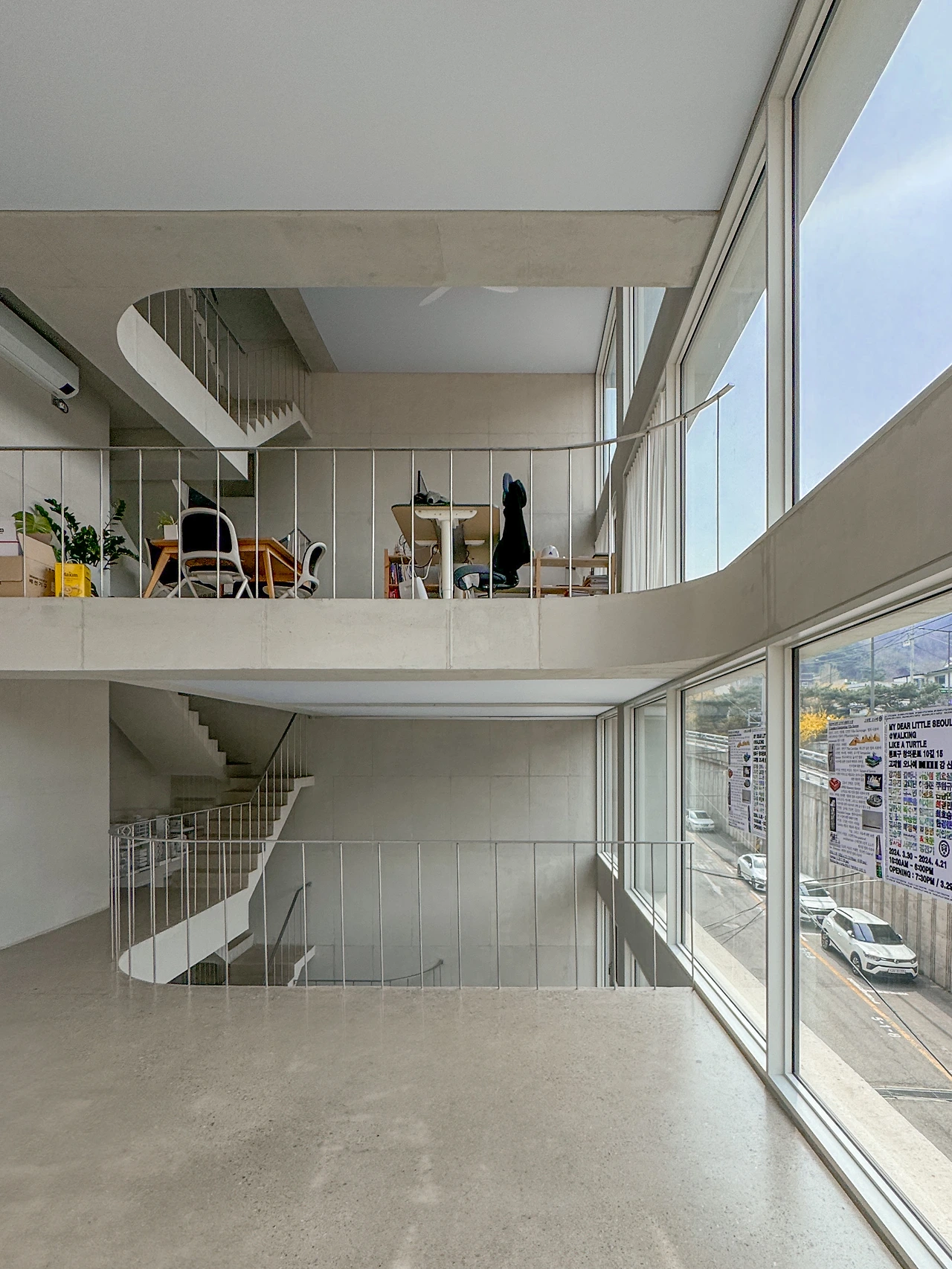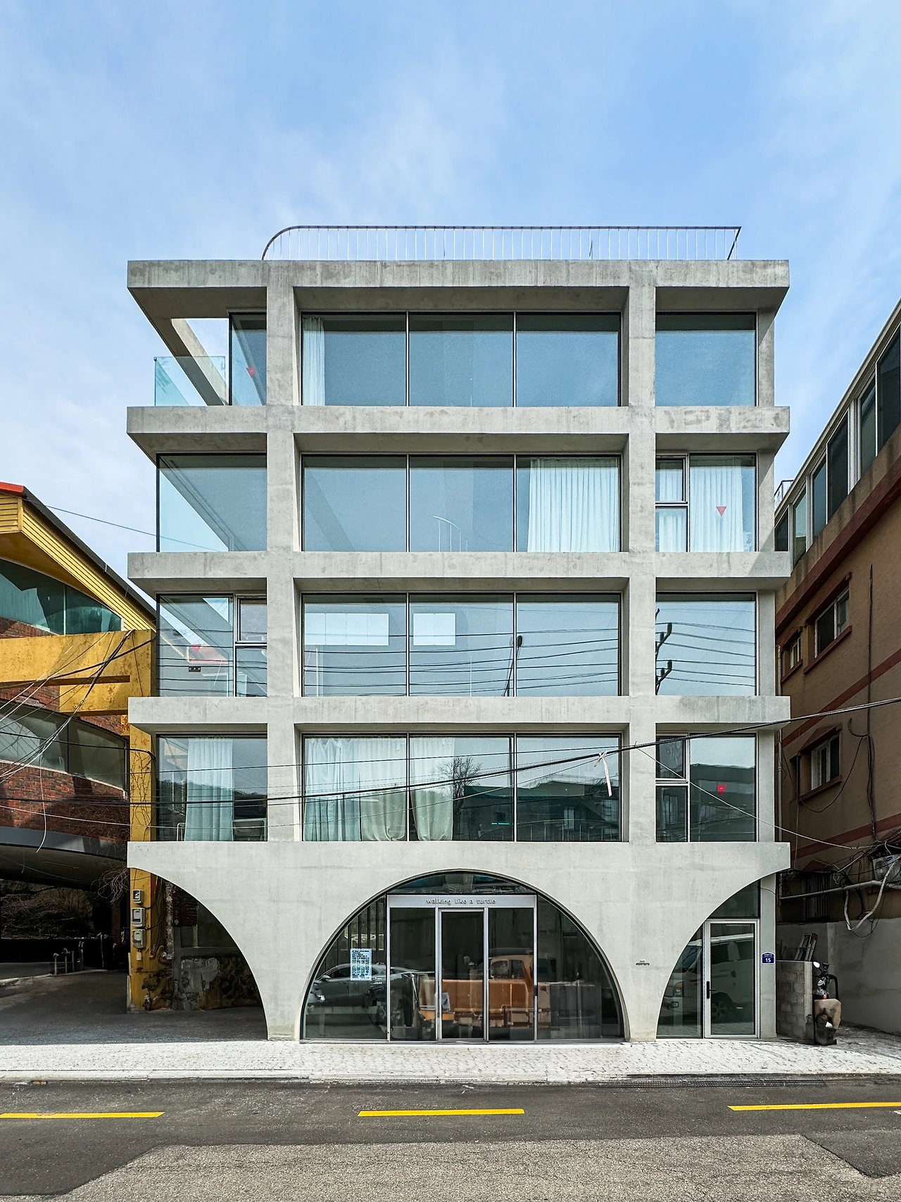 아치형의 1층 구조는 주차장으로 사용되는 전형적인 1층 필로티 구조에 저항한다. 자동차가 아닌 사람이 점유하는 공간임을 암시하는데, 실제로 1층부터 3층까지 외부인도 즐길 수 있는 전시가 열린다.