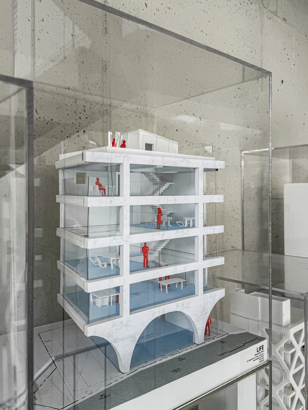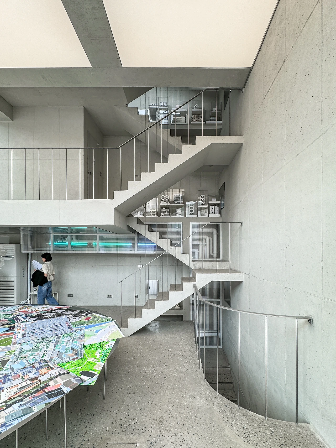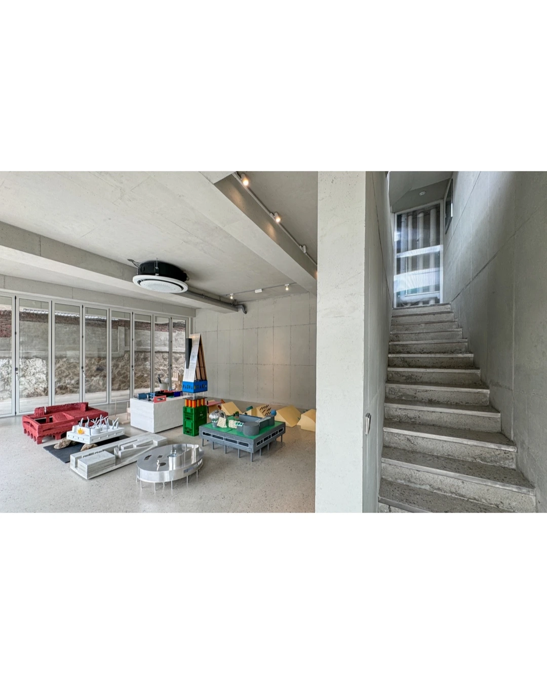 아치형의 1층 구조는 주차장으로 사용되는 전형적인 1층 필로티 구조에 저항한다. 자동차가 아닌 사람이 점유하는 공간임을 암시하는데, 실제로 1층부터 3층까지 외부인도 즐길 수 있는 전시가 열린다.