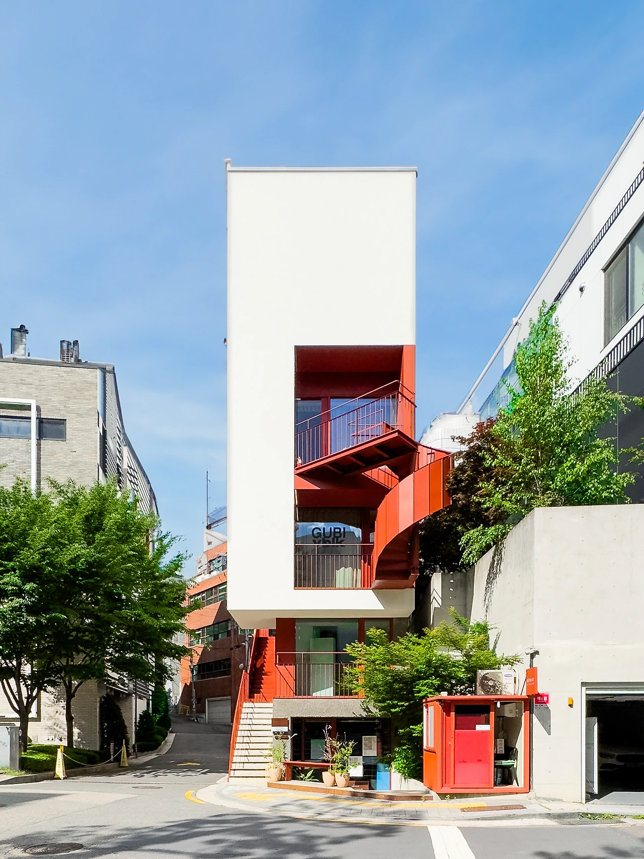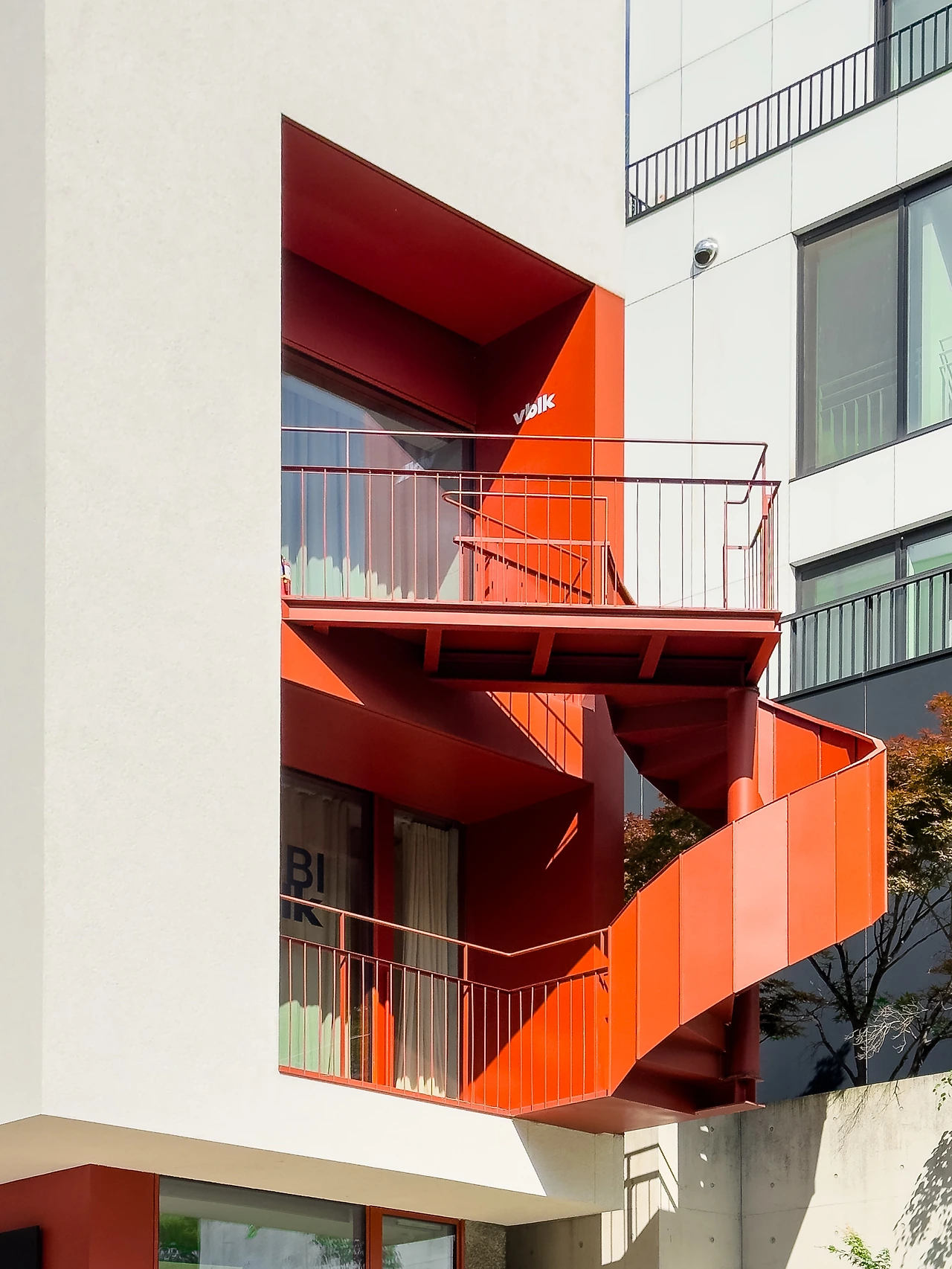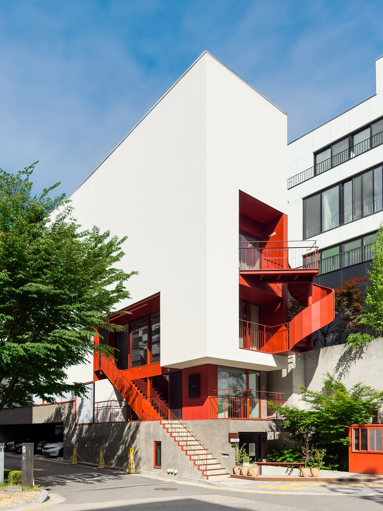 ‘한남 플레이스’는 하얀 껍질 속 붉은 과육을 품고 있다. 갈라진 틈 사이로 새어 나오는 과육은 주변과 대비되어 활기차다. 시원한 단 맛을 기대하고 들어가보면 그 예상은 언제나 그렇듯 빗나간다. 붉은 면과 그 면이 터져 역동성을 강조하는 계단은 우리를 유혹하는 장치일 뿐, 껍질은 콘크리트를 품고 있다. 파고 들수록 과일의 맛은 떫을거라 생각하지만, 이 또한 착각일 뿐이다.