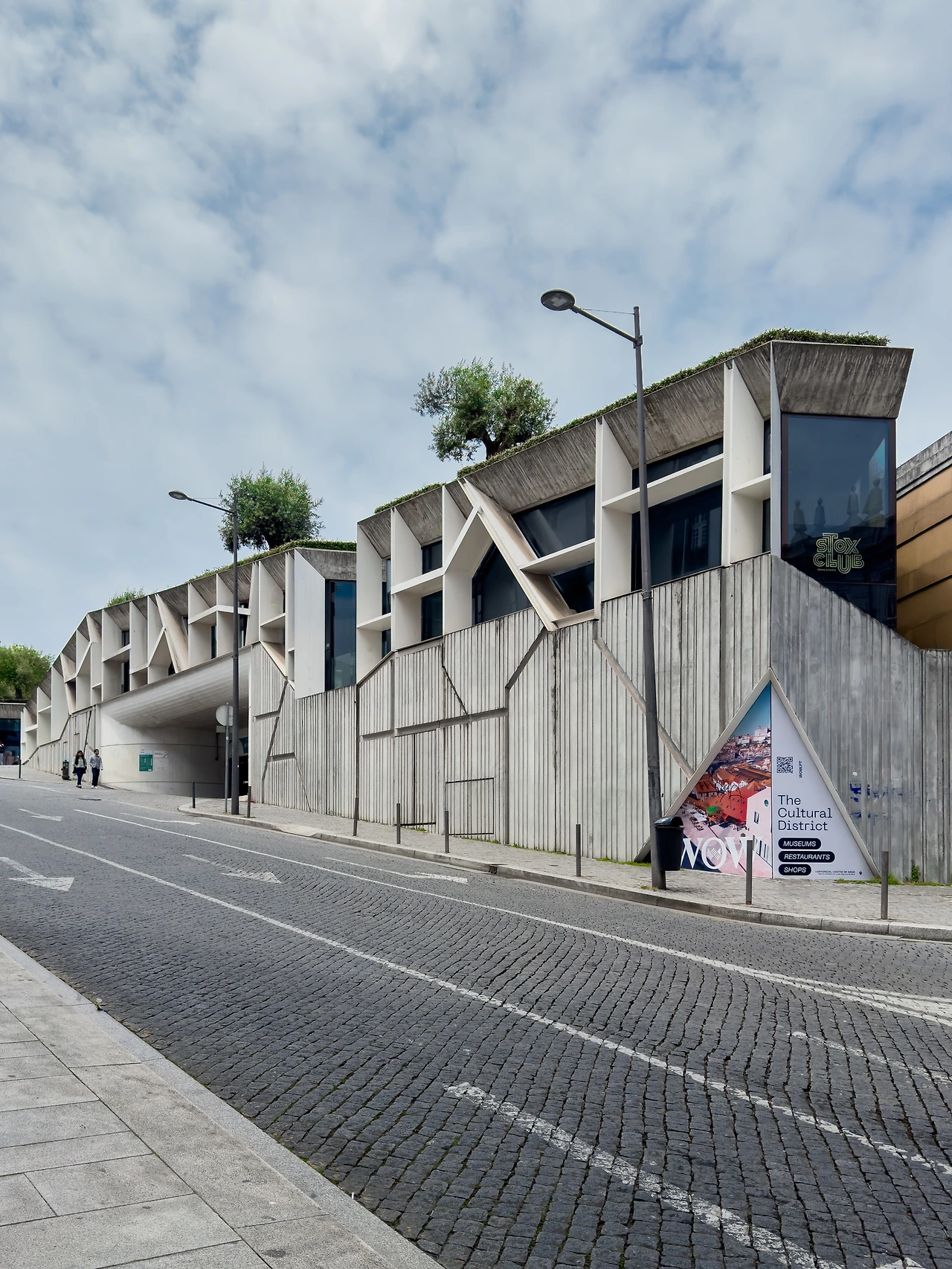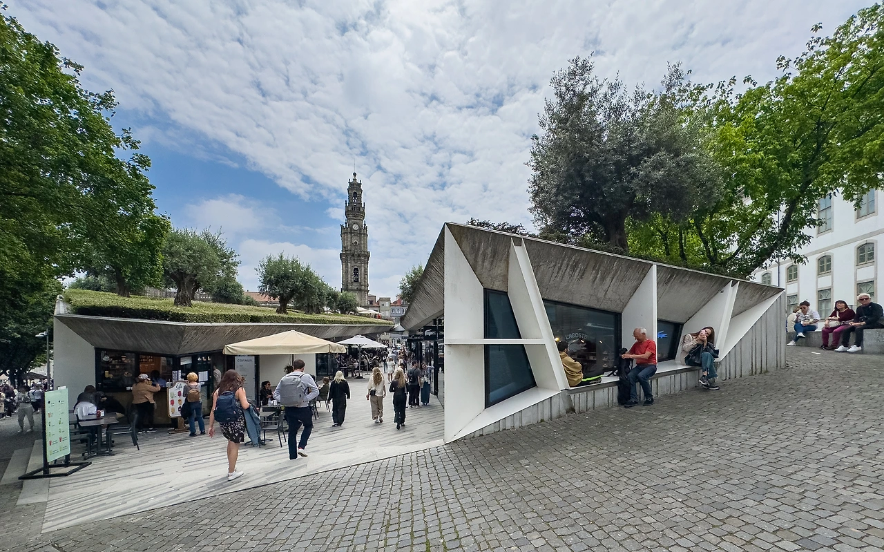 그렇다면 성당 바로 옆, 삼각형 부지에 들어설 현대 건축물은 어떠한 태도와 형태를 취해야 했을까. 답은 자신의 존재를 숨기는 것. 도시를 구성한 건물을 극단적으로 분류해 보자면, 성당과 같은 기념물과 이를 돋보이게 해주는 단조로운 주변 건물이겠다. 후자를 자처하는 ’Passeio dos Clérigos(파세이우 도스 클레리구스 쇼핑몰)‘은 지하 1층의 주차장, 지상 1층의 쇼핑센터, 옥상 정원으로 구성된다. 땅이 융기하며 형성된 지형처럼 자연스럽게 자신을 숨긴다. 그 중심부는 지진으로 땅이 갈라진 듯한 형상을 띤다. 보행로에서 바로 진입하여 입점한 점포로 들어가는 동선에서 복도 천장은 갈라져 축을 강조한다. 틈 사이로는 클레리구스 성당의 종탑이 위엄을 뿜어낸다.