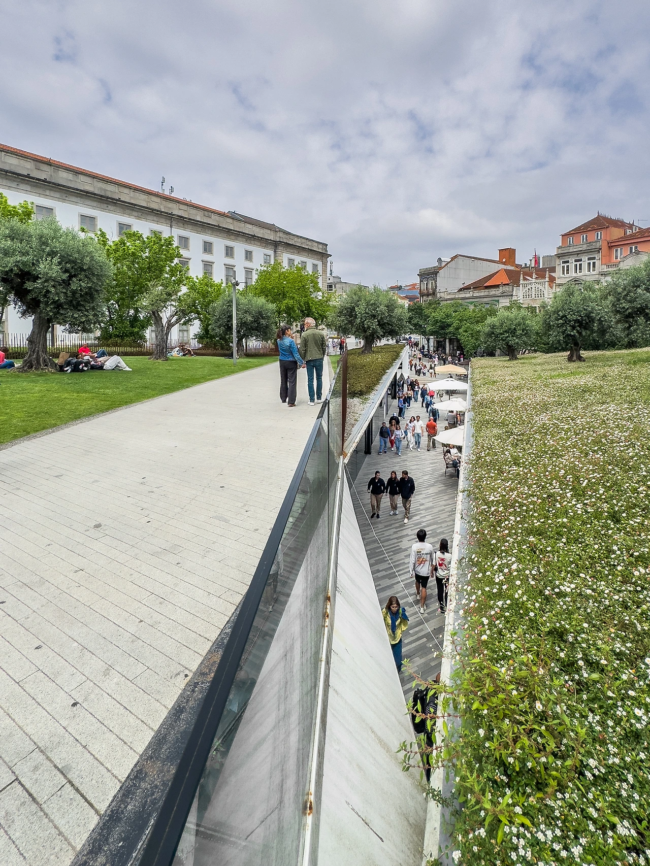 언덕 지형에 있는 건물이기에 보행로는 지상 레벨이 가장 높은 성당 쪽 꼭짓점 부분에서 옥상 정원과 바로 연결된다. 맞은편 ‘Jardim da Cordoaria’ 공원과 자연스레 연장되어 도시의 흐름을 방해하지 않고 시민들에게 휴식처를 제공한다. 정원의 일부는 상업 시설로 구획하여 수익성도 확보했다. 낮은 지상 레벨로 갈수록 높아지는 옥상정원을 통해 확장된 도시 경관을 경험해 볼 수 있다.