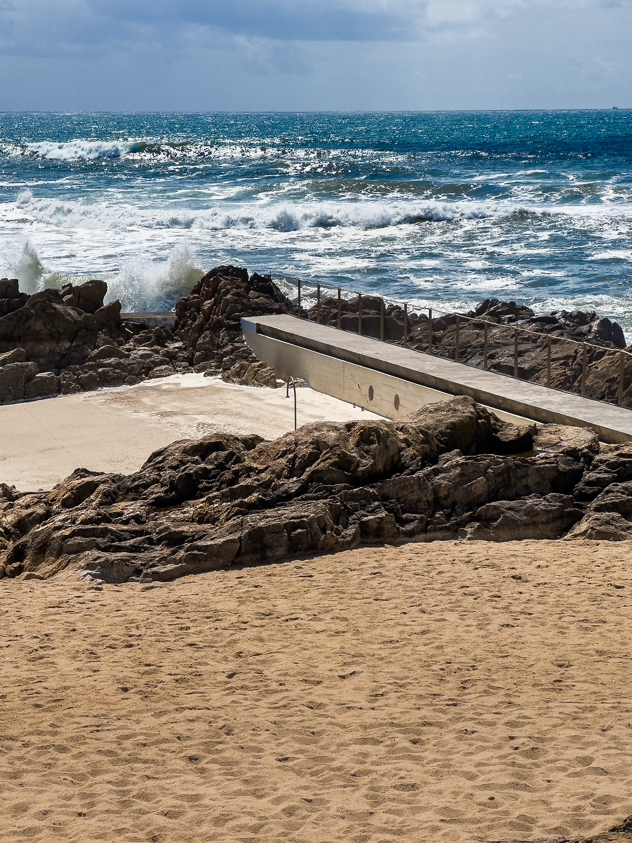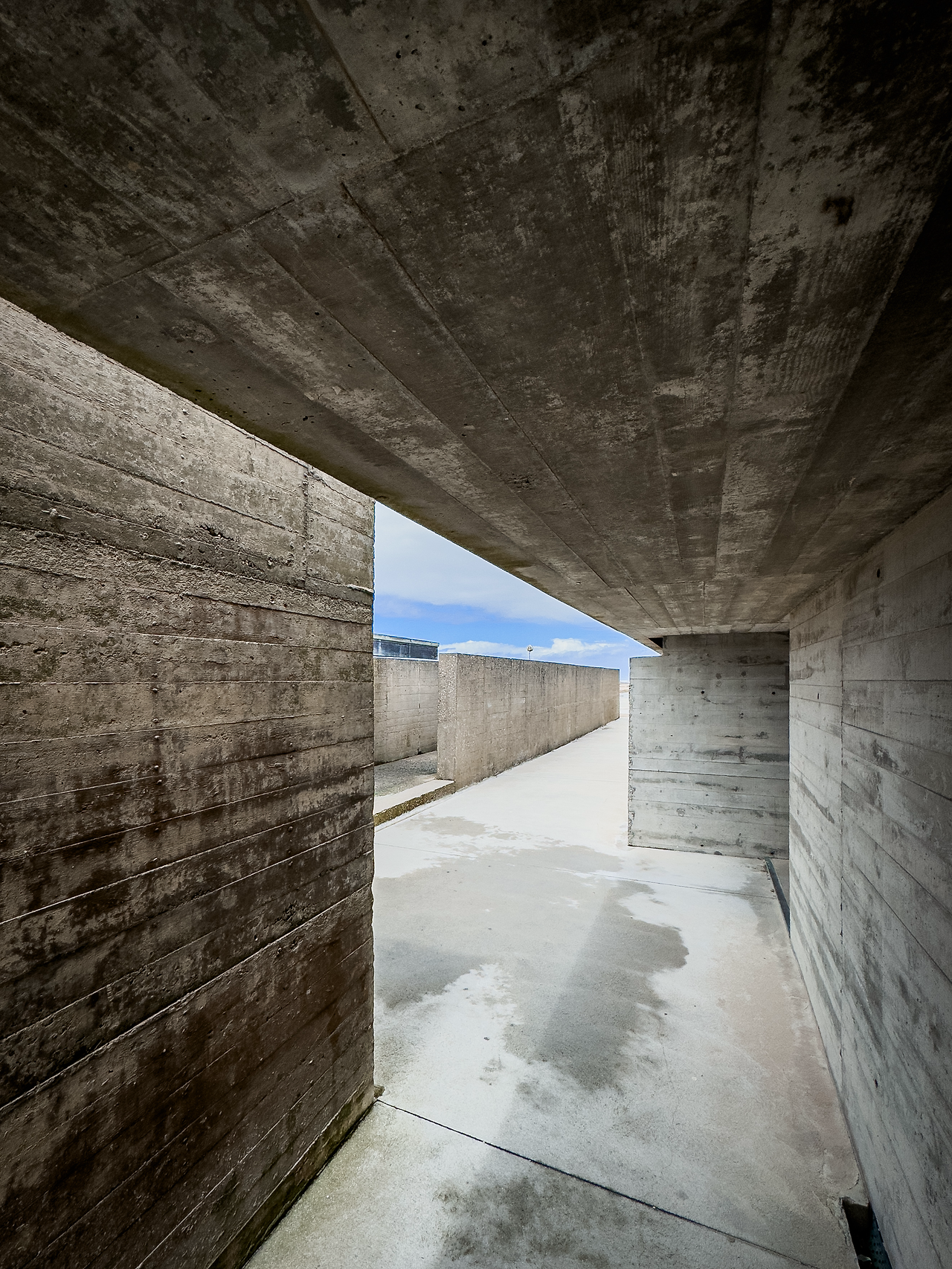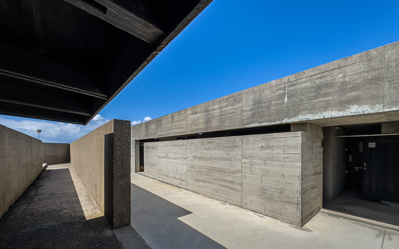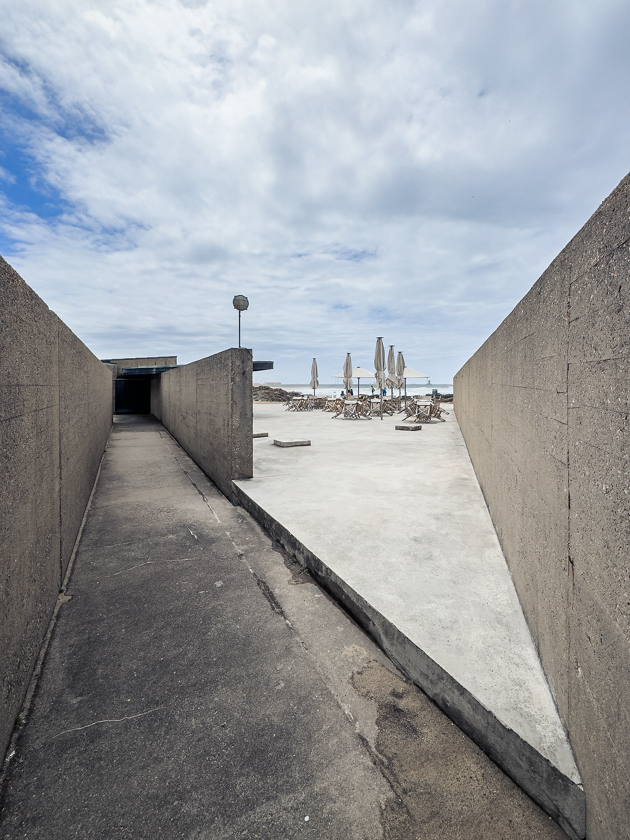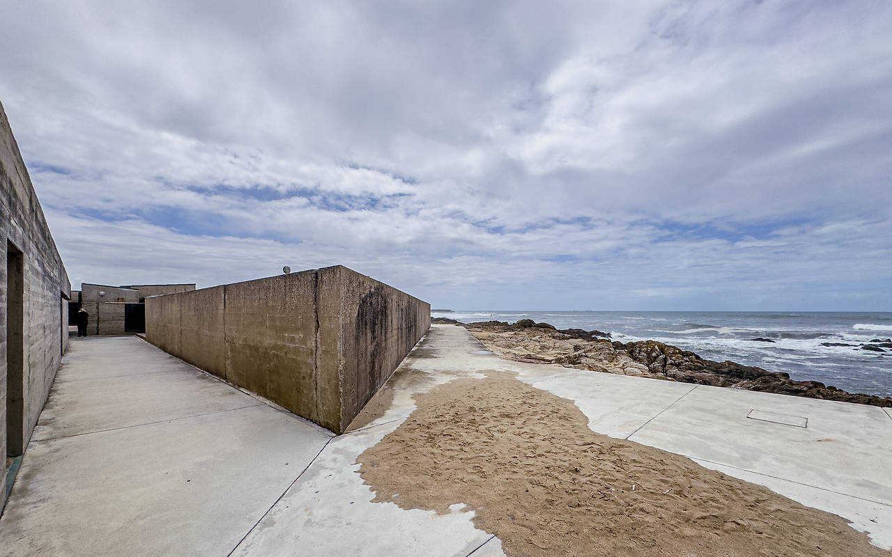 레스토랑과 비슷하게 이곳의 진입 또한 바다를 감추면서 시작한다. 경사로를 타고 해변으로 내려간다. 벽과 지붕이 풍경과 빛을 적절히 걸러주며 바닷소리만이 공간을 채운다. 다른 점은 해안도로와 평행하게 켜켜이 나열된 벽이 평면상의 그리드를 만들며 기능적으로 공간을 구획했다. 각 실은 지원 시설과 통로가 된다. (보아 노바 레스토랑과 비슷하게 필요한 실들을 덧붙여나간 인상이 강한데, 이는 도로로 침범할 수 없는 사이트의 제약 때문일 것이다.)
