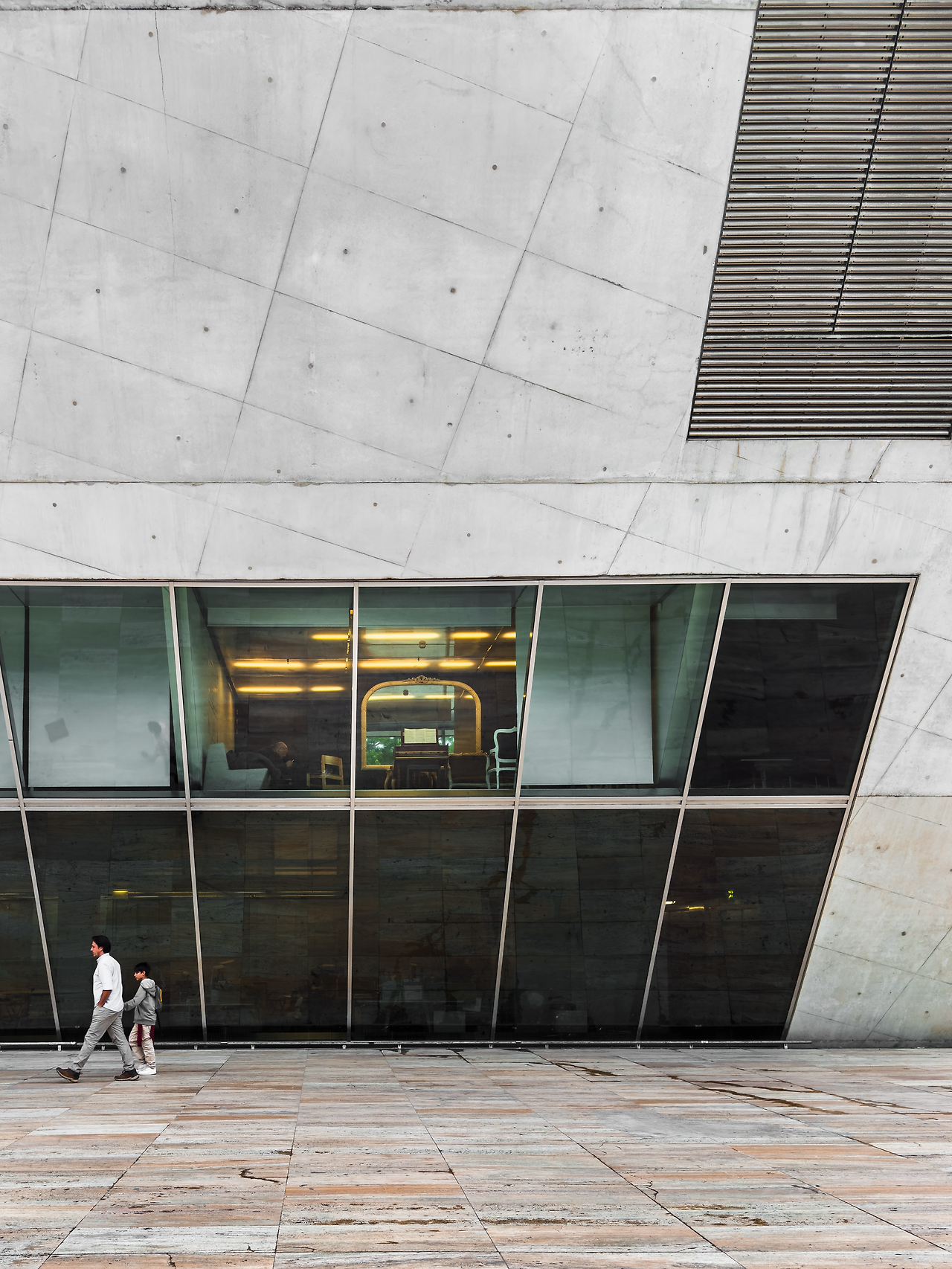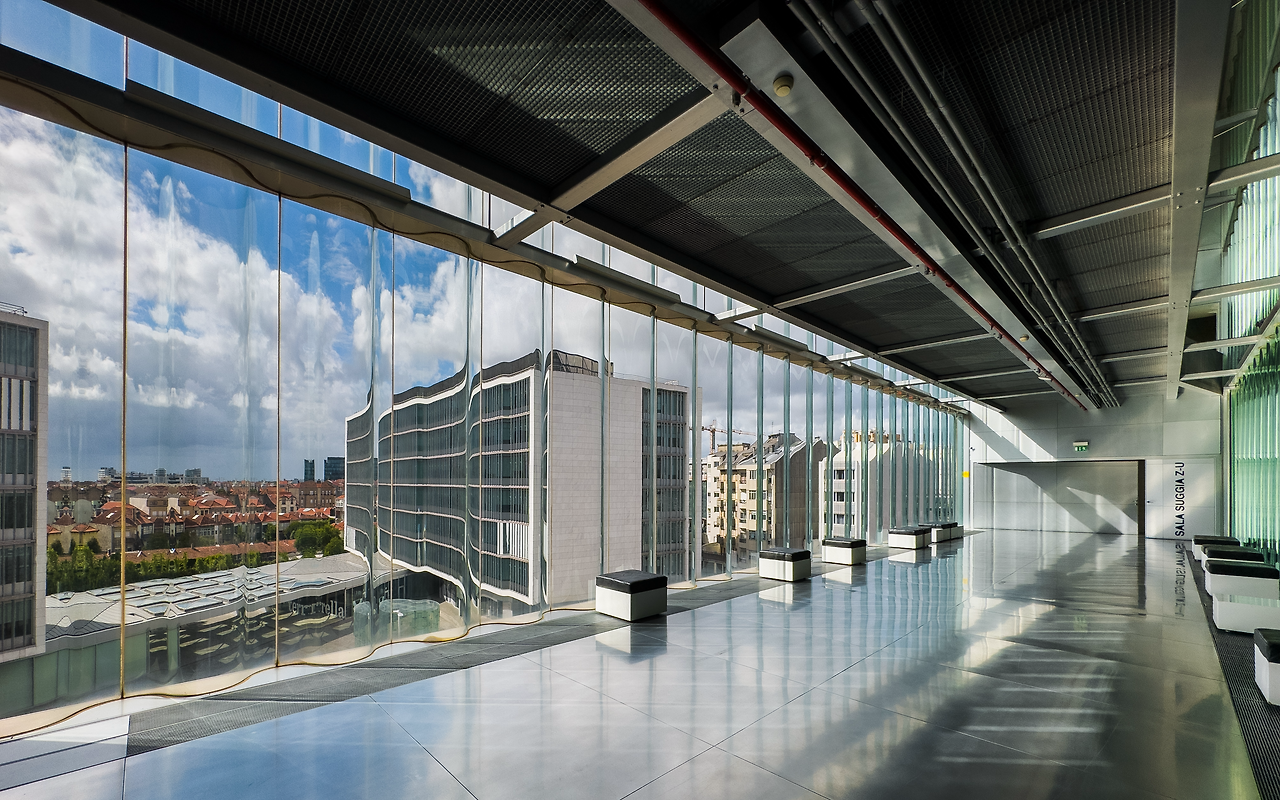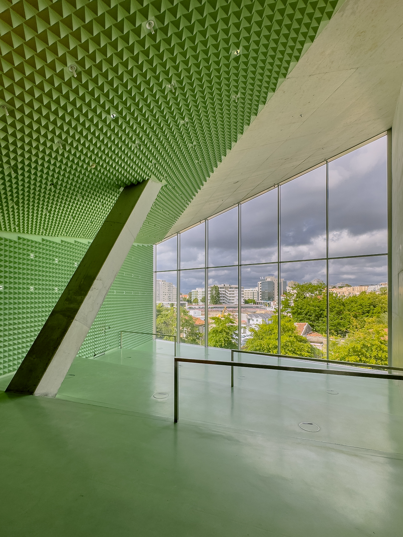 건물은 아래로 갈수록 좁아지는 형상이다. 메인 콘서트홀인 ‘SALA SUGGIA’를 음향에 가장 효과적인 직육면체로 계획하고 소규모 공연장과 서비스 공간을 메인 홀 옆과 아래에 덧붙였다. 각 실은 경사로를 통해 순차적으로 이어진다. 그래서 관람객은 2층 접수처에서 출발하여 모든 공간을 둘러보게 된다. 자연스레 메인홀과 중첩된 면은 창을 뚫어 리허설을 감상할 수 있도록 했다. 그뿐만 아니라 배우의 대기실 창은 광장을 향해 뚫려있어 보행자와 시선을 공유한다. 이처럼 건물 내 창은 단순히 빛과 조망의 용도를 넘어 경계 허물기의 중요한 요소로 작동한다.