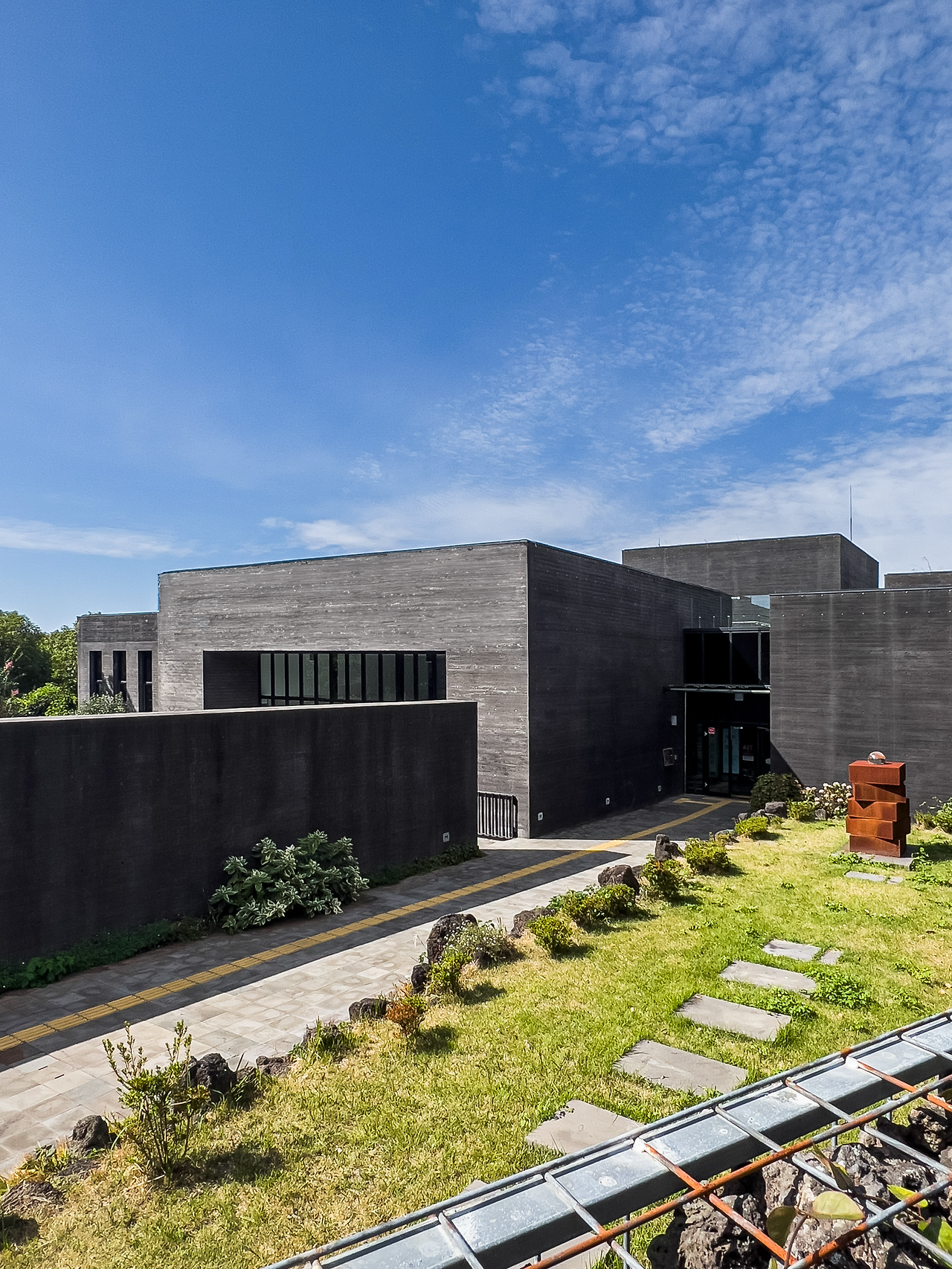 미술관을 한 바퀴 돌고 중정인 빛의 정원으로 나선다. 바닥은 물로 덮여 있고 세 개의 물방울 조각이 거석 위에 얹혀 있다. 경사로를 따라 올라가며 바라본 조각은 빛을 반사하여 반짝이거나 하늘을 담아 푸르게 물든다. 수공간은 하늘을 비추다가 그 아래 검은 자갈을 드러내어 우리를 투영하기도 한다. 때로는 제주의 거센 바람에 표면은 일그러져 어떠한 형체도 담지 못할 것이다. 건물의 유일한 여백인 정원에서 다양한 시선을 느끼며 여유를 만끽한다.