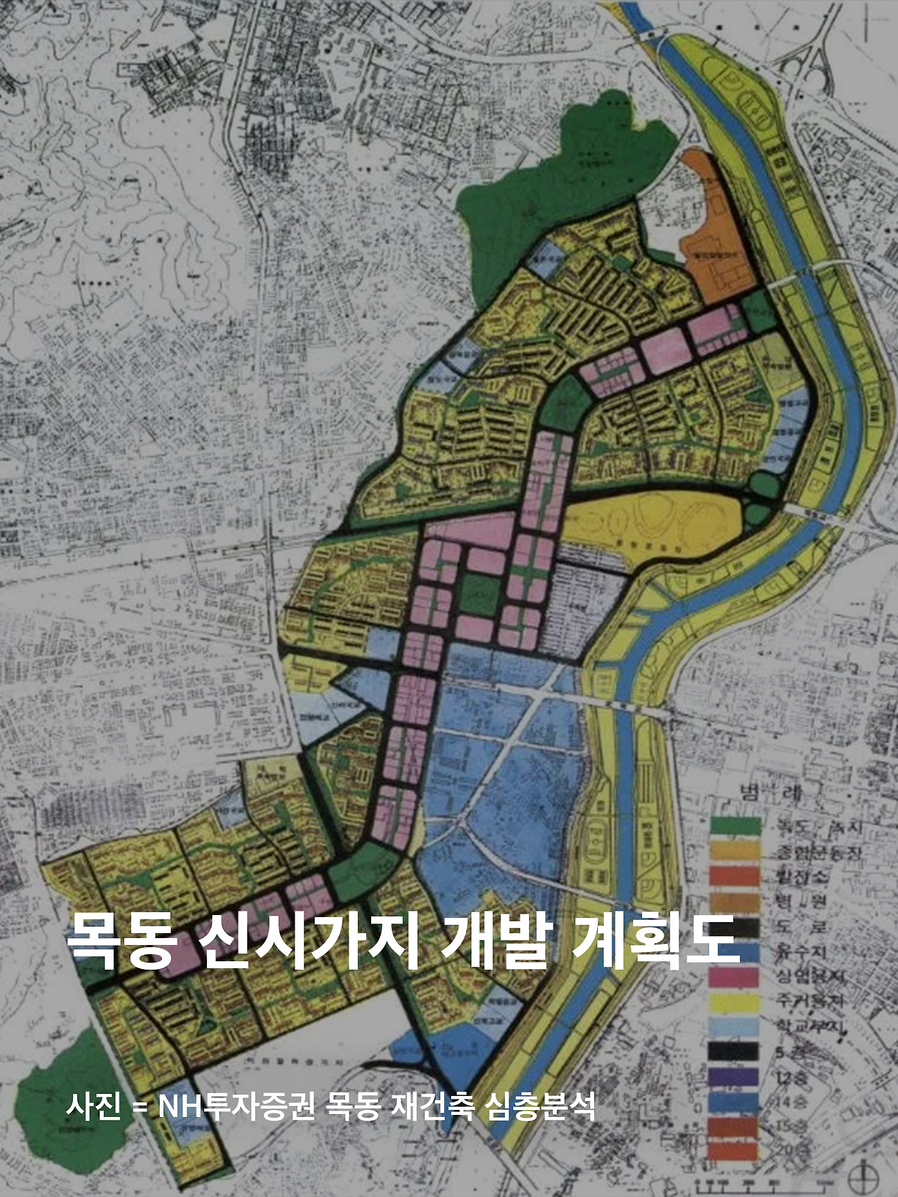 목동 신시가지 개발 계획(1980)에서는 첫 도시 계획 때보다 경제적이고 현실적으로 접근하였습니다. 공원을 일정 간격으로 배치하고 그 사이사이를 상업 단지와 공공시설이 채우는 두 개의 선형 구조가 오목공원에서 만납니다. 그 구조를 일방통행 4차선 도로가 감싸고 그 밖으로 다시 주거 단지가 감싸죠. 차량 통행이 원활하고, 보행자는 쉽게 공원에 접근할 수 있죠. 걷기 좋은 도시를 실현한 것입니다.