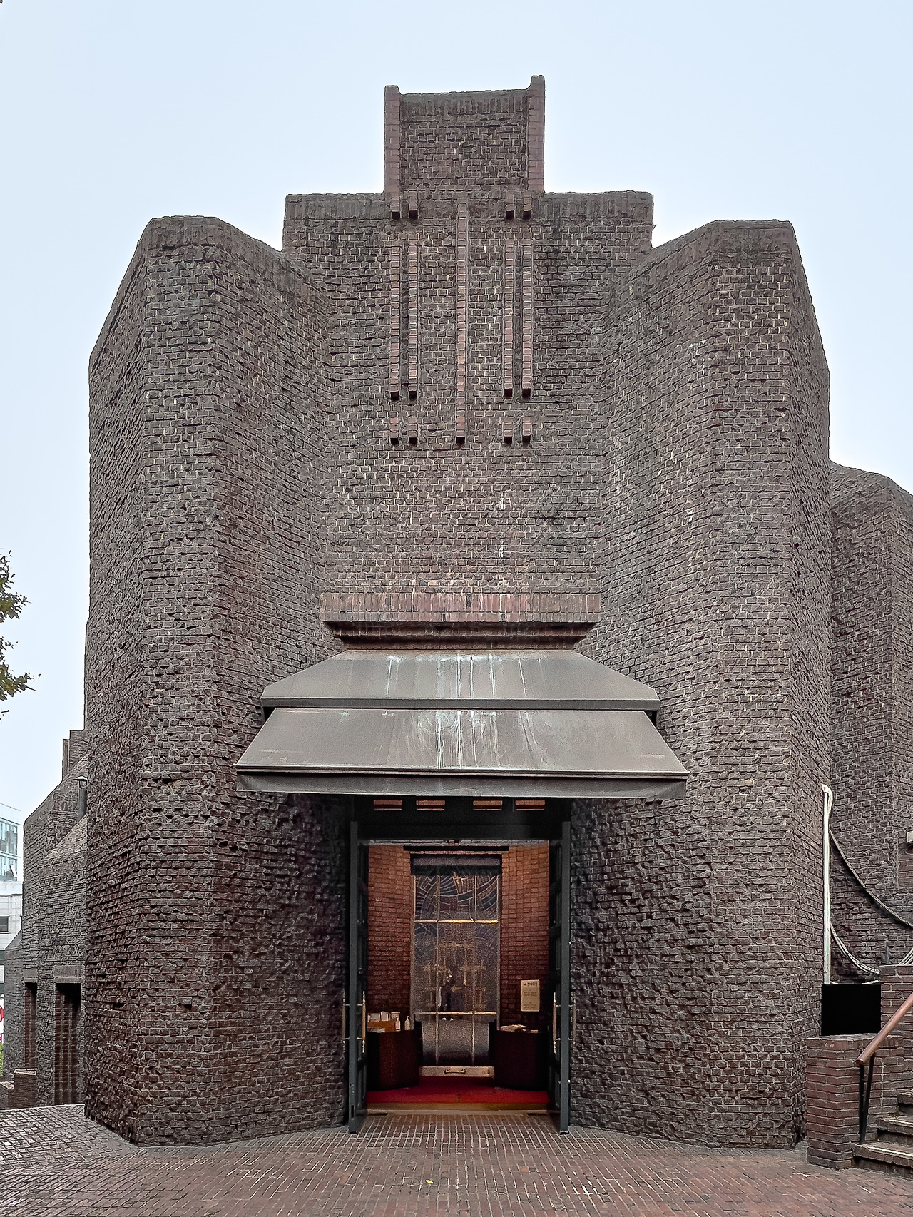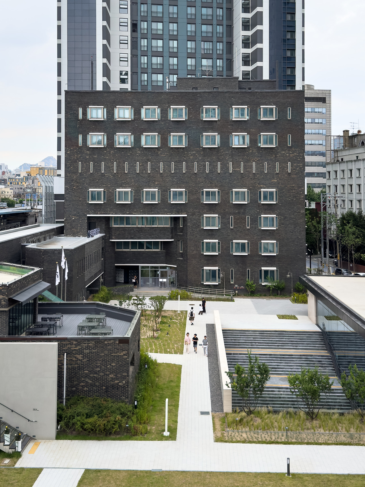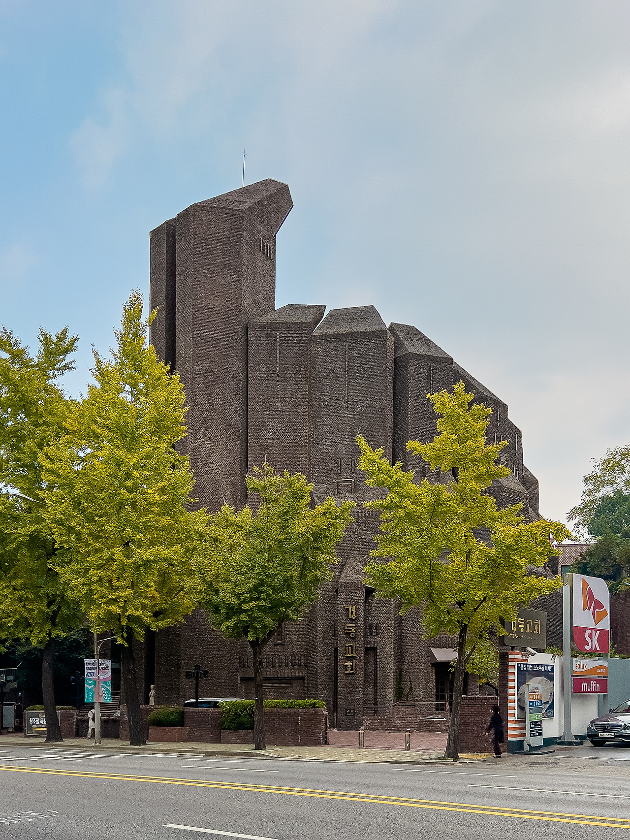 경동교회는 폐쇄적입니다. 문과 창 몇 개가 전부인 1층을 제외하고는 눈에 띄는 개구부가 없어 교회로 보이지 않죠. 자연스레 건물 앞마당으로 들어갈 용기가 생깁니다. 건물과 담장은 같은 붉은 벽돌로 둘러싸여 위요감도 있고 누군가가 나를 지켜보고 있지 않을까 하는 두려움도 없기 때문이지요. 자연스레 마당을 경험하면서 사람들은 폭이 넓은 계단을 오르고, 벽에 붙여진 모자이크 타일을 감상하며 건물의 용도를 짐작합니다. 그러나 본당 입구를 마주하게 되었을 때는 건물의 비대칭은 보이지 않고 좌우대칭의 건물이 사람들을 압도하기 시작합니다. 마치 성스러운 공간에 들어서기 전, 옷매무새를 다듬으라 말하는 것 같죠.
