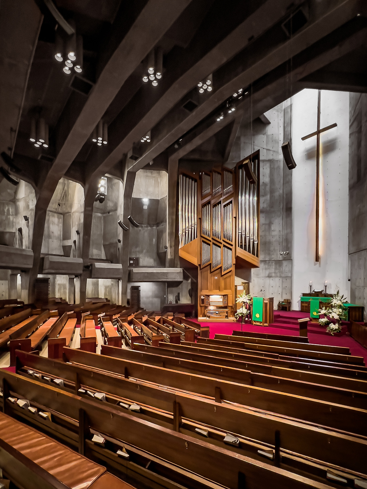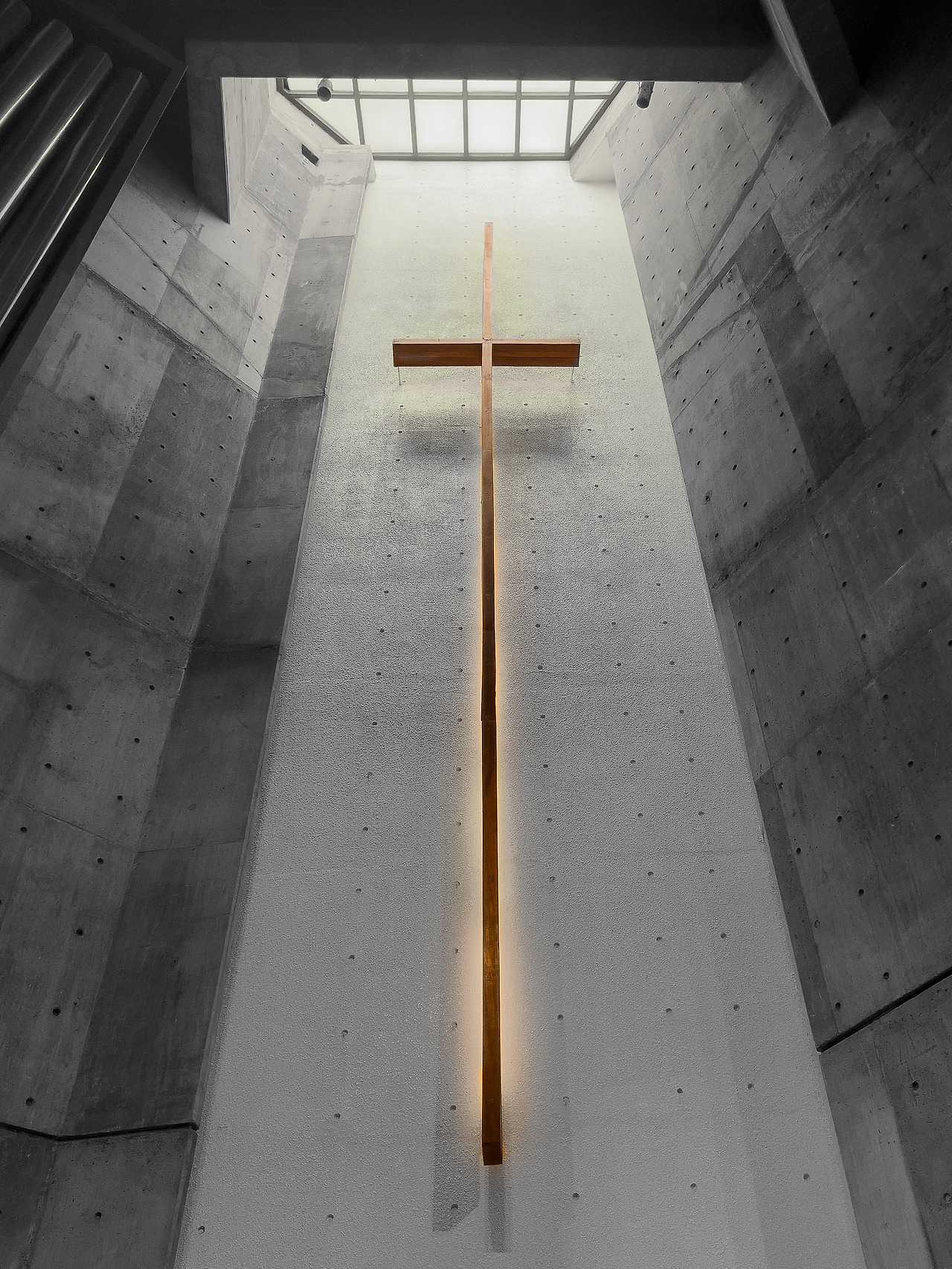 본당은 벽돌로 마감된 외부와 달리, 노출 콘크리트로 장엄함을 극대화합니다. 대공간을 형성하기 위해 드러나는 구조는 기둥, 보가 일체화되어 유기적인 형태를 띠고, 이것이 반복되어 공간에 리듬을 부여합니다. 천장 곳곳, 십자가 위에 뚫린 작고 큰 개구부에서만 빛이 들어와 사람들은 십자가에 집중하게 되며, 자연스레 종교인은 그들의 믿음을, 일반인은 자신을 성찰하죠.