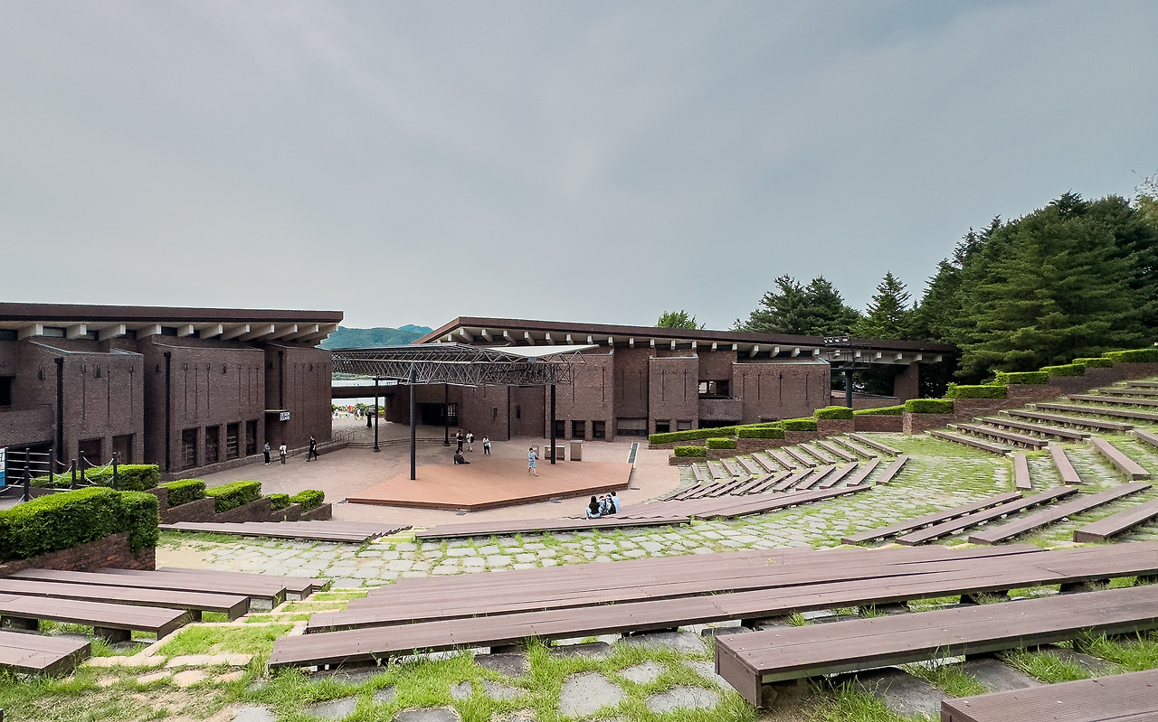 야외무대 뒤 언덕을 오르면 건물의 전체적인 모습을 볼 수 있죠. 외곽으로 갈수록 낮고 작아지는 건물 위로 이형의 박공지붕 또한 면적이 좁아져 비행기의 날개처럼 보입니다. 둔탁한 건물만큼 두꺼운 지붕은 건물을 완전히 덮지 않죠. 금방이라도 떨어져 나가 의암호를 향해 비상할 것만 같습니다. 마치 어디로 튈지 모르는 아이들처럼 말이죠.