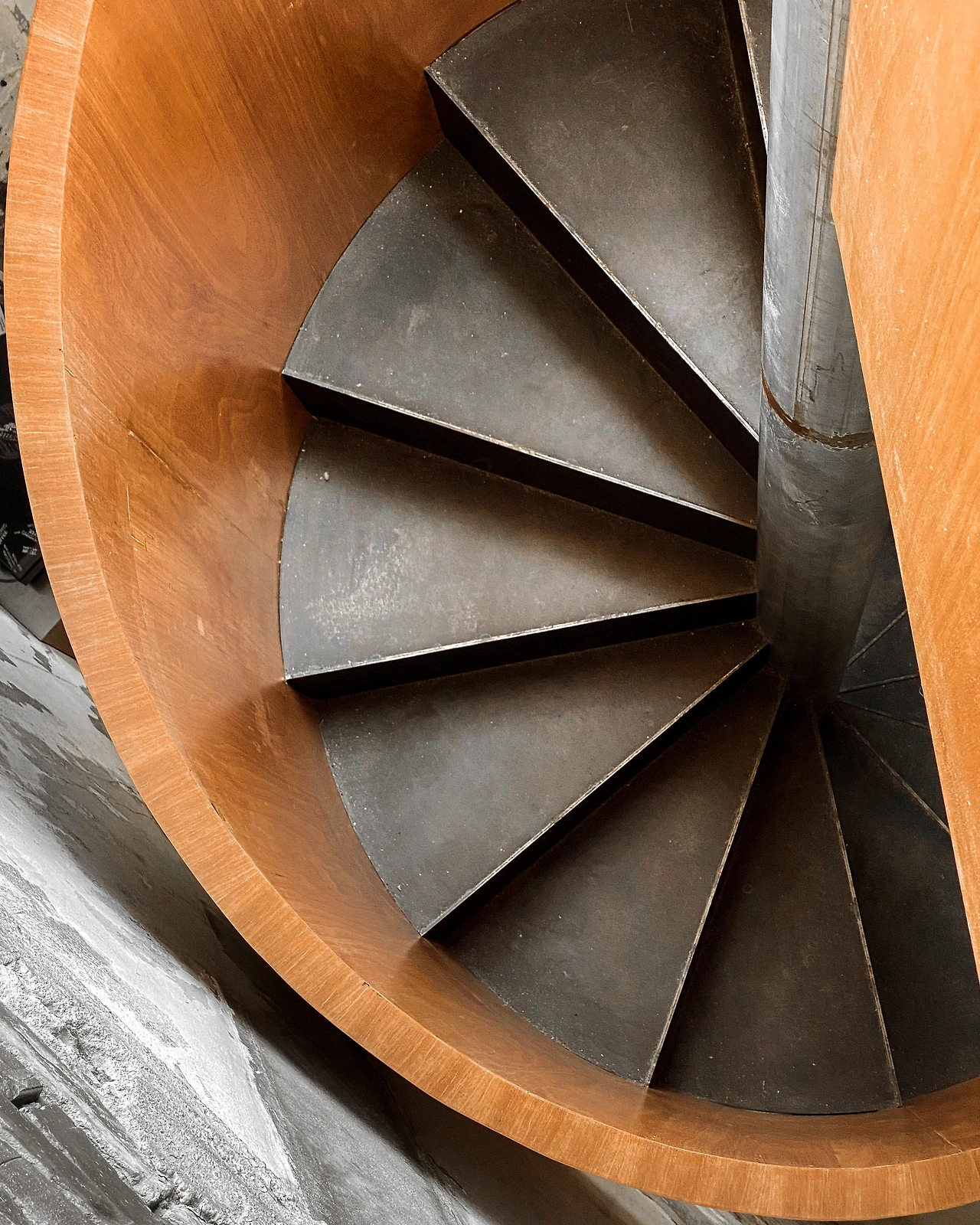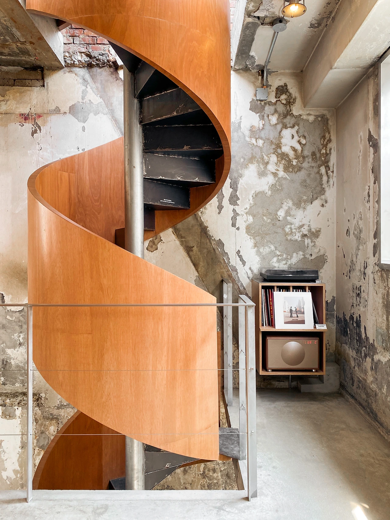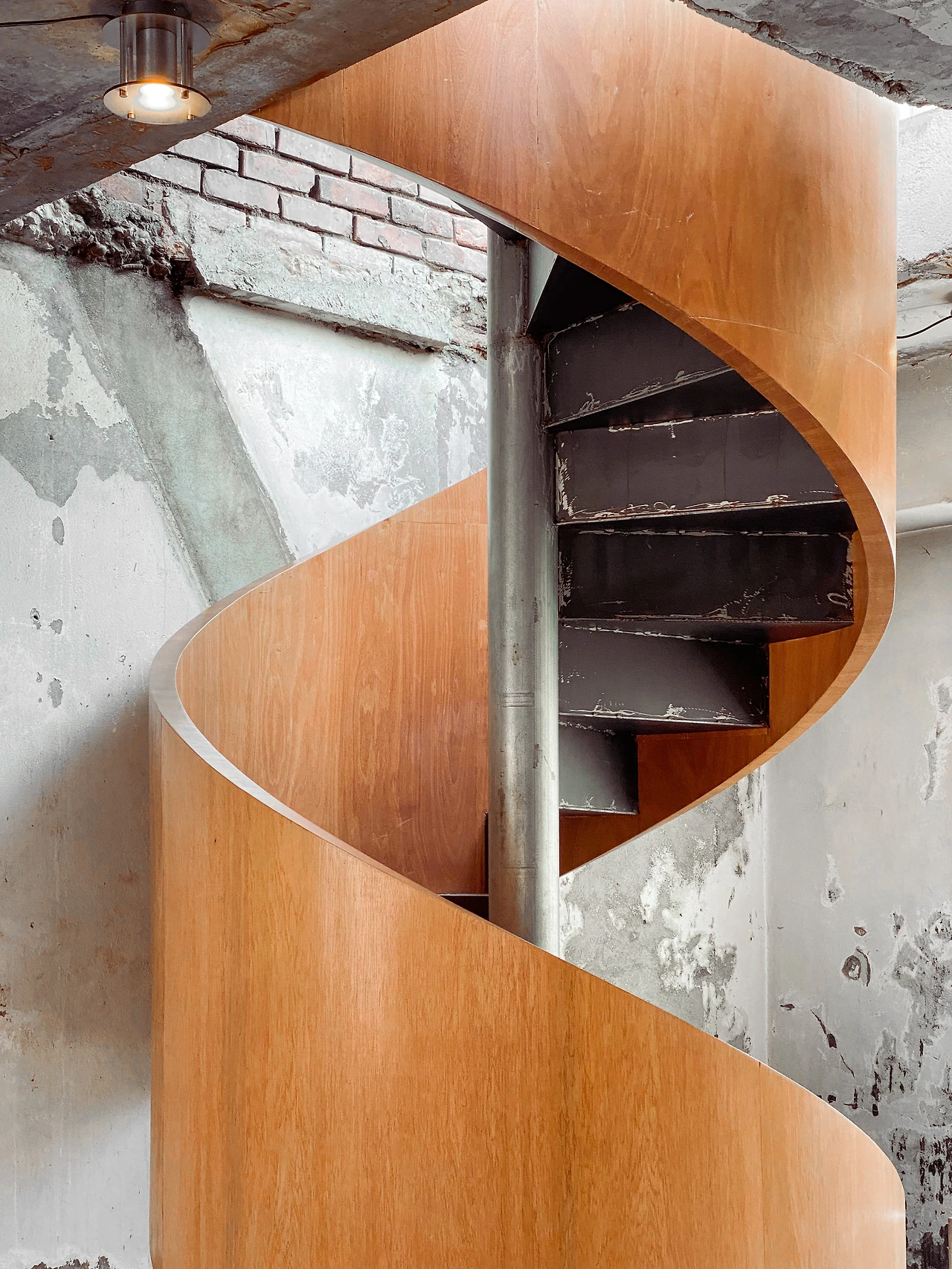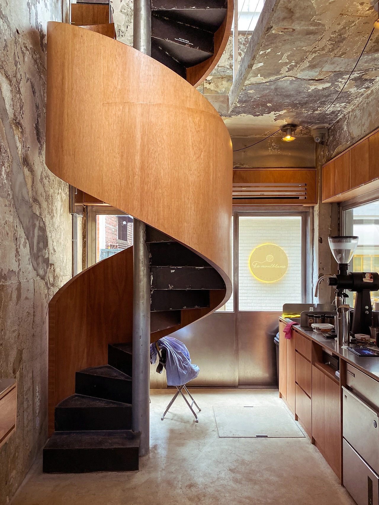 1층의 면적은 굉장히 좁다. 여러 사람이 머무르기에는 답답할 정도인데, 이곳은 이런 열악한 환경 속에 2층, 3층까지 오르내릴 수 있는 계단까지 필요한 최악의 조건이었다. 우리가 흔히 사용하는 비상용 계단 형태를 이곳에 적용하게 되면 그만큼 1층의 면적을 잡아먹게 되고, 그렇다고 외부에 설치하자니 미관상, 안전상의 여러 문제로 불가능했을 것이다. 그렇게 해서 나온 아이디어, 건축 디자인이 원형 계단이다. 기존의 계단과 달리 원형 계단은 사람이 이용할 수 있는 폭만 확보가 된다면, 이 자체로 굵은 기둥이 되어 좁은 공간에 많은 부피를 차지하지 않는 장점이 있다.