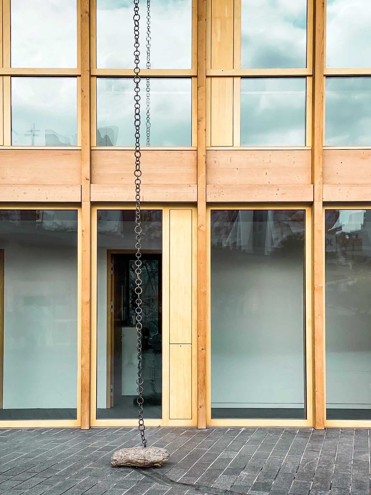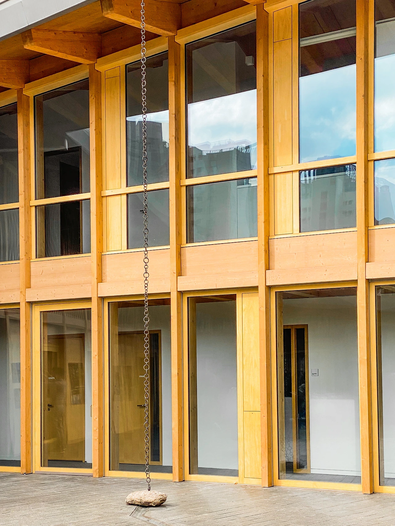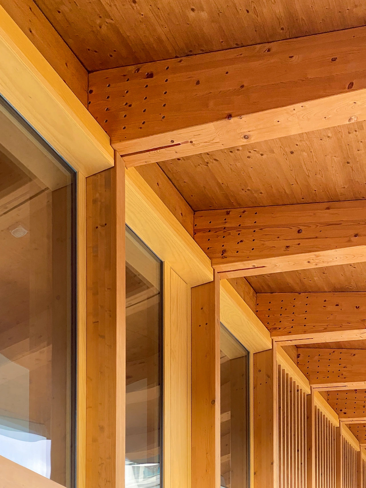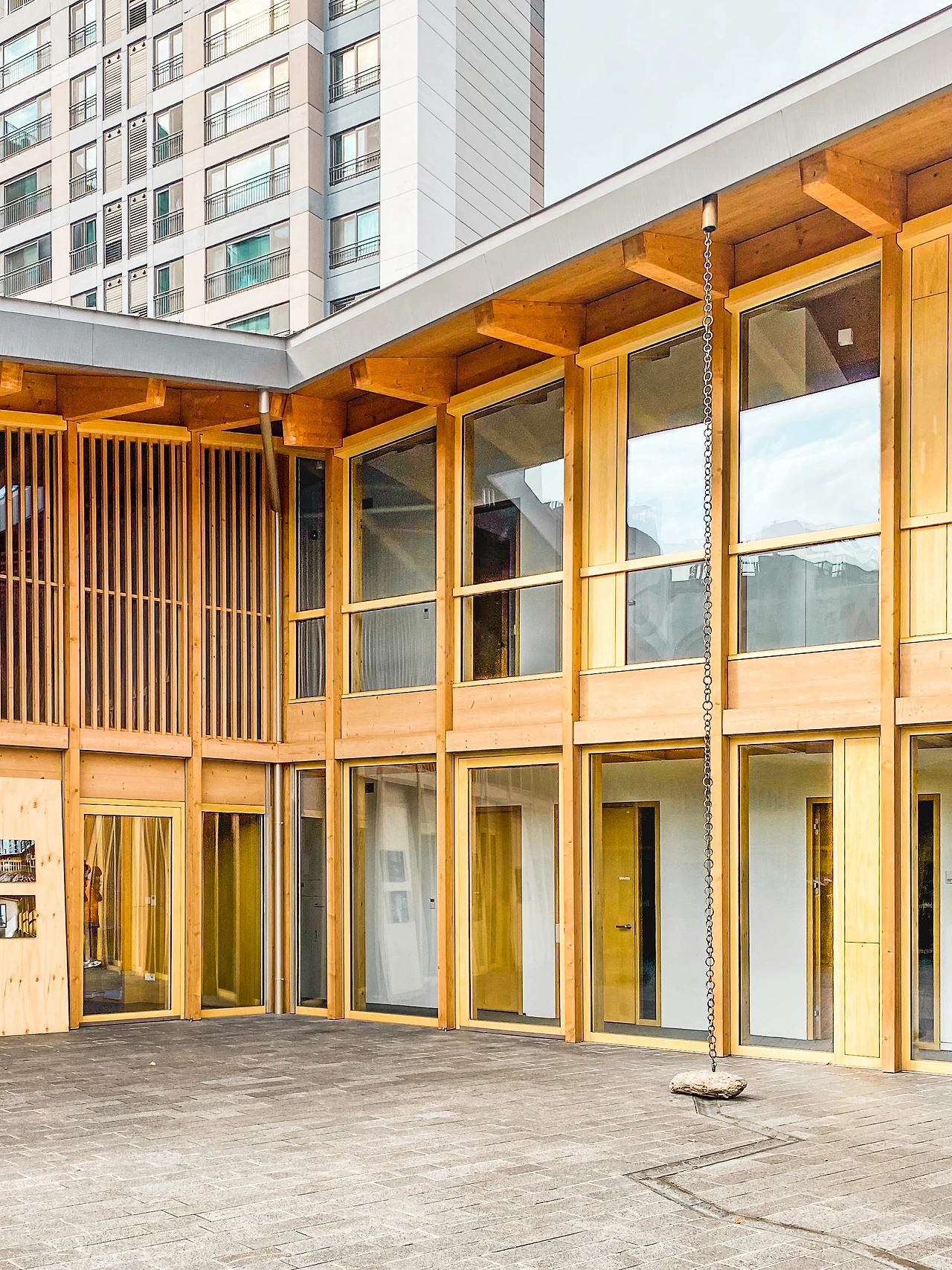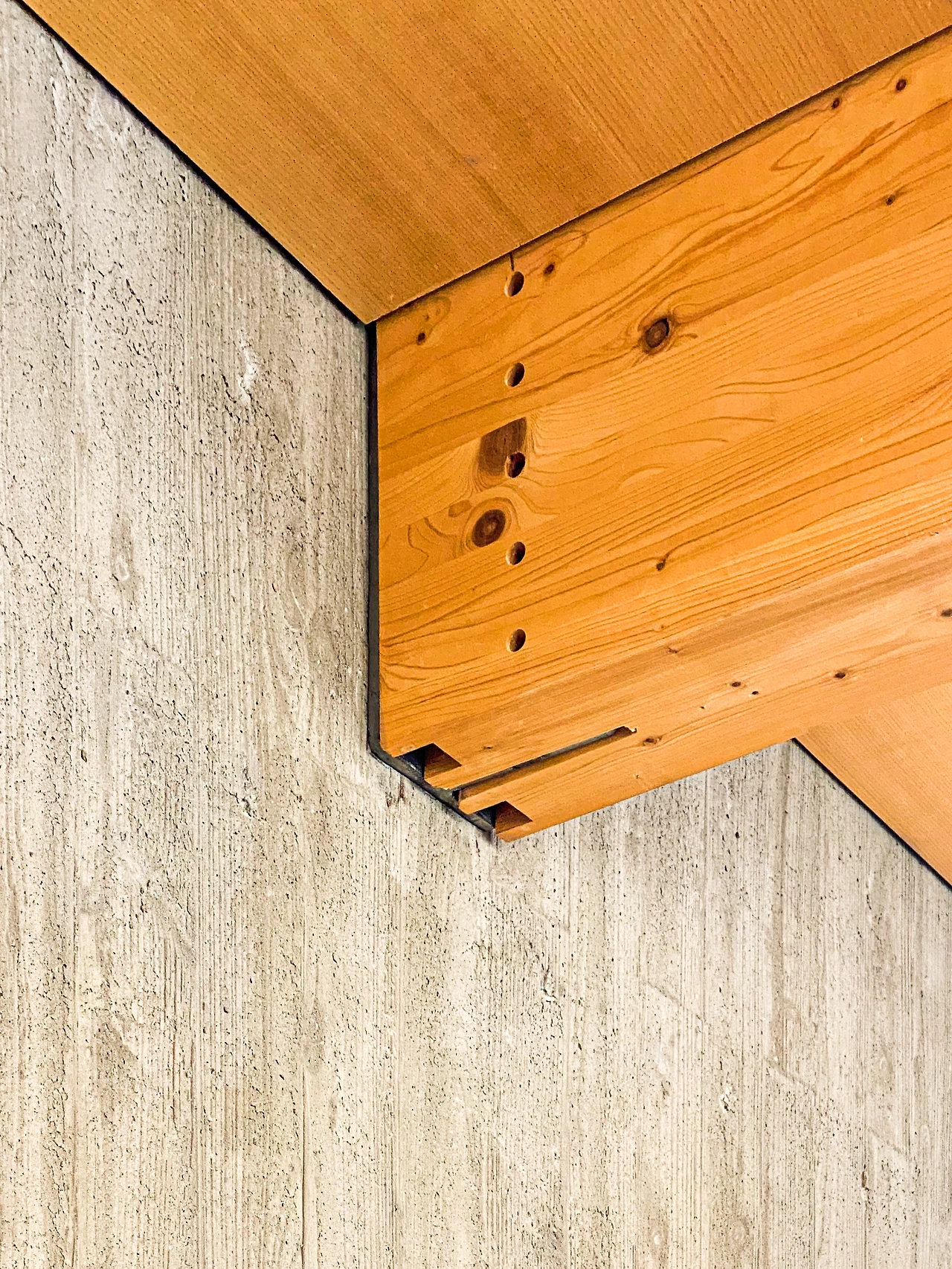 앞에서 설명한 목재 자체가 뿜어내는 분위기, 다른 재료와 만나 만들어내는 또 다른 분위기를 '주한 스위스 대사관'에서 그대로 느낄 수 있다. 여러 작은 각재를 붙여 가공한 기둥과 보와 창틀이지만, 서로 다른 무늬와 조금씩 다른 채도를 가진 나무들이 만나 만들어내는 공간의 분위기, 향, 햇빛에 비춰 보이는 나뭇결이 공간을 풍성하게 채운다. 여기에 콘크리트, 유리, 금속, 석재 등. 다양한 재료와 목재가 만나 이루어내는 디테일은, 보는 이를 즐겁게 한다.