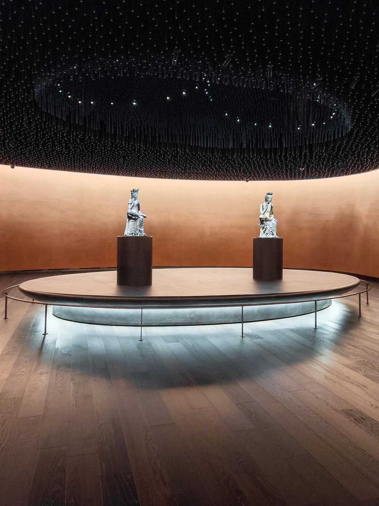 강박에 벗어난 사람들은 시선에 걸리는 선 없이 자유롭게 돌아다니며 어느 방향에서도 반가사유상을 감상할 수 있다. 위치에 따라 변하는 두 상의 모습과 원근감을 가지며 작아지는 다른 상과의 관계를 보기도 하고, 멀리 떨어져 두 상이 뿜어내는 아우라에 심취하기도 하며, 가까이 다가가 표정, 몸짓, 금방이라도 휘날릴 것 같은 옷깃을 바라보며 그 디테일에 놀라기도 한다. 전시대로 수렴하는 모든 것이 그곳에 시선을 머무르게 하지만, 수평, 수직하지 않는 모든 것이 사람들을 이리저리 돌아다니게 한다. 두 상이 가진 움직임을 공간이 관람객에게 그대로 부여하고 있다.