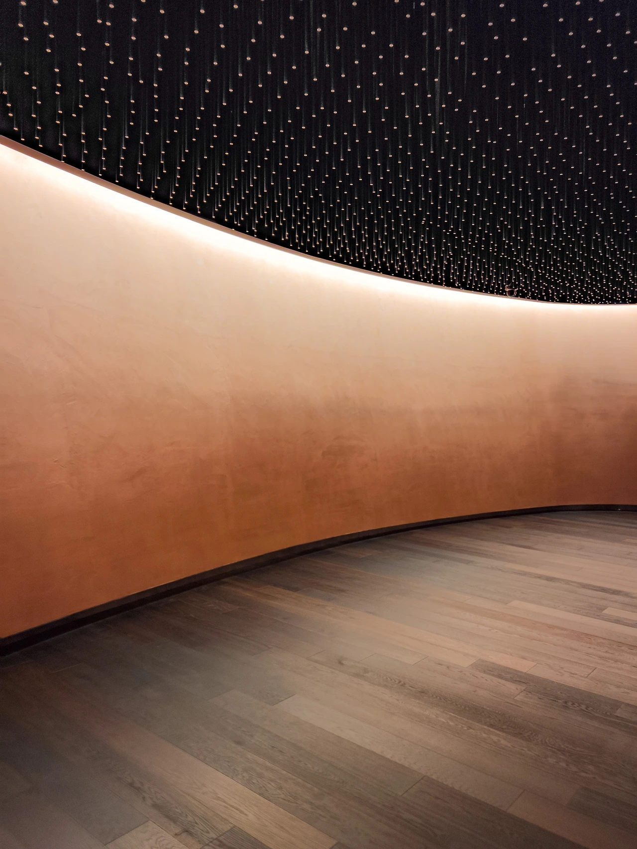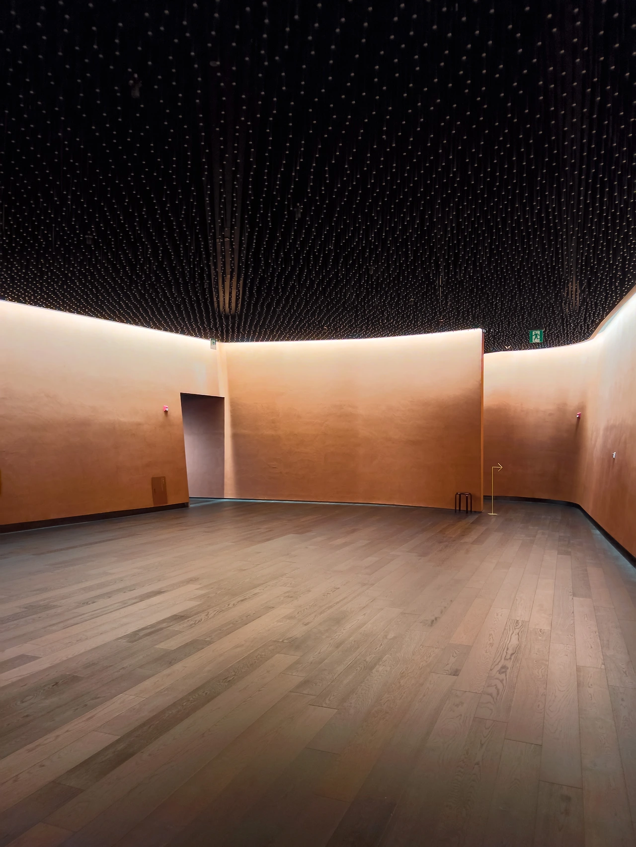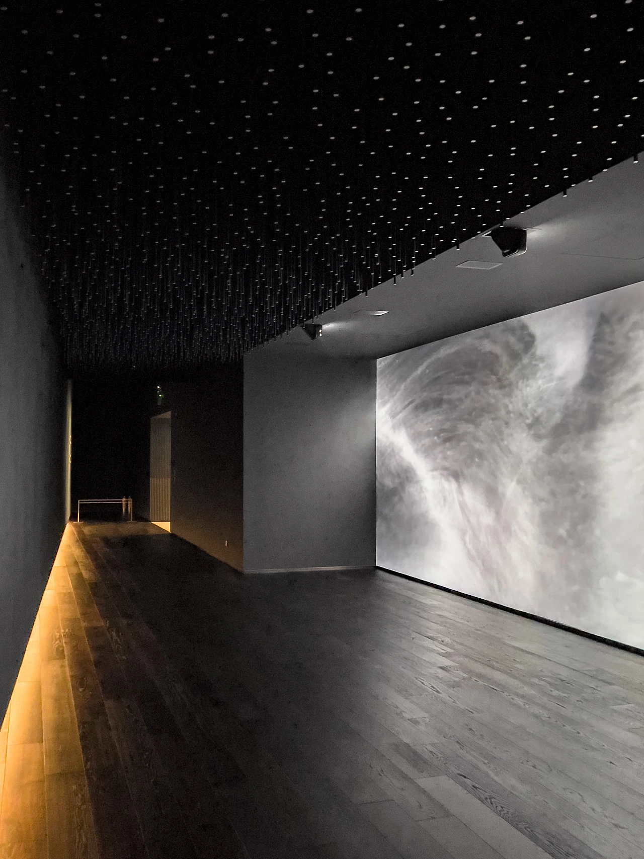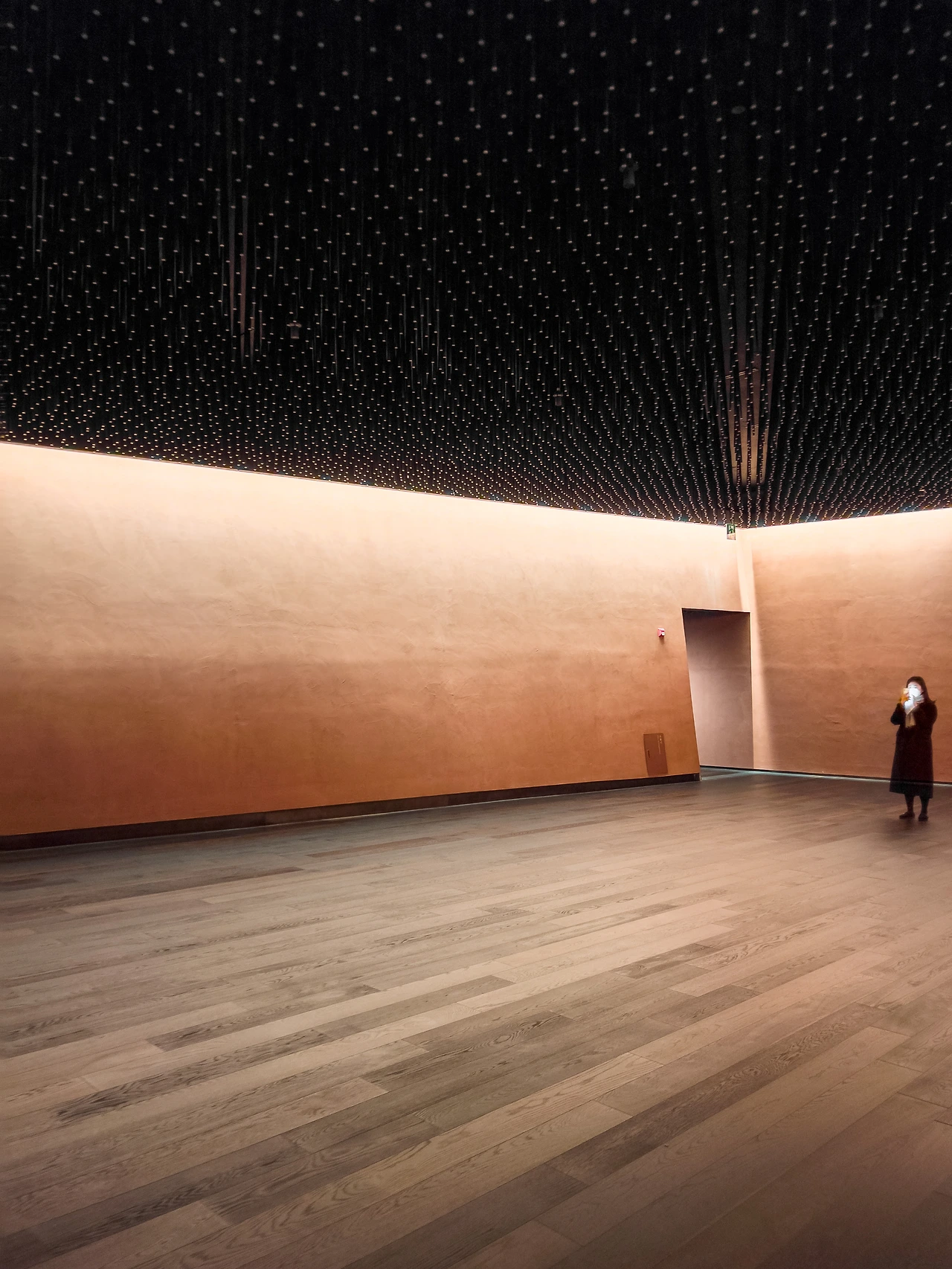 밖과 대비되는 전시장 복도를 걸어가면 미디어 작품이 어두컴컴한 복도를 비춘다. 물인지, 아니면 안개인지 구분되지 않는 흑과 백의 대비로 시선을 사로잡는 작품을 보고 있노라면 몽환적인 세계에 발을 들여놓은 것 같다. 흙과 편백, 계피를 섞어 발라 안정된 향을 풍기는 붉은 벽은 기울어져 있다. 그 벽을 타고, 미세하게 높아지는 바닥을 타고, 무수히 많은 별을 연상시키는 2만여 개의 봉이 달린 천장을 타고. 그것들을 타고 수렴하는 시선의 끝에는 우리의 국보 반가사유상이 자리한다.