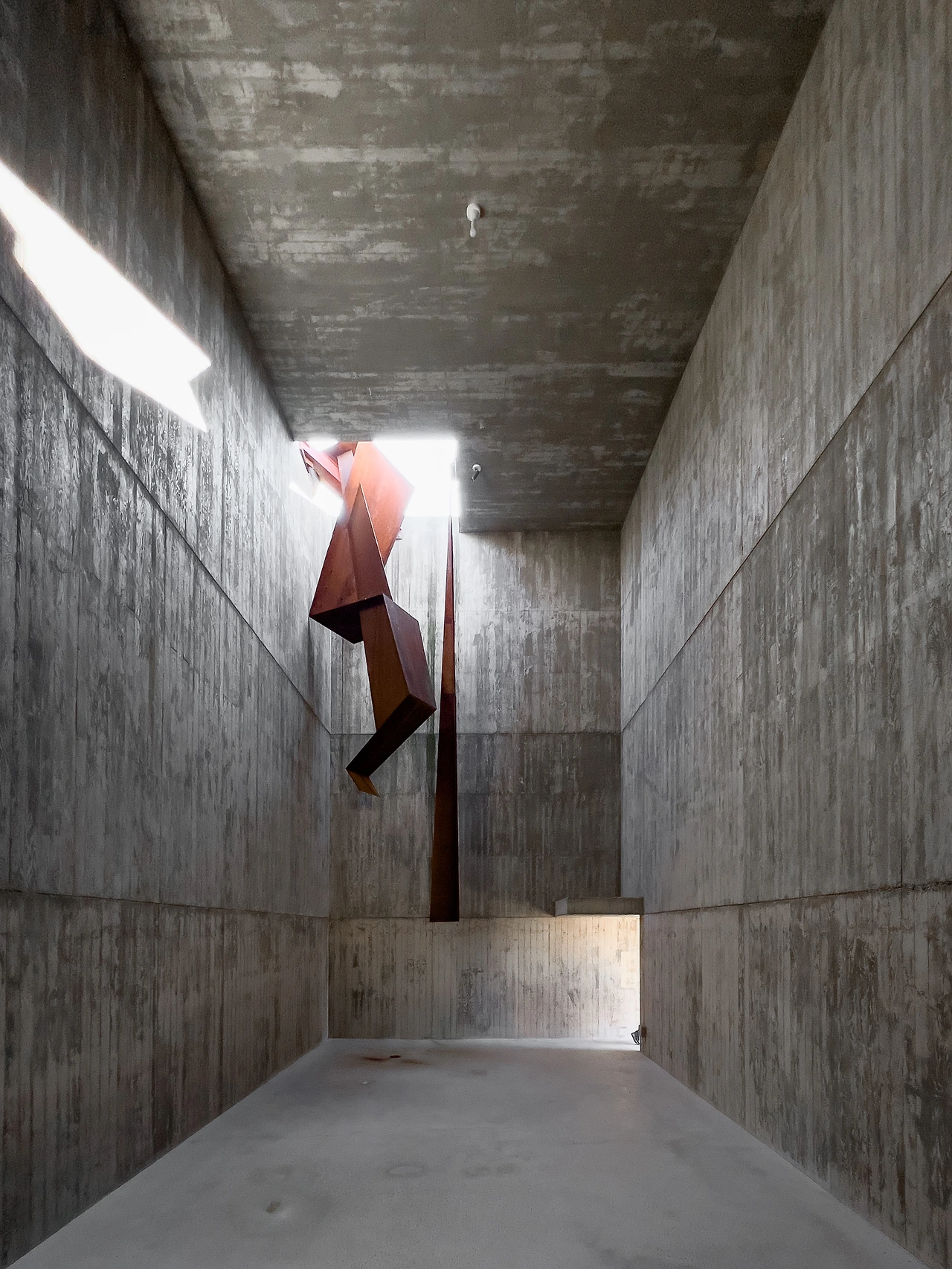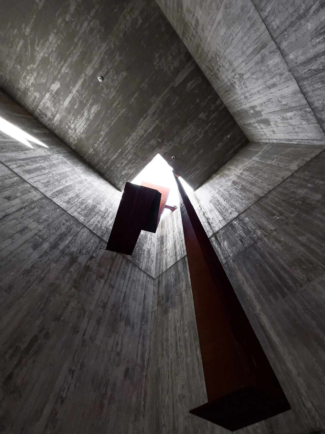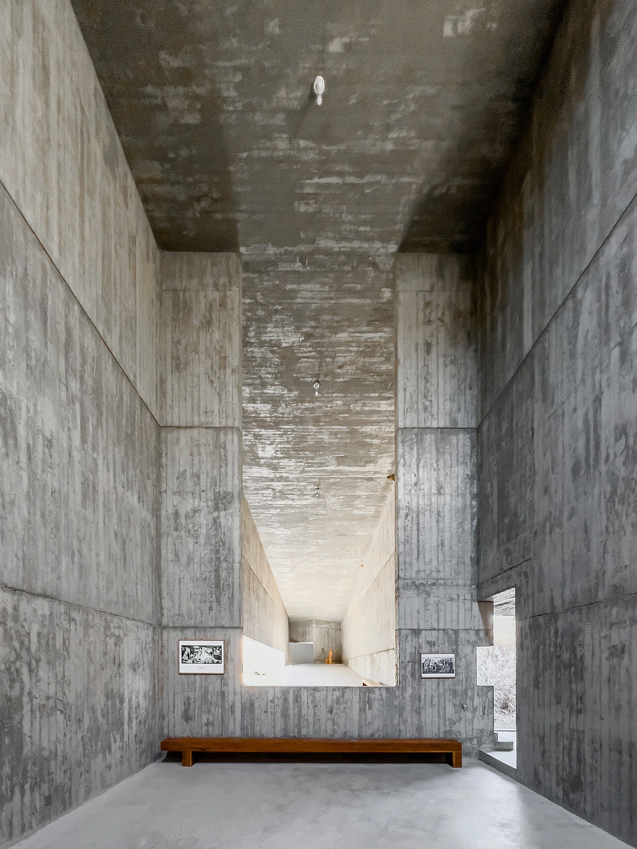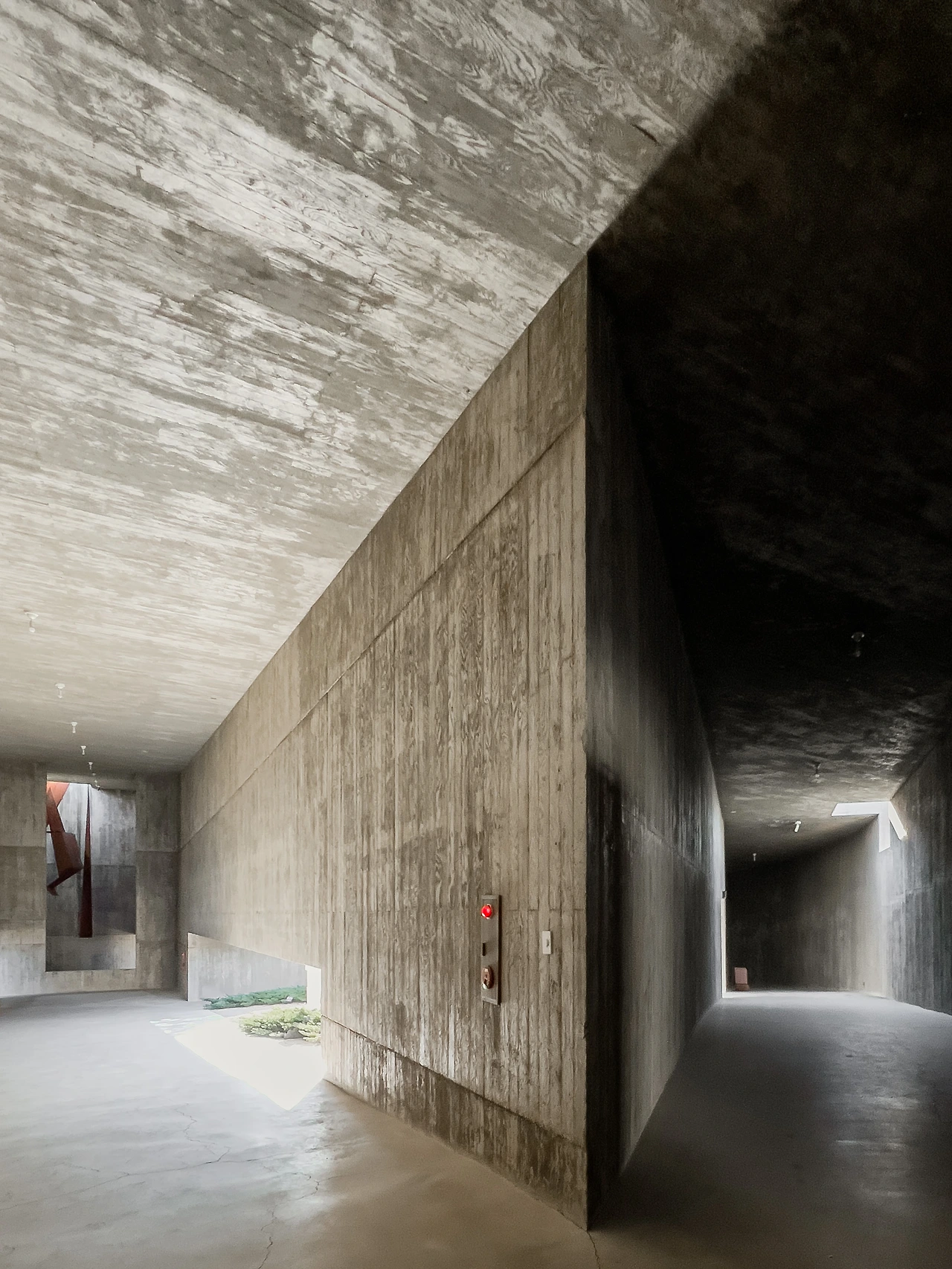 ‘사유인’의 눈높이에서 건물의 진입로는 주차장 같다. 점점 높아지는 콘크리트 벽은 주변의 시야를 가리고, 사람들을 어두운 동굴 속으로 인도한다. 이미 입구에서 별 기대를 하지 않았기에, 내부에서 경험하는 공간은 충격적이다(기대했어도 그 충격은 같았을 것이다). 산봉우리에서 시작해 내려가는 동선과 함께, 높아지는 공간의 높이는 극적이다. 여기에 두 갈래로 나뉘는 복도가 흑과 백의 대비로 또 한 번 충격을 준다. 대낮에 이게 가능한 일인가 하며 두 눈으로 보고 있음에도 의심이 사라지지 않는다.