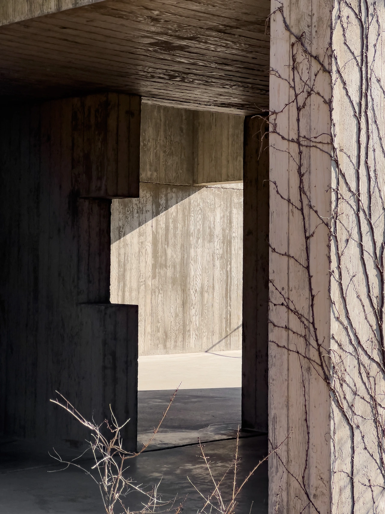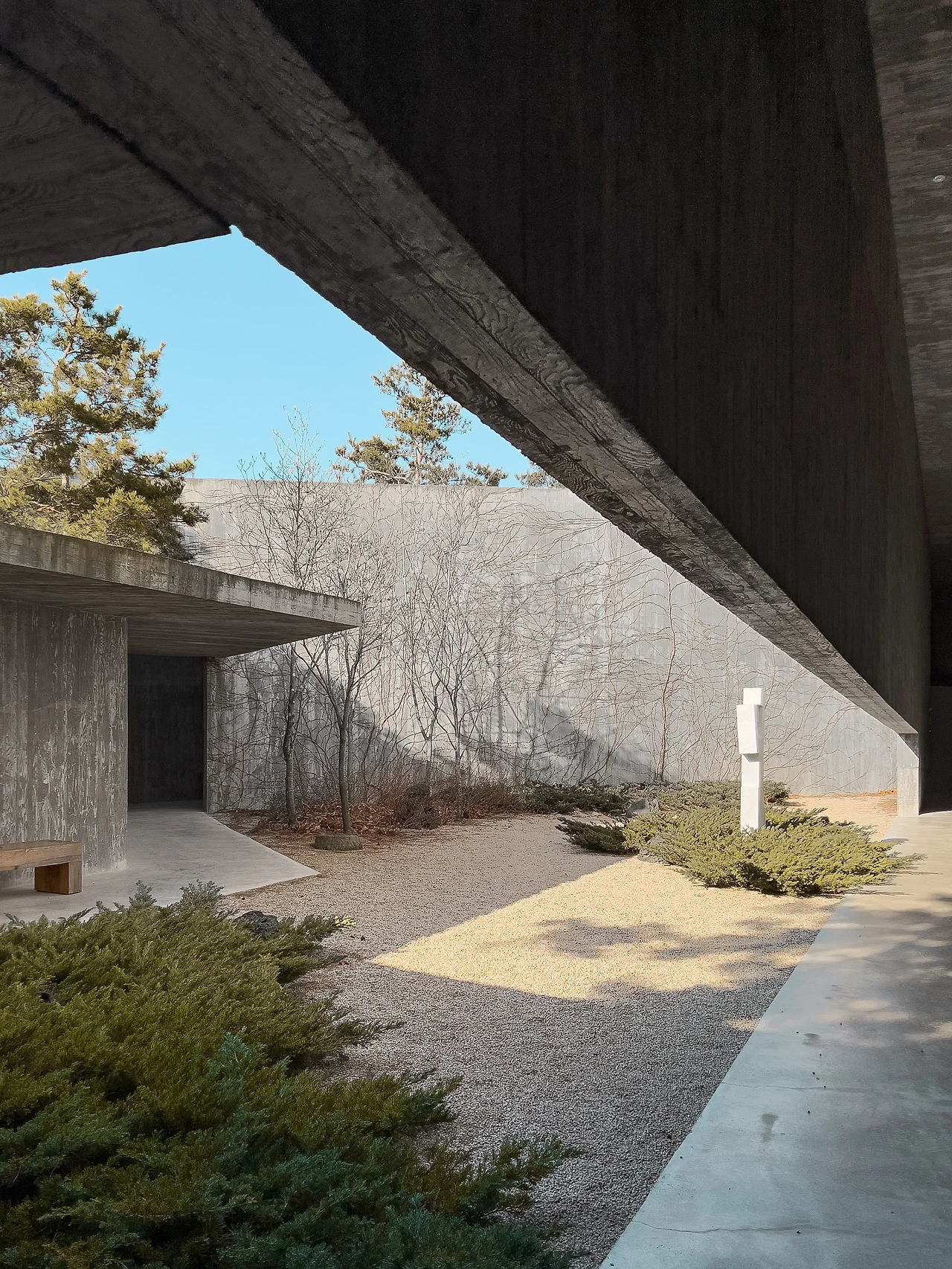 원래 이 건물은 스페인 마드리드에 지어질 건축물이었다. 얼핏 들은 내용으로 정확하진 않지만, 계획안만 남아있던 걸 건축주의 설득으로 건축가가 이곳, 사유원에 '소요헌'을 짓기로 했다고 한다. 당연히 지형과 만나면서 계획안이 일부 수정되었겠지만, 그렇지 않더라도 단언컨대 마드리드보다 우리나라 산속에 지어져야 했던 것은 분명하다. 두꺼운 콘크리트 벽으로 둘러진 공간에 사람의 발소리만이 정적을 깰 때, 무심코 등장하는 중정과 빛, 조형물과 경치는 우리나라만이 가진 산의 모습을 다시 보게 하기 때문이다.